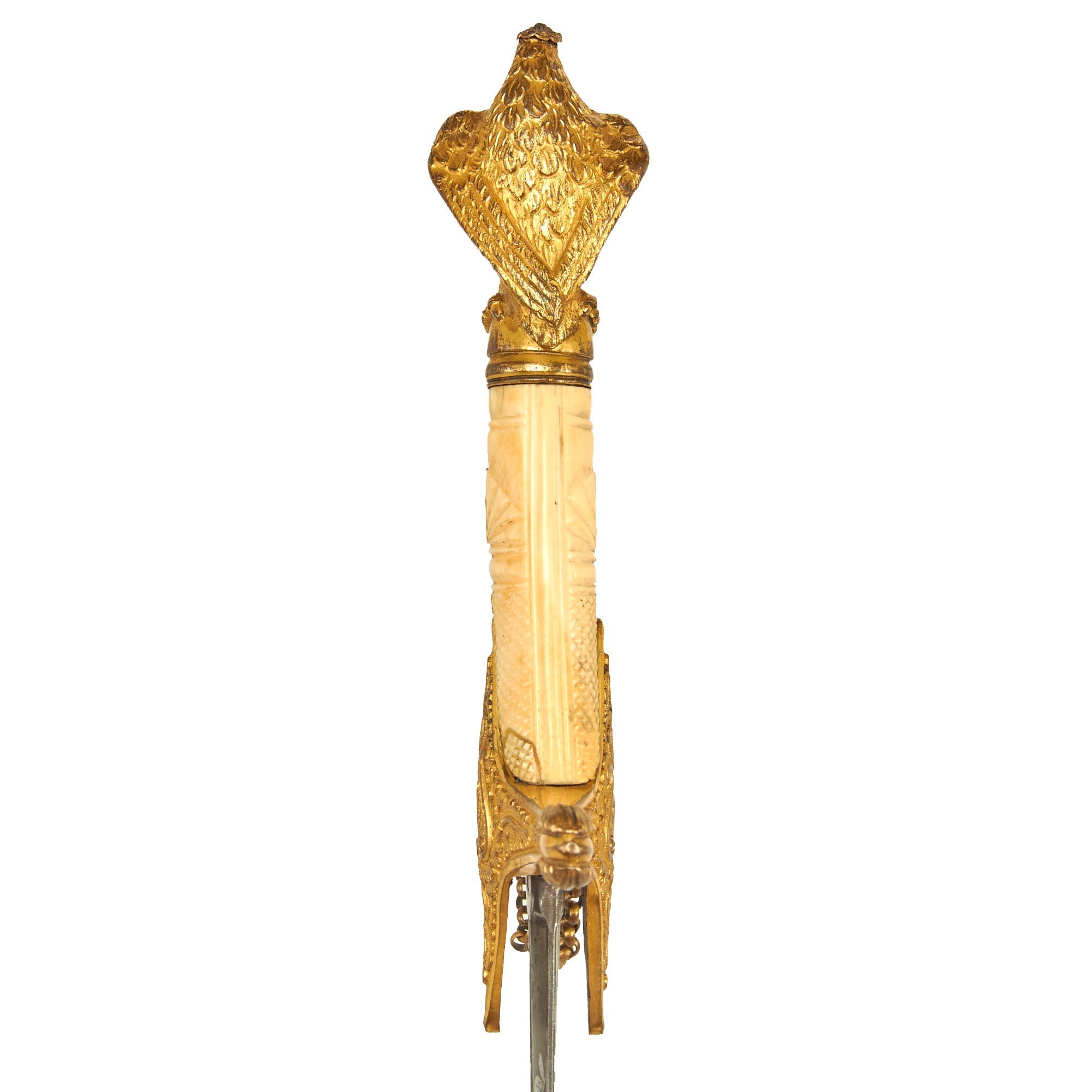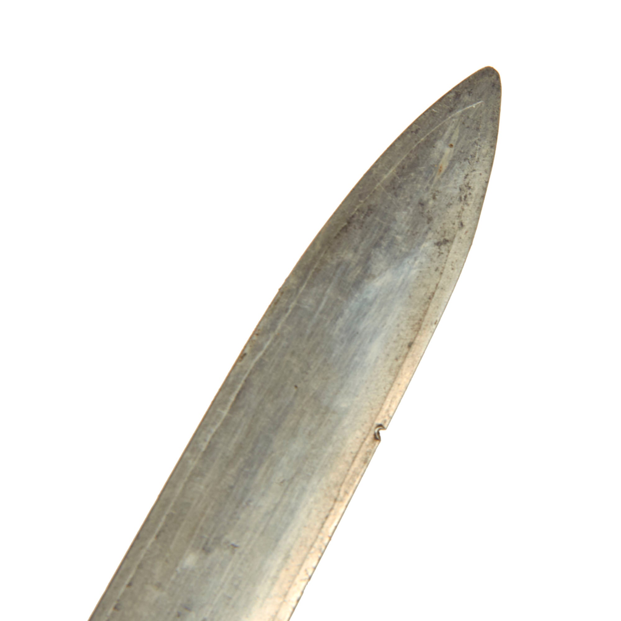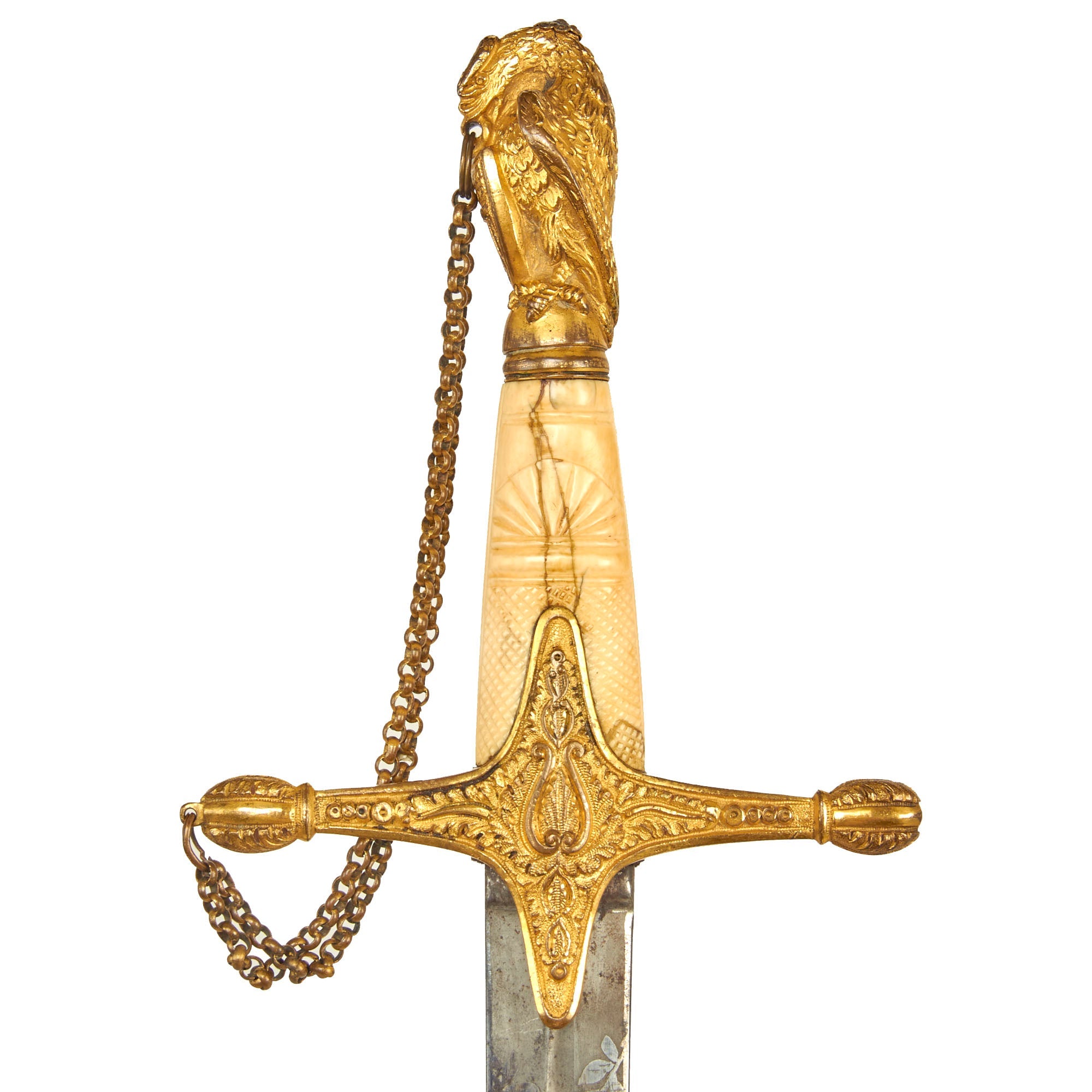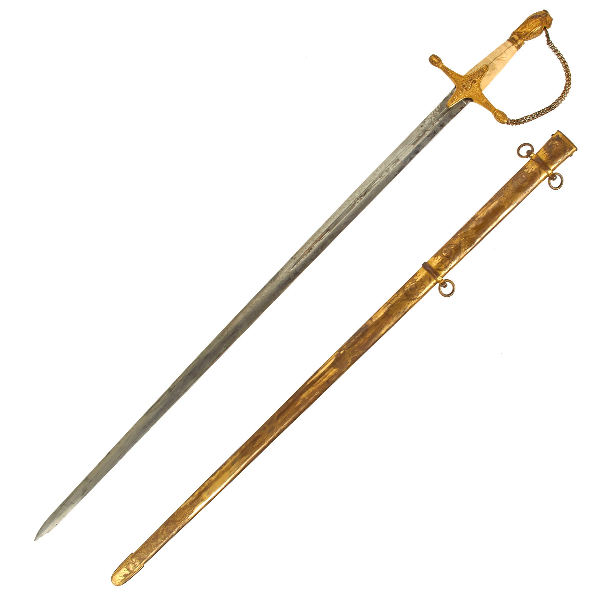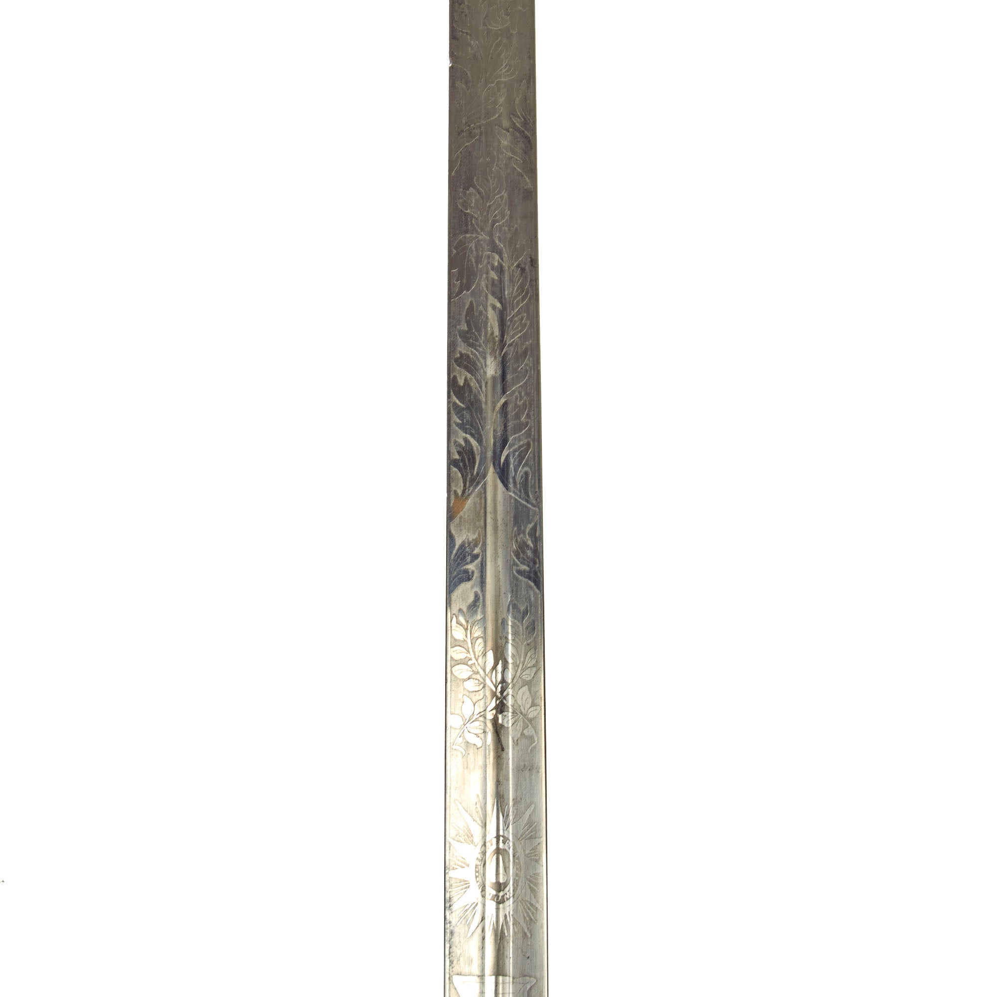 The blade is believed to be an 1834 pattern with a double-edge and thin central fuller that runs about a third of the blade The steel still retains some of its original shine, with good edge and point, and lightly frosted etching is somewhat Patriotic in nature.