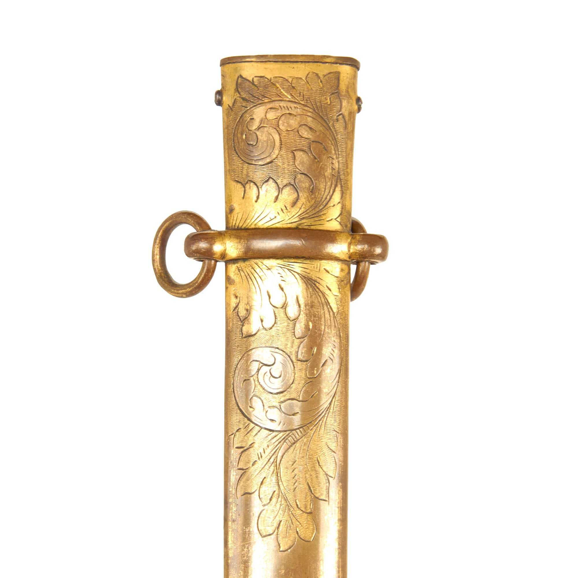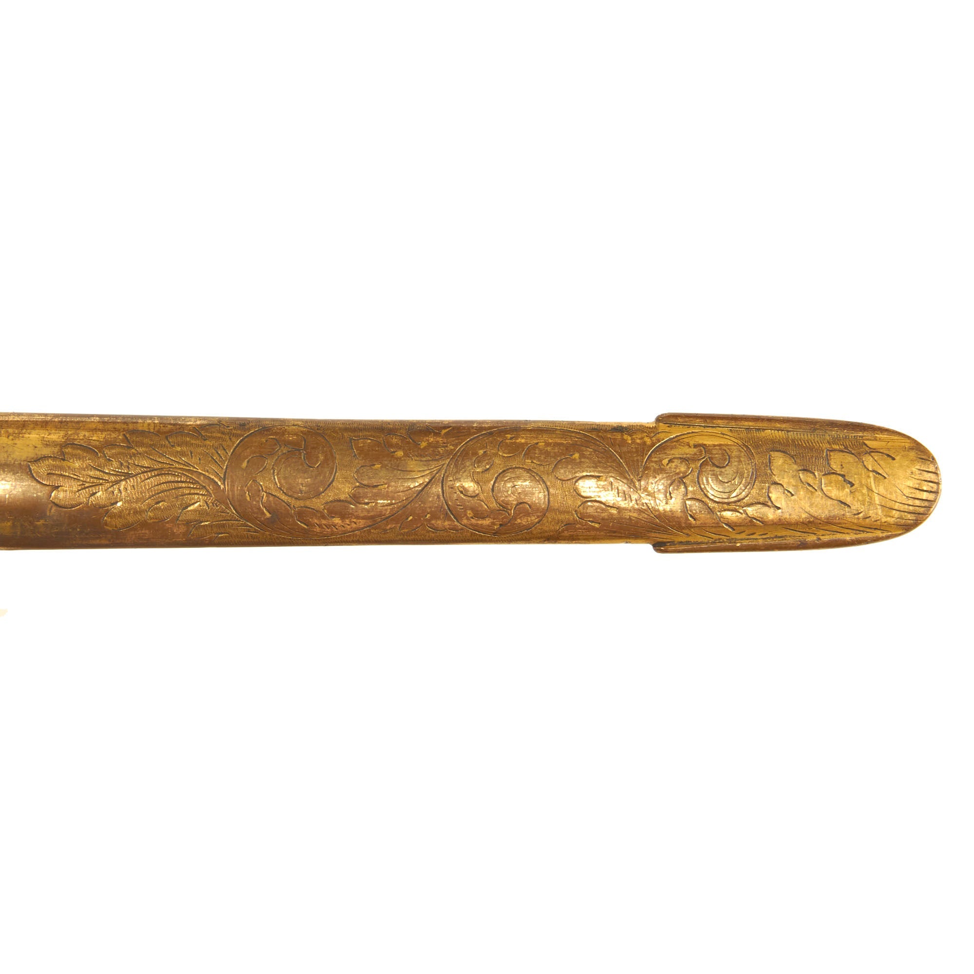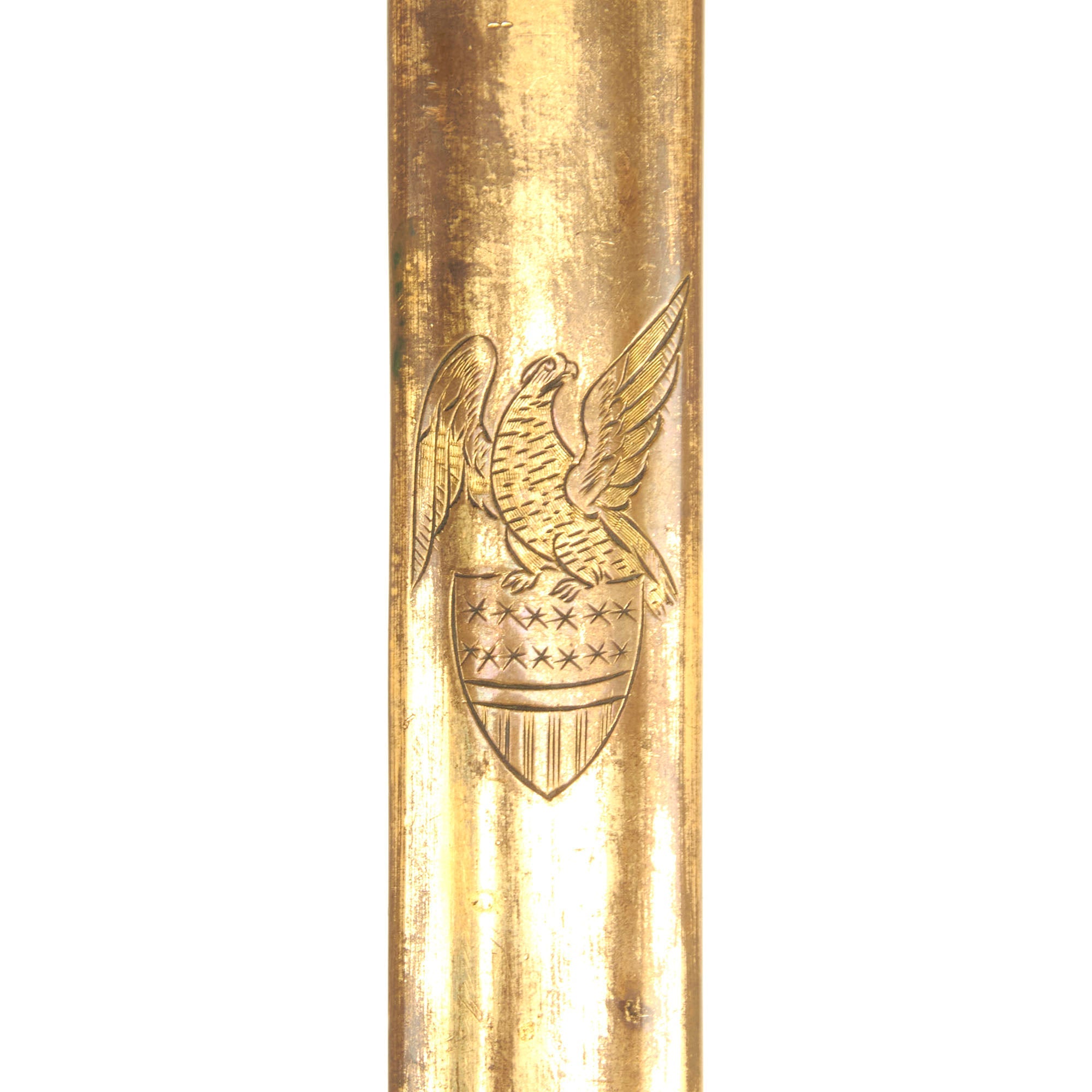 The scabbard is in wonderful condition and without any dents, bends or extensive damage. Just like the sword, the scabbard has retained much of the original gold gilt. There are floral designs etched into the scabbard as well as a lovely Eagle clutching an American flag shield.