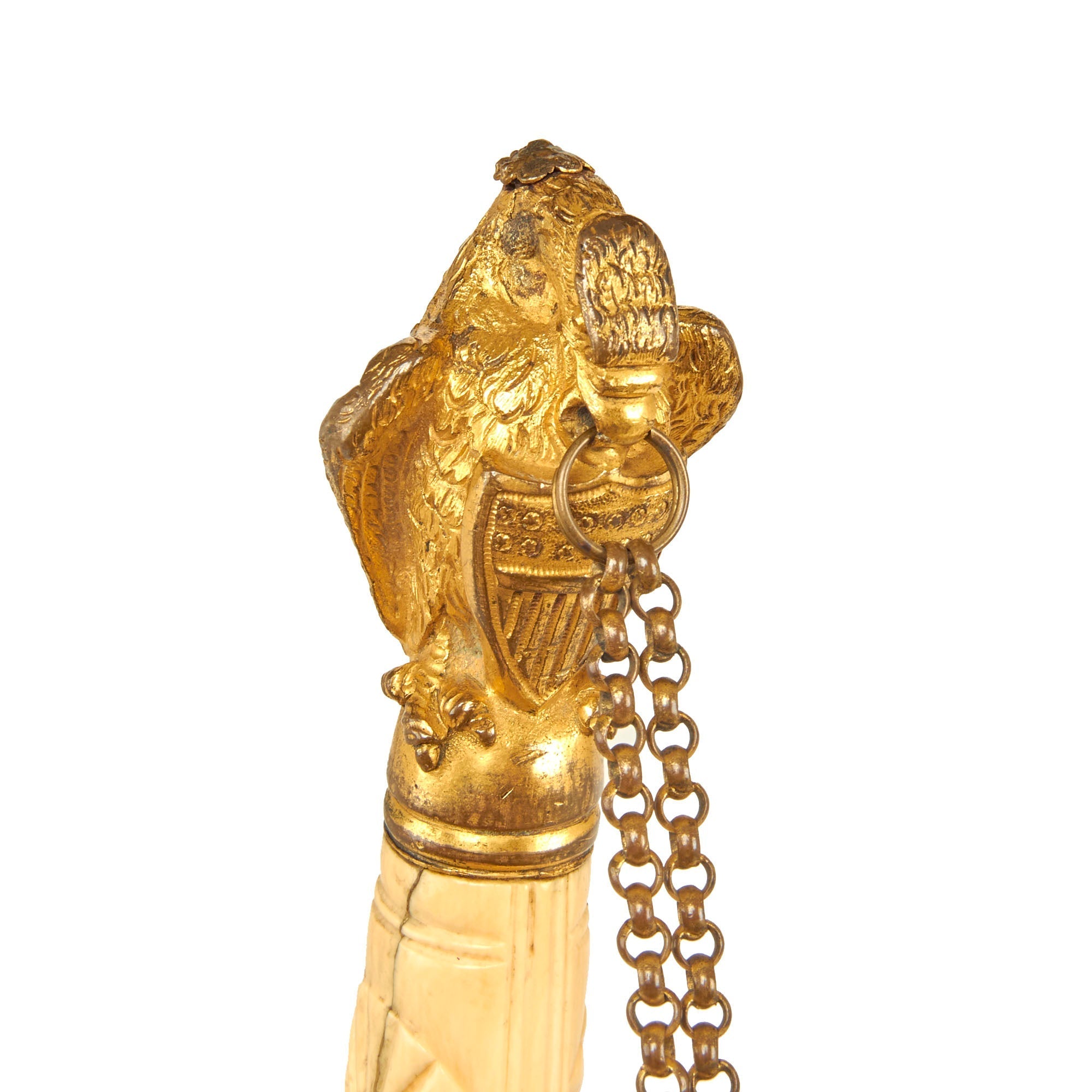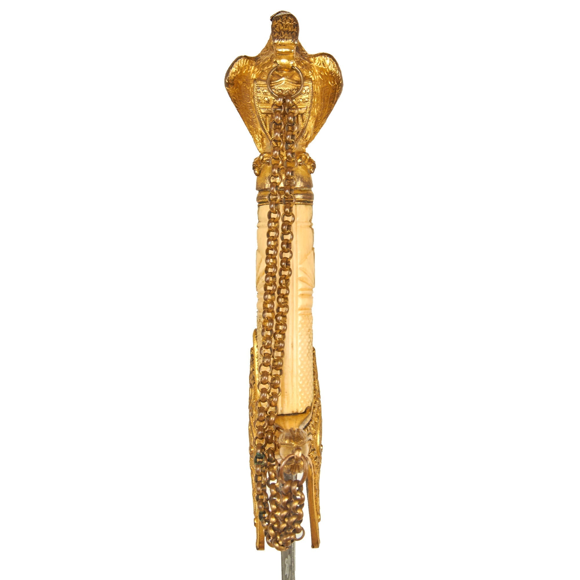 Swords of this design are pre-Civil War, rough estimated date circa 1830-1840. The cruciform-style brass crossguard and chappe is in good shape, with limited patina and much of the original gilt retained. The pommel is a cast of a perched American Eagle and holds one end of the double chains connected to the knuckle guard. The chains are somewhat tarnished from time and exposure.