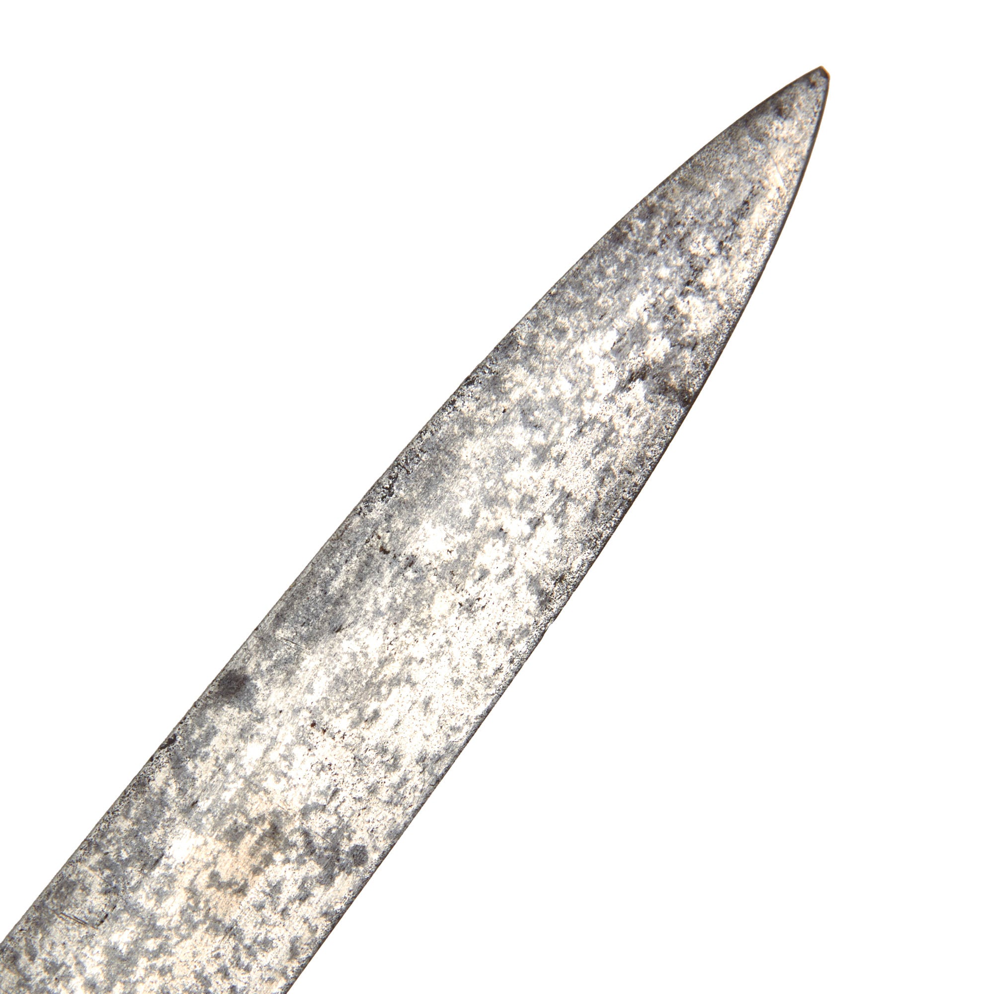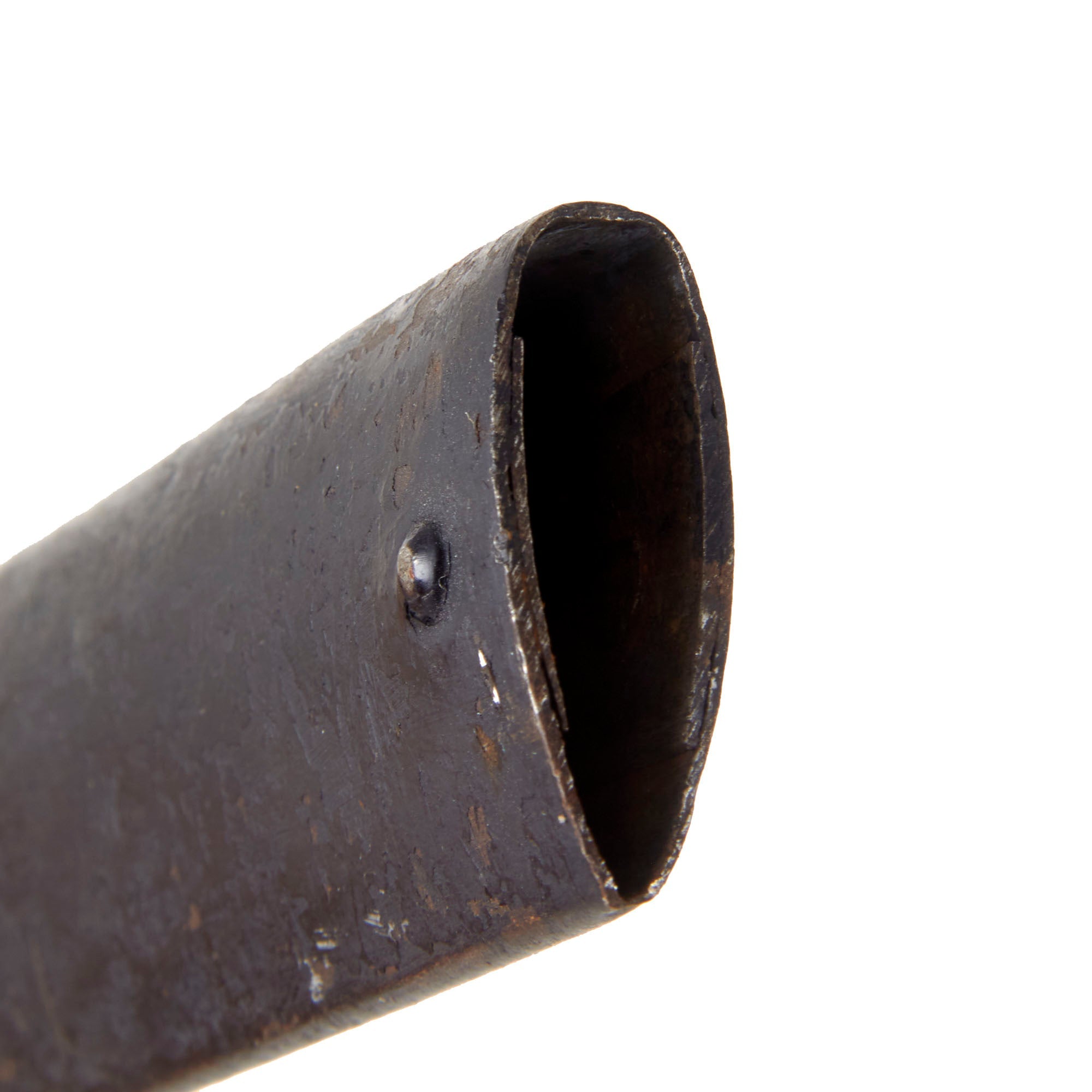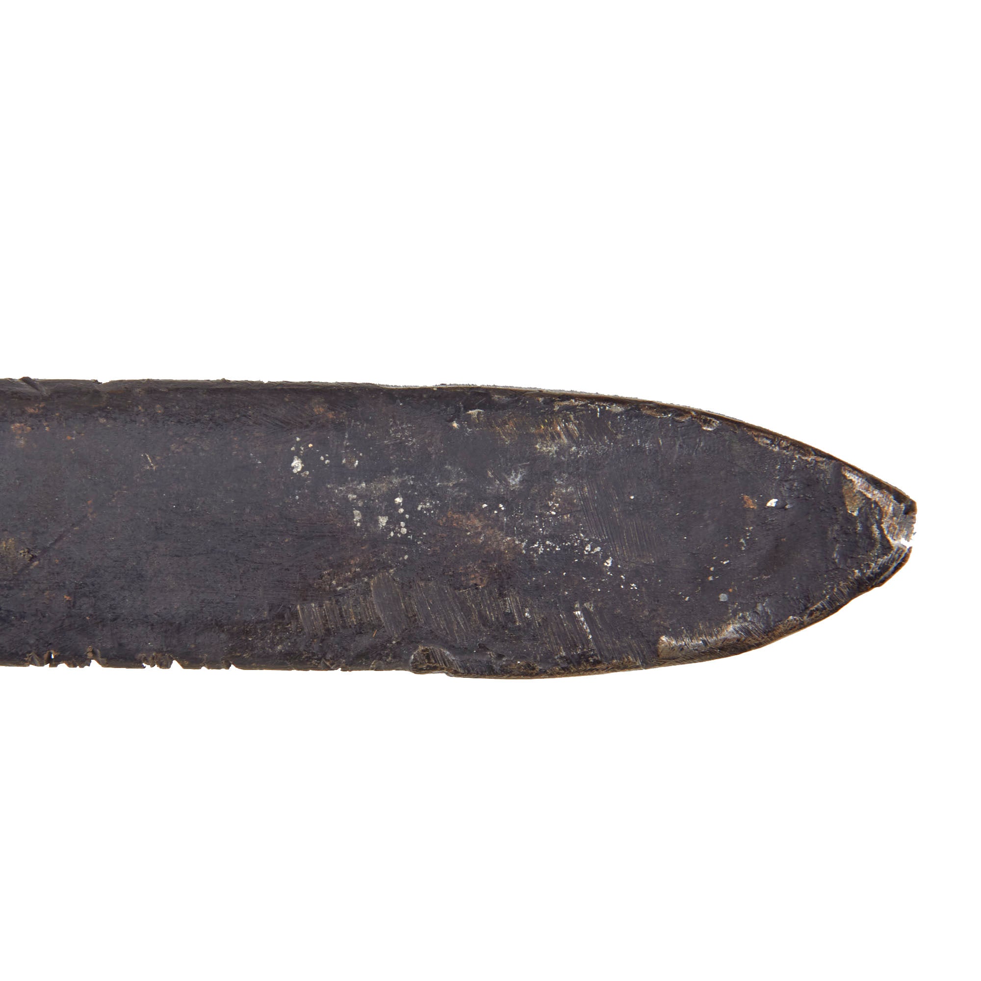 The 26” long iron scabbard has much or the original japanned black paint. Has a small iron stud or finial tightly set into an iron lozenge-shaped disc secured to the upper body of the scabbard. There is a heavy amount of nicks in the edges of the scabbard near the tip on one side, with some heavy denting and scratches.