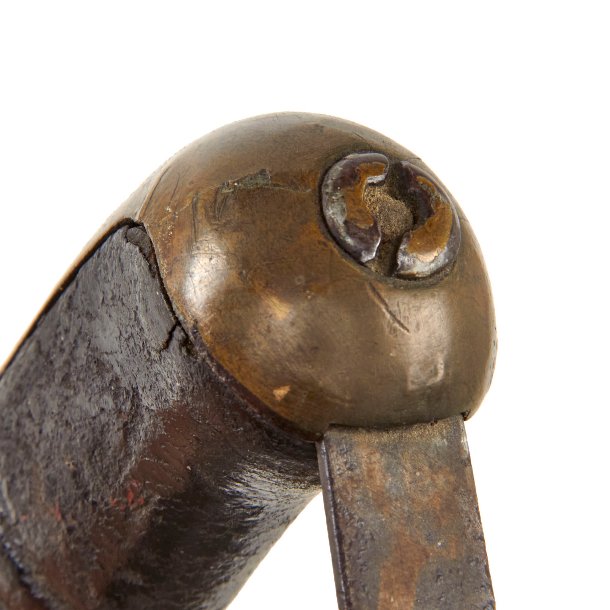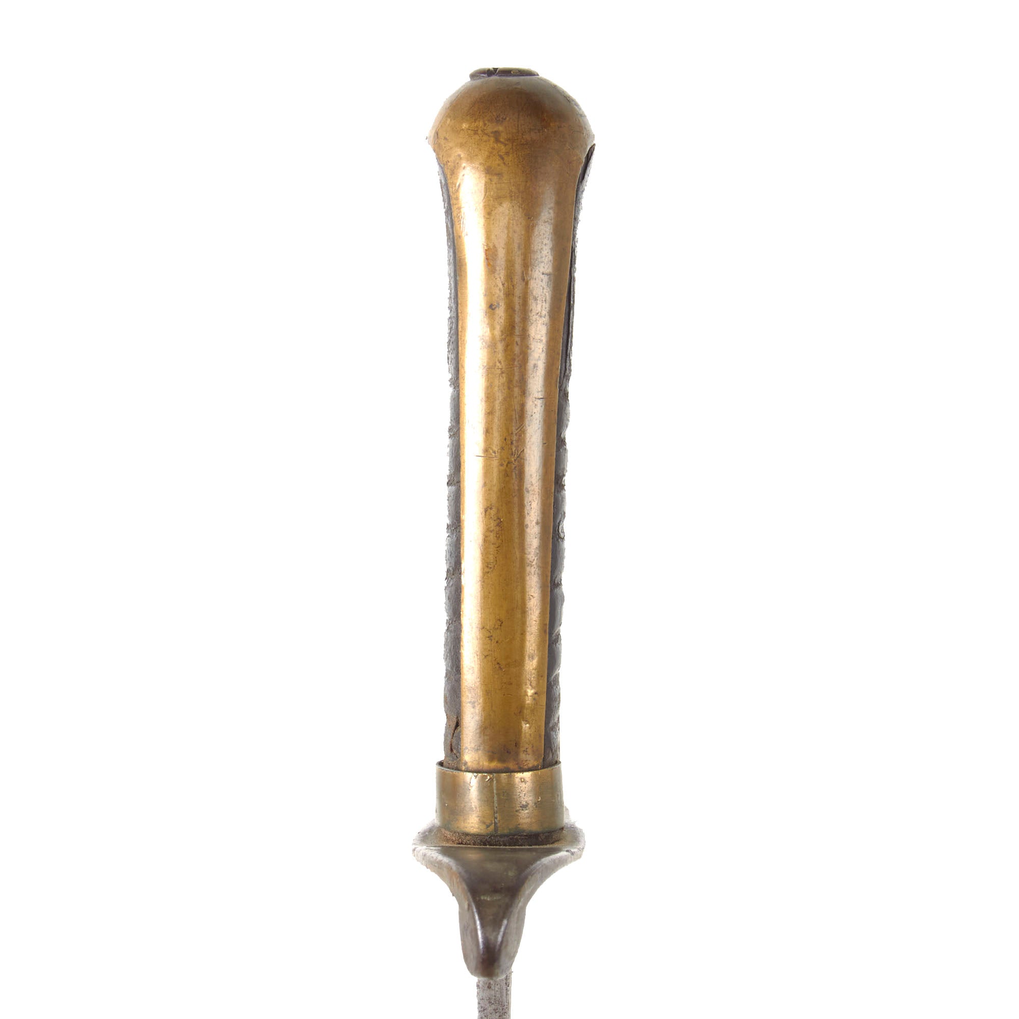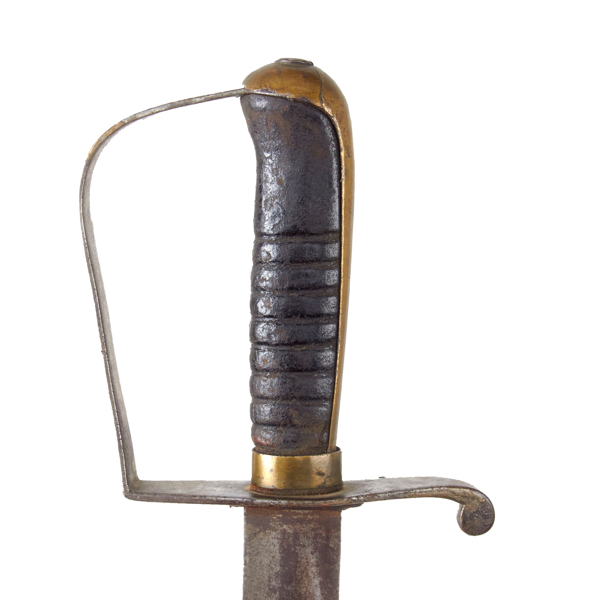 The P stands for Proved, and the L.S. is the inspector, Luther Sage. This example still retains the very scarce leather blade buffer, but it is weak and worn. The iron and brass hilt is still tight to the blade, and the leather-covered wood grip is in great condition for its age without any significant loss. The P-type knucklebow joins a convex pommel that almost resembles a bird’s head shape.