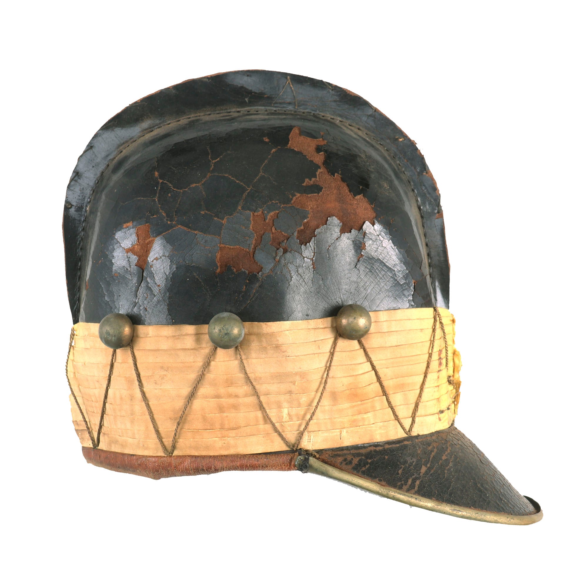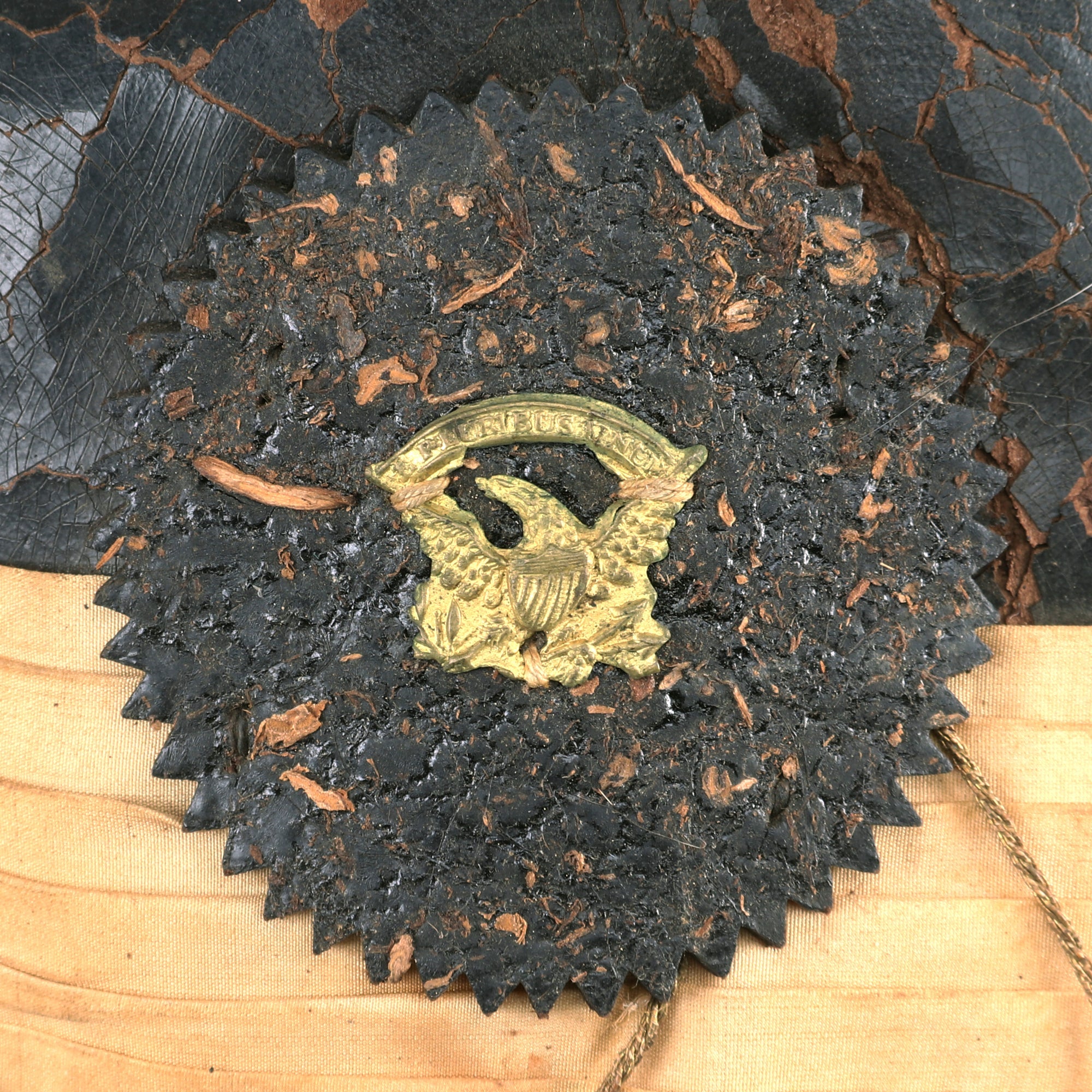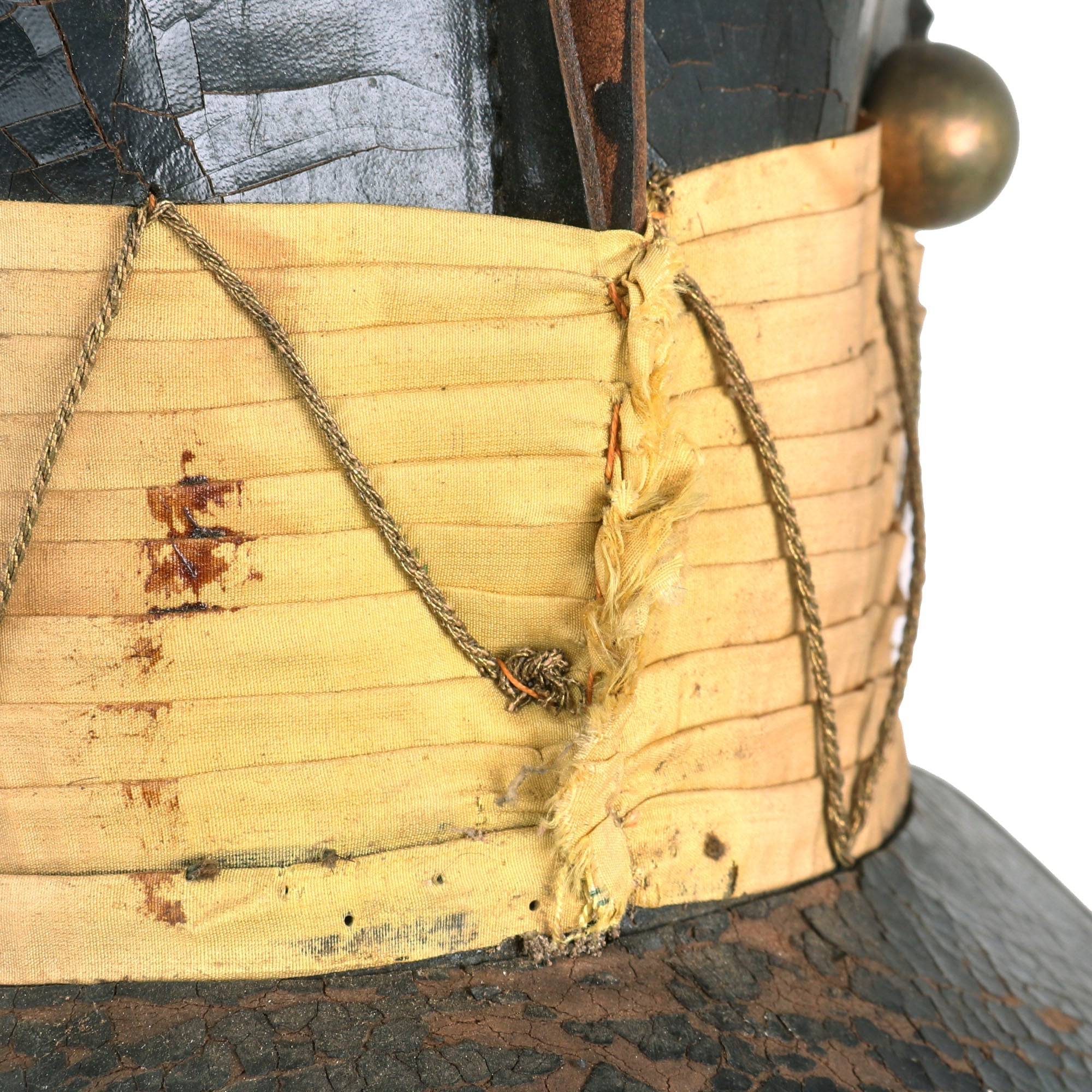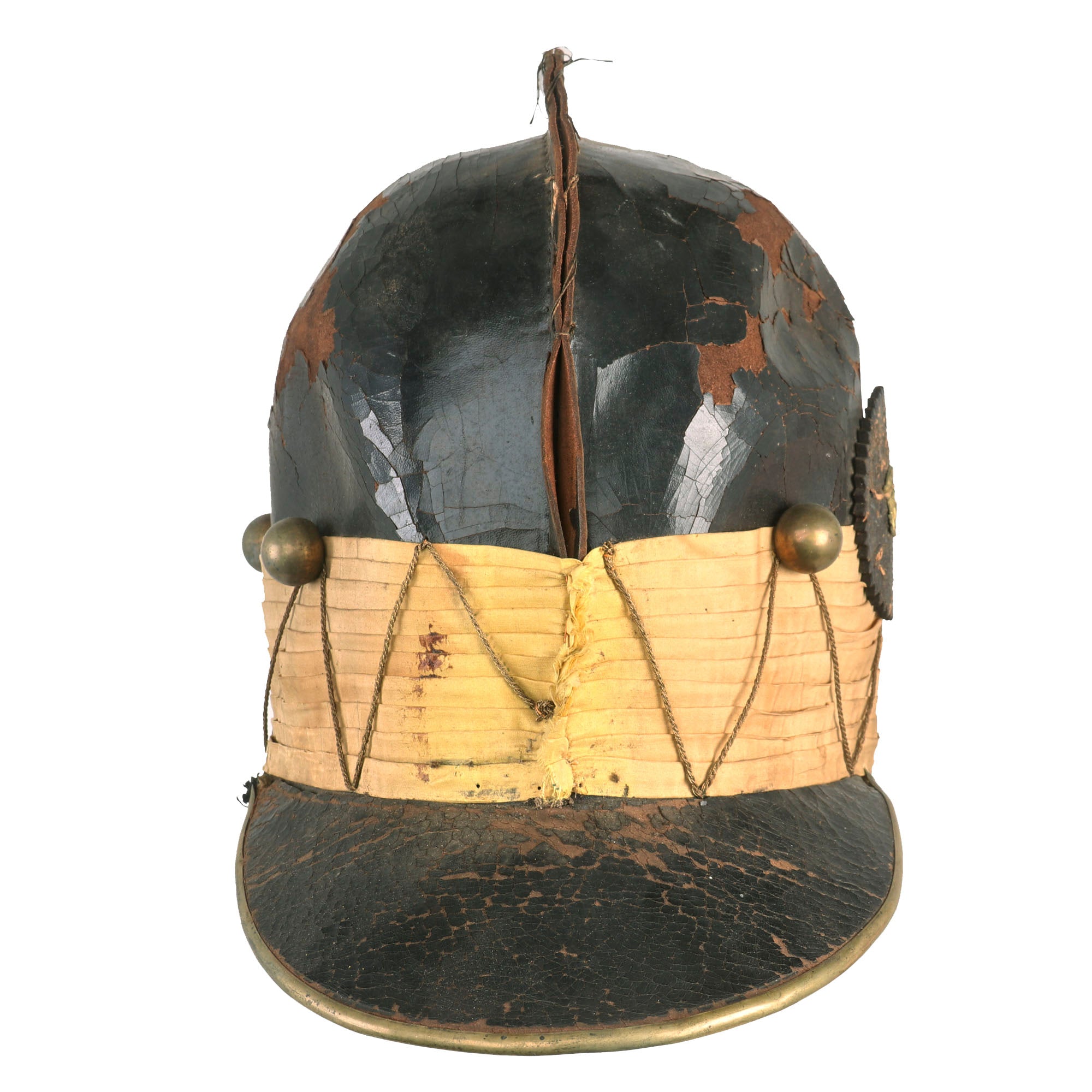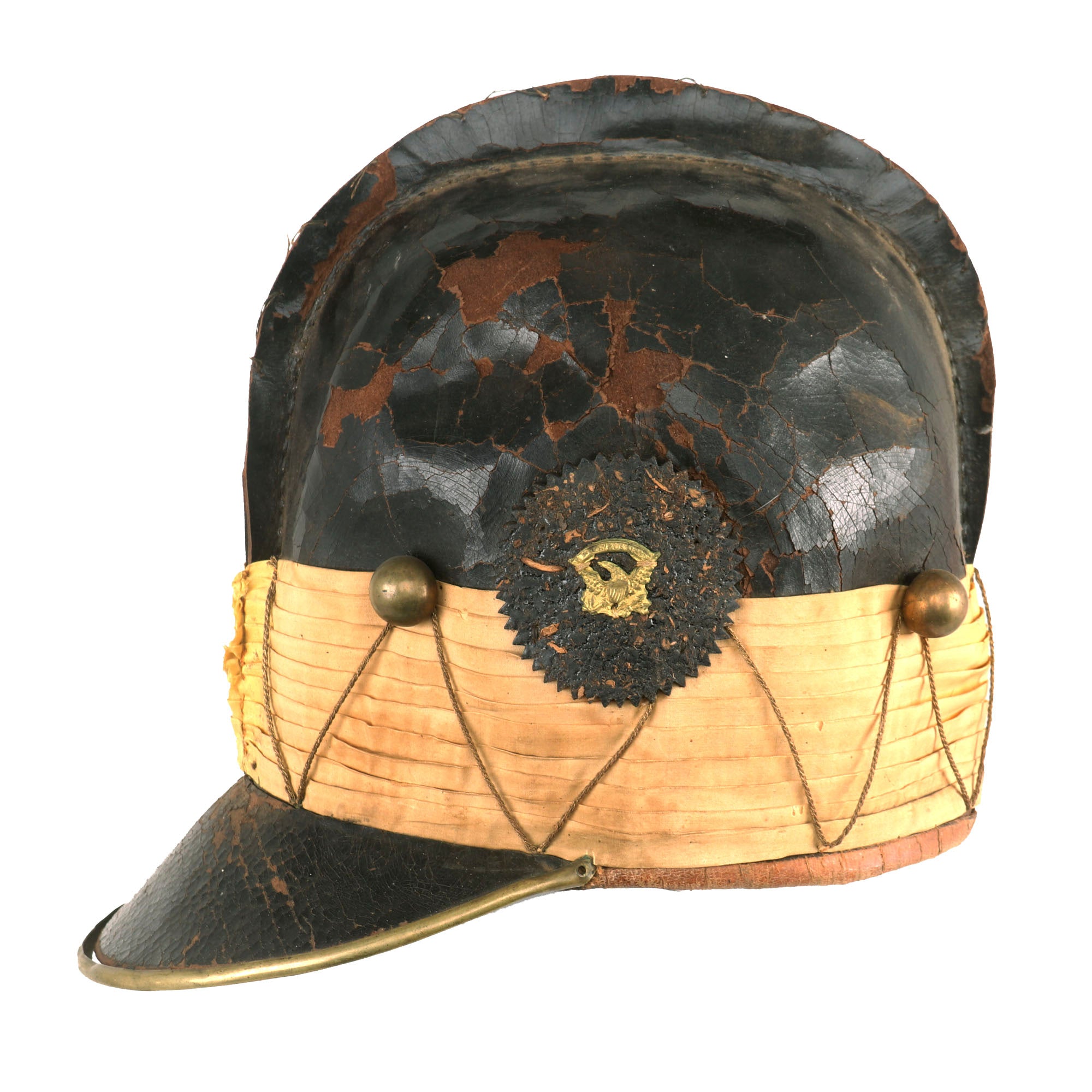 The overall condition is excellent considering the age of the helmet. The helmet is constructed of thick boiled leather with an enamel finish. The helmet is fitted with a yellow (now faded) decorative yellow silk band, adorned with five brass ball buttons, each connected to one another with a “zig zag” pattern gold bullion rope. The front visor is reinforced with brass edging which is still held firmly in place. The left side of the helmet features a “starburst” pattern cockade, with a brass federal eagle affixed to the center. We believe that there was likely a bearskin ruff, or possibly a thin brass reinforcement comb which ran from the front of the helmet to the back. However, we can only speculate.