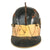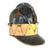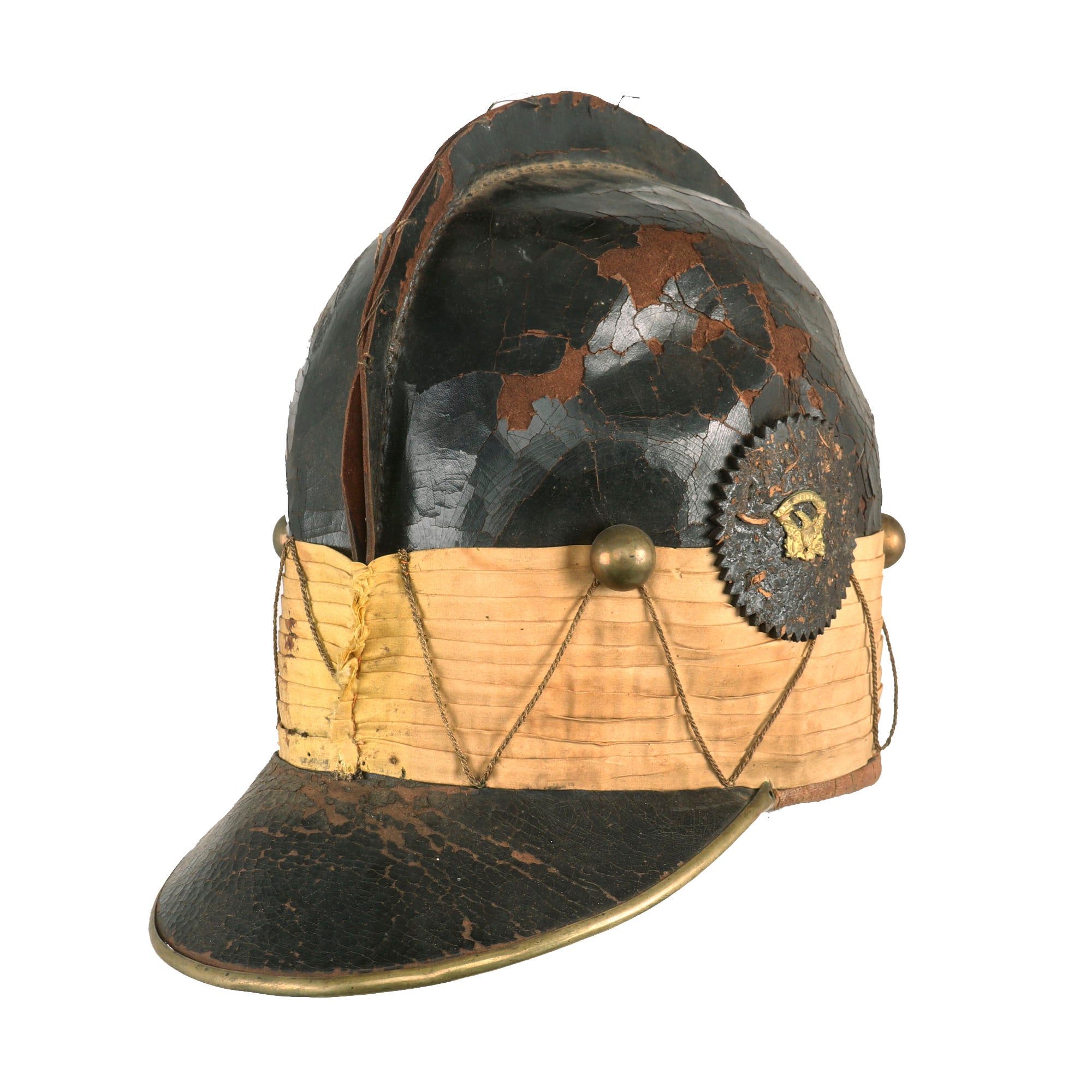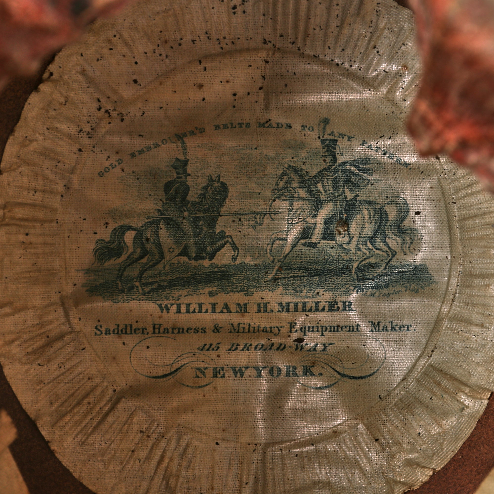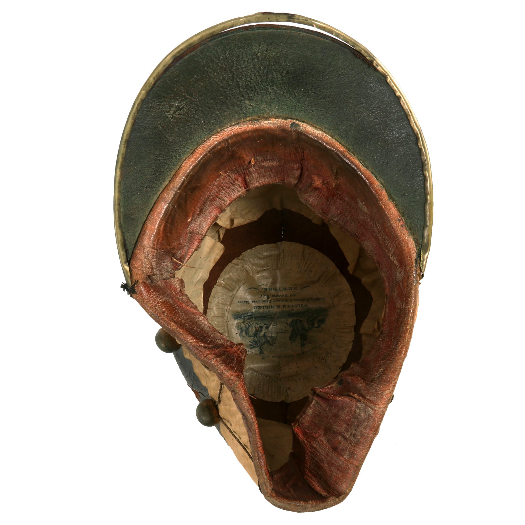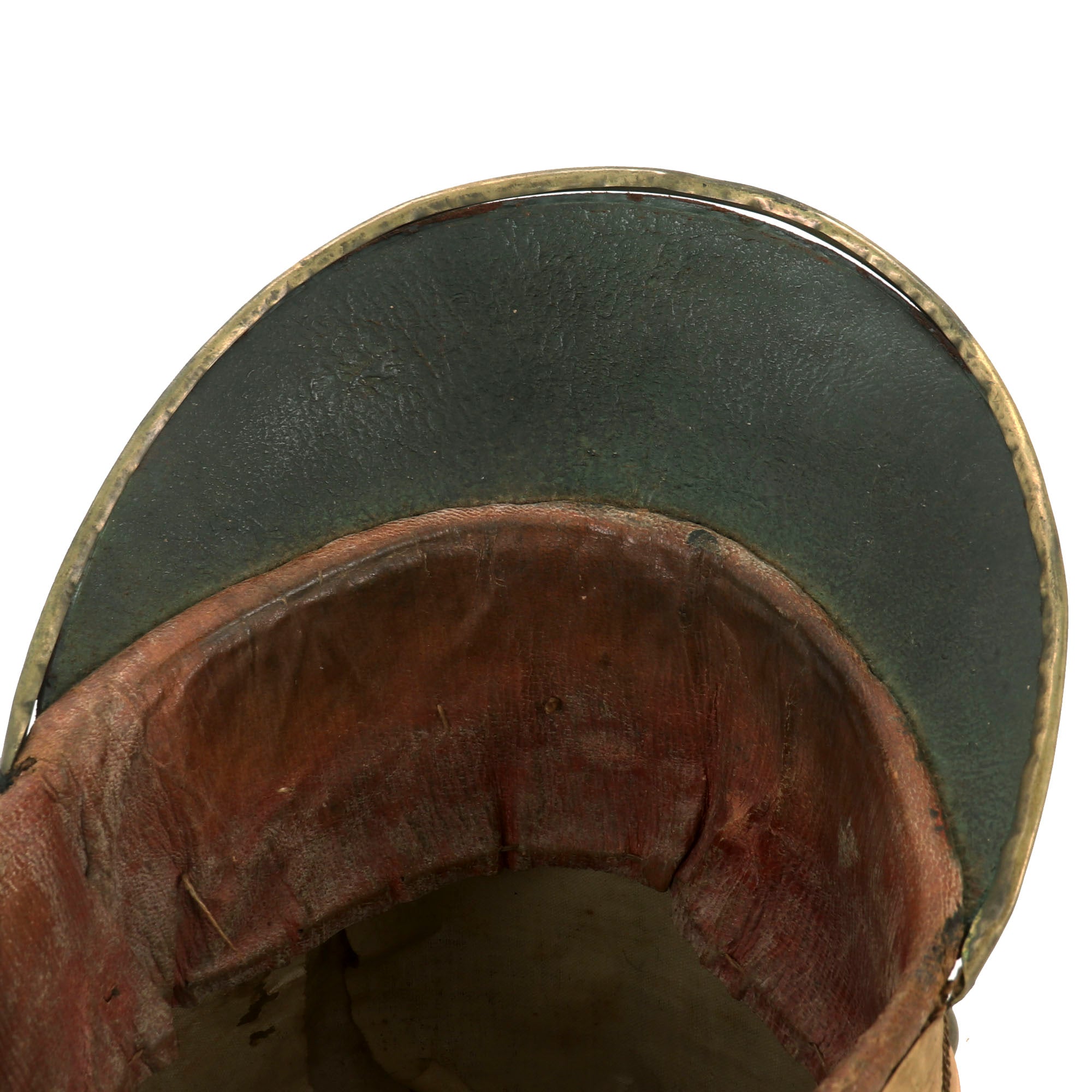 The overall condition is excellent considering the age of the helmet. The helmet is constructed of thick boiled leather with an enamel finish. The helmet is fitted with a yellow (now faded) decorative yellow silk band, adorned with five brass ball buttons, each connected to one another with a “zig zag” pattern gold bullion rope. The front visor is reinforced with brass edging which is still held firmly in place. The left side of the helmet features a “starburst” pattern cockade, with a brass federal eagle affixed to the center. We believe that there was likely a bearskin ruff, or possibly a thin brass reinforcement comb which ran from the front of the helmet to the back. However, we can only speculate.