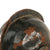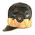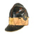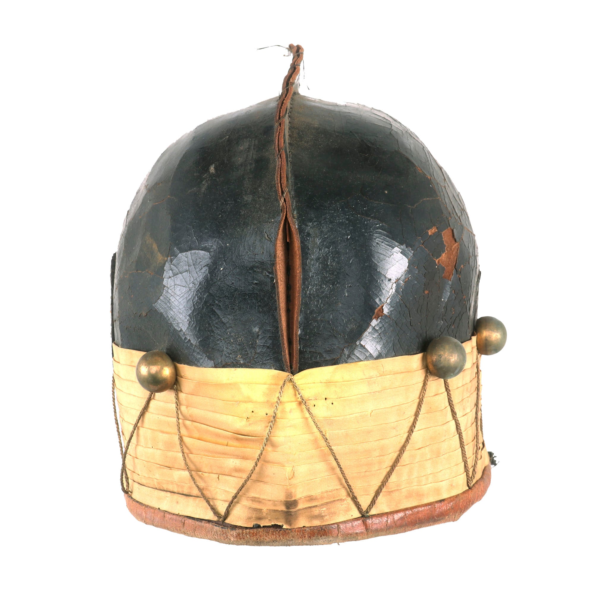 Overall shape is mostly intact, however, we would recommend displaying the helmet with a form, as one side of the helmet has warped in from being stored in a trunk with other items for eons. The helmet has the typical crazing and expected period commensurate wear to the tarred black finish over pressed leather. The height is approximately 8 1/2".