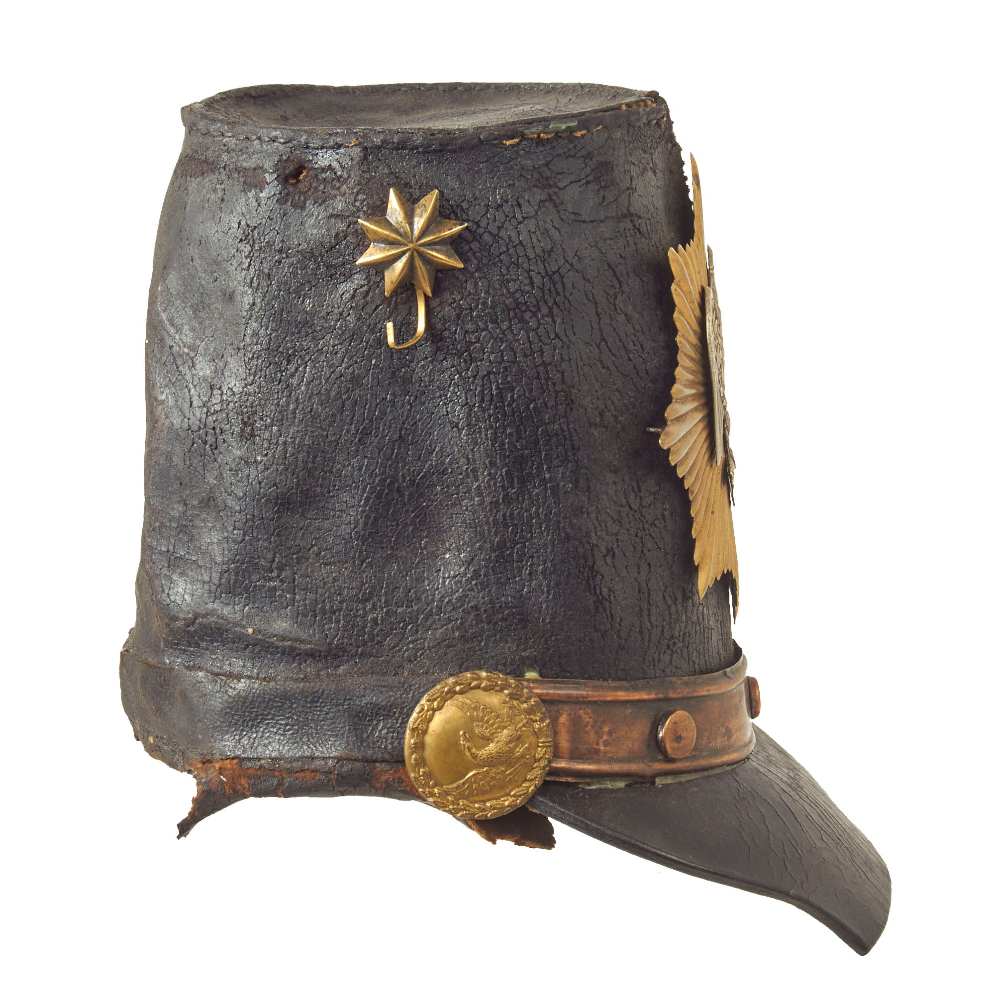 This shako, as previously stated, may have been worn by the Massachusetts or New York State Dragoons. The front sunburst pattern insignia was typically worn by dragoon units starting in 1833. When the dragoons returned to the Army in 1833, their cap device was described as "a gilt star, silver eagle ... the star to be worn in front." An 8-pointed, sunburst-type star, this plate is struck in brass and has a superimposed eagle that is struck in brass and silvered. The eagle is basically the Napoleonic type adopted by the British after the Battle of Waterloo and altered by omitting the lightning in the talons and adding a wreath to the breast. Plain wire fasteners are soldered to the back though this one is retained by leather wedges.
