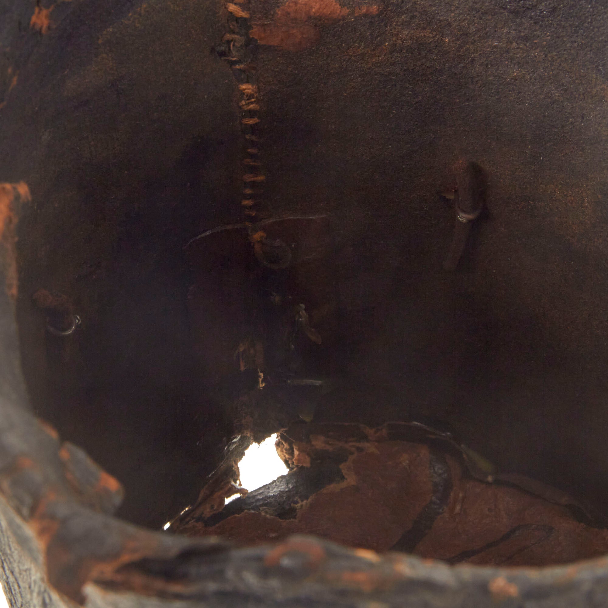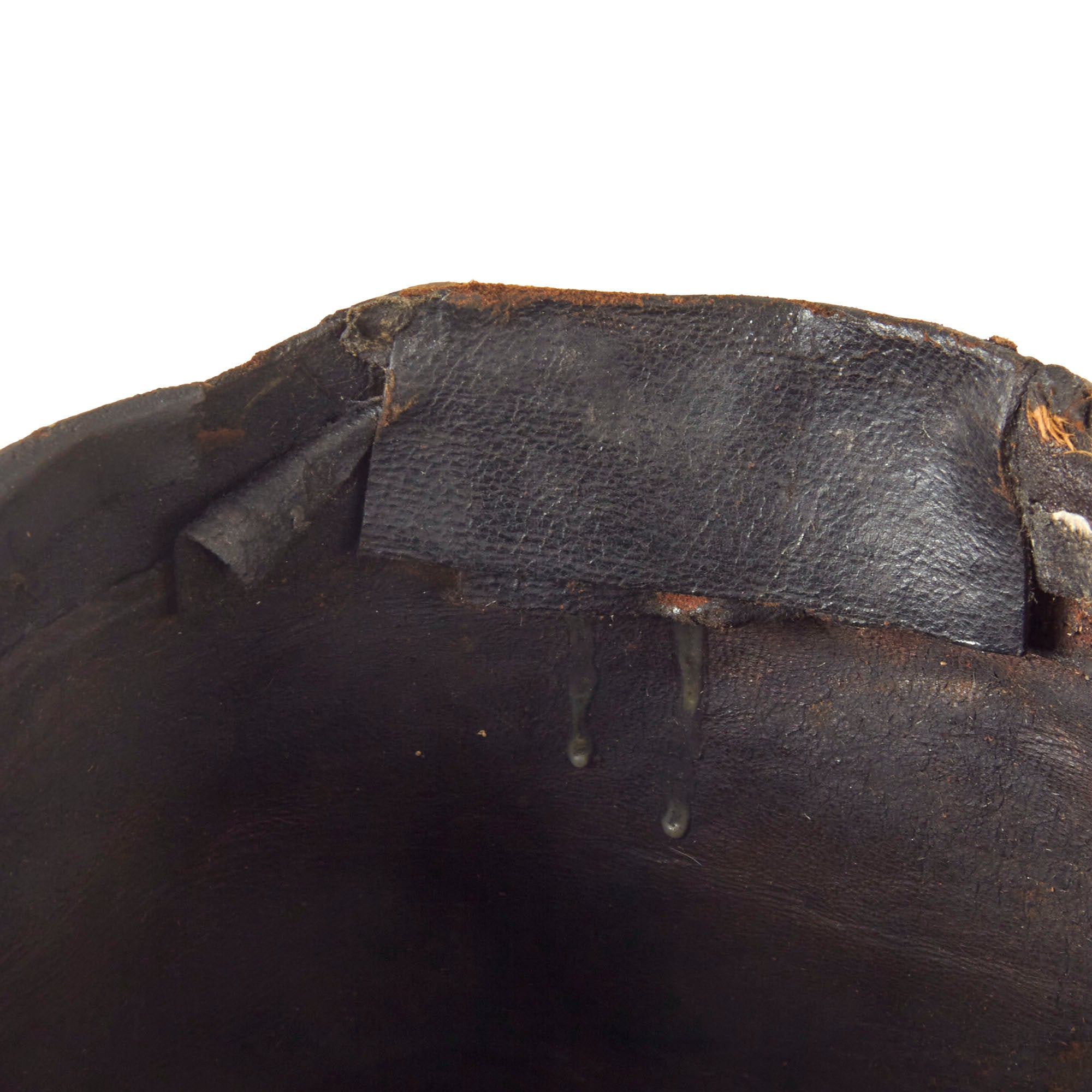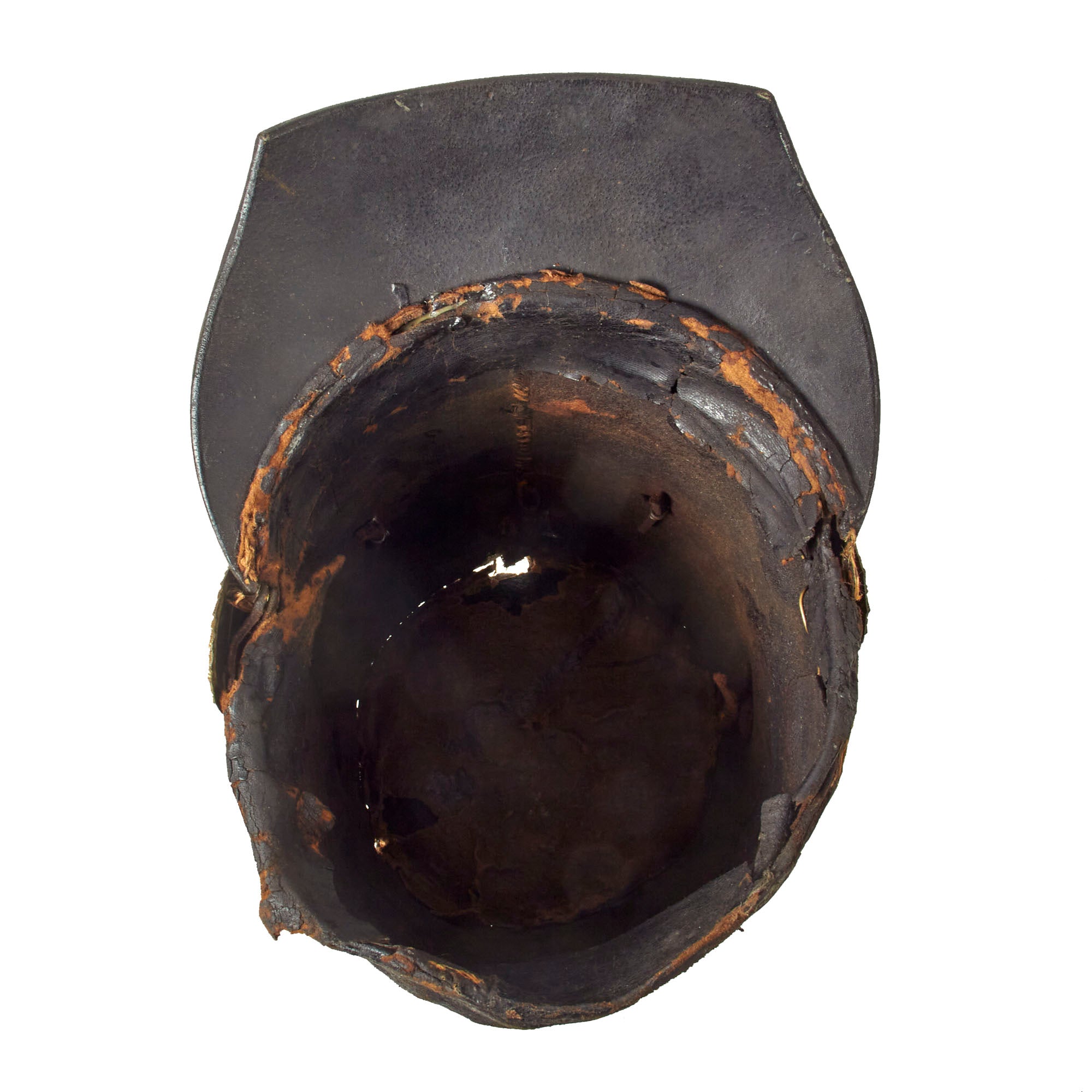 Overall good condition, with body showing some heat shrinkage and dents typical of nearly 200 year old leather. Tarred finish is flaking in some spots and there is some stitching loss and holes present. Given that the shako is nearly 200 years old it is in fantastic condition!