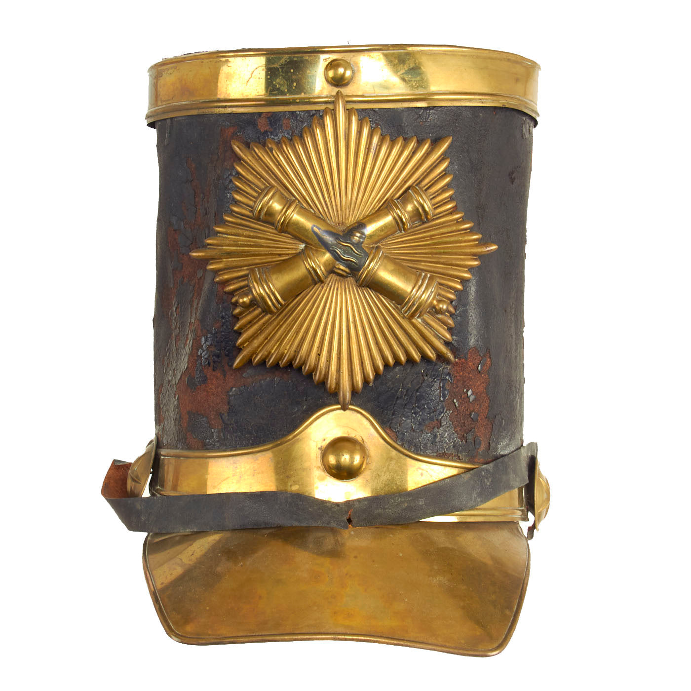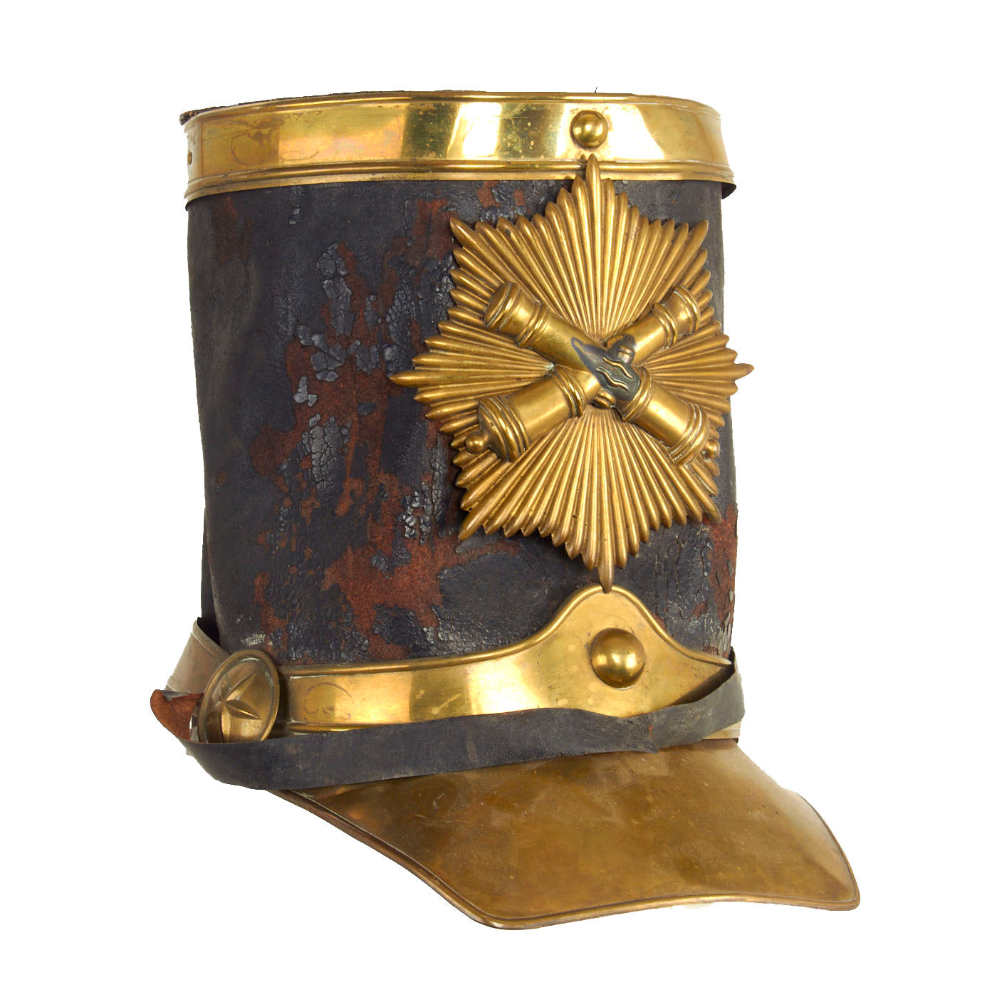 Original Item: Only One Available. This is a fantastic example of early Artillery Shako which was worn from the 1830 to early 1850s. The design and appearance leads us to believe that this cap would have been born by an Artilleryman from either the New York or Massachusetts state militia. A shako is a tall, cylindrical military cap, usually with a visor, and sometimes tapered at the top. It is usually adorned with an ornamental plate or badge on the front, metallic or otherwise; and often has a feather, plume or pompom attached at the top.