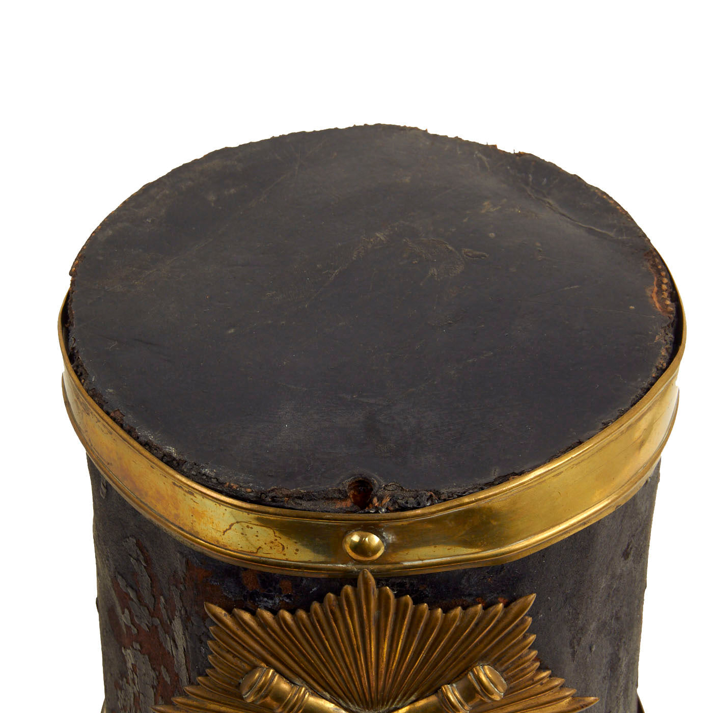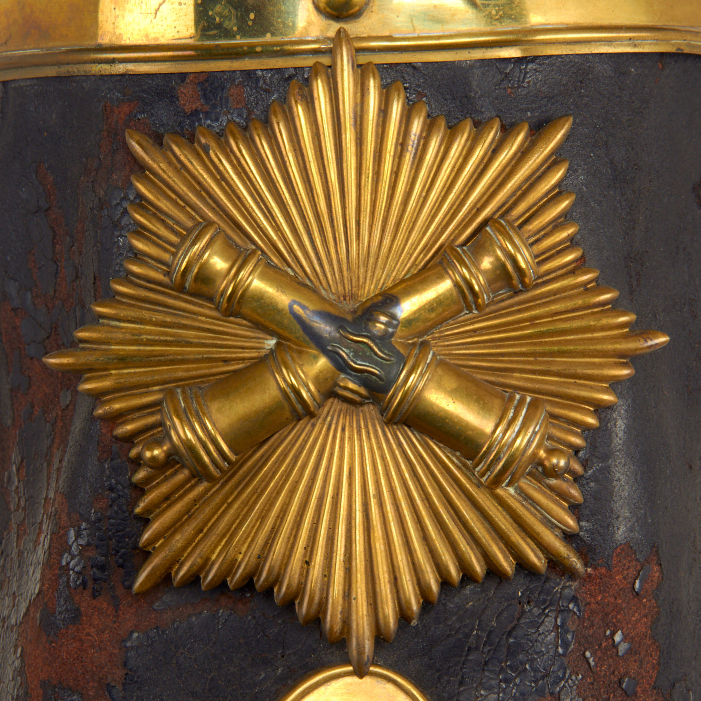 This shako, as previously stated, may have been worn by the Massachusetts or New York State militia artillery. The front sunburst pattern insignia was typically worn by dragoon units starting in 1833 with an eagle in place of the crossed cannons. Related insignia are illustrated in Smithsonian Institution Bulletin No. 269 (pp. 32-33). Similar shako body example with an infantry front plate is in the collections of the New York Historical Society Library and Museum. This example retains all of its original brass hardware, sweatband, and chinstrap (broken but present). The "gilt cross cannons" device was prescribed for artillery in the 1834 regulations. Struck in sheet brass of medium thickness, the superimposed cannon has trunnions and dolphins visible.