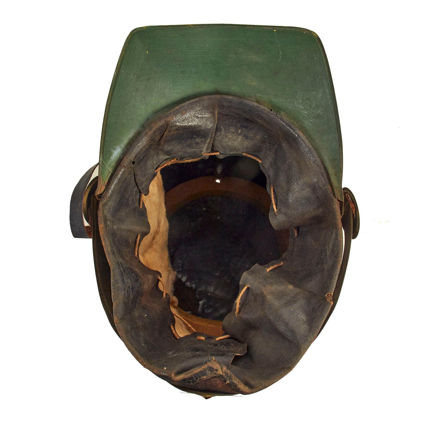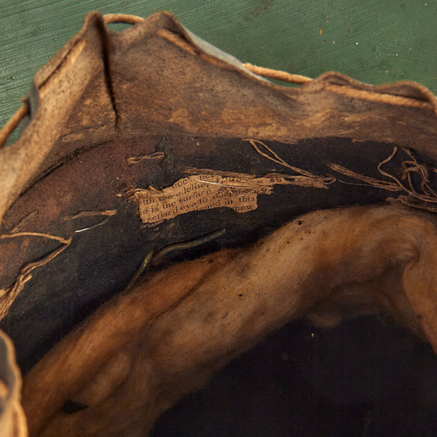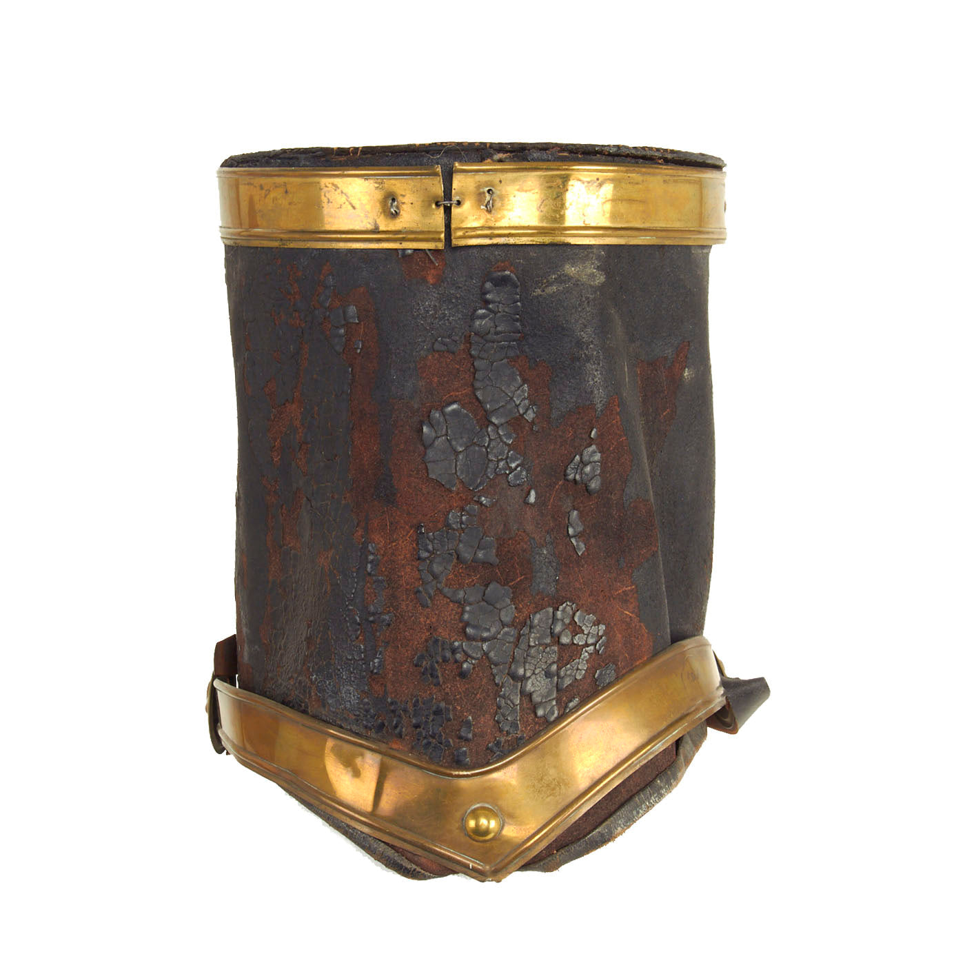 Overall good condition, with body showing some heat shrinkage and dents typical of nearly 200 year old leather. Tarred finish is flaking in some spots. Crown has been professionally reinforced to the inside with a basswood ring for stabilization purposes.