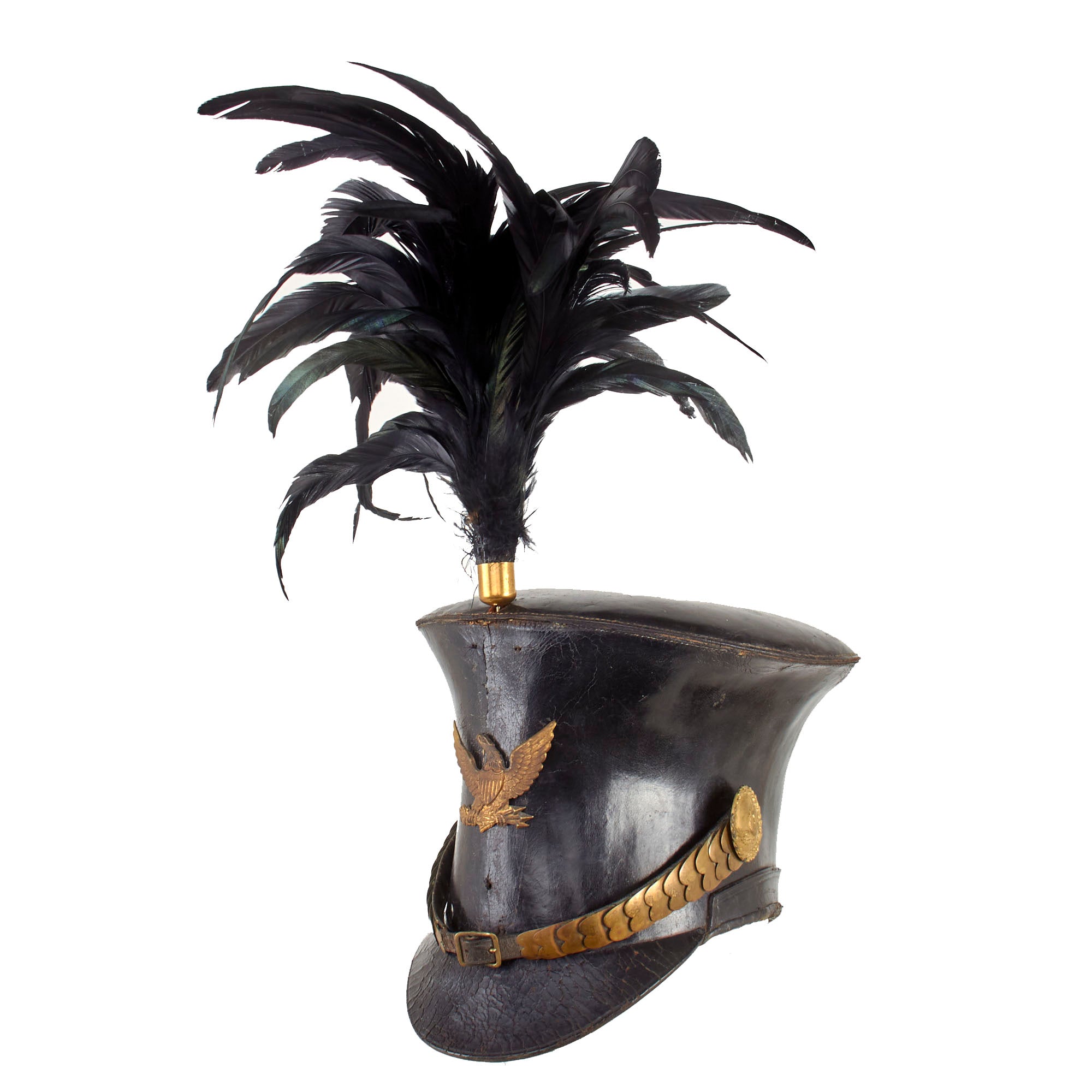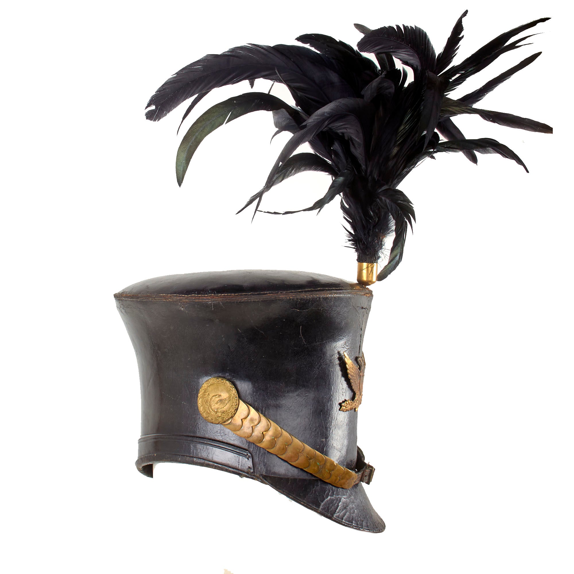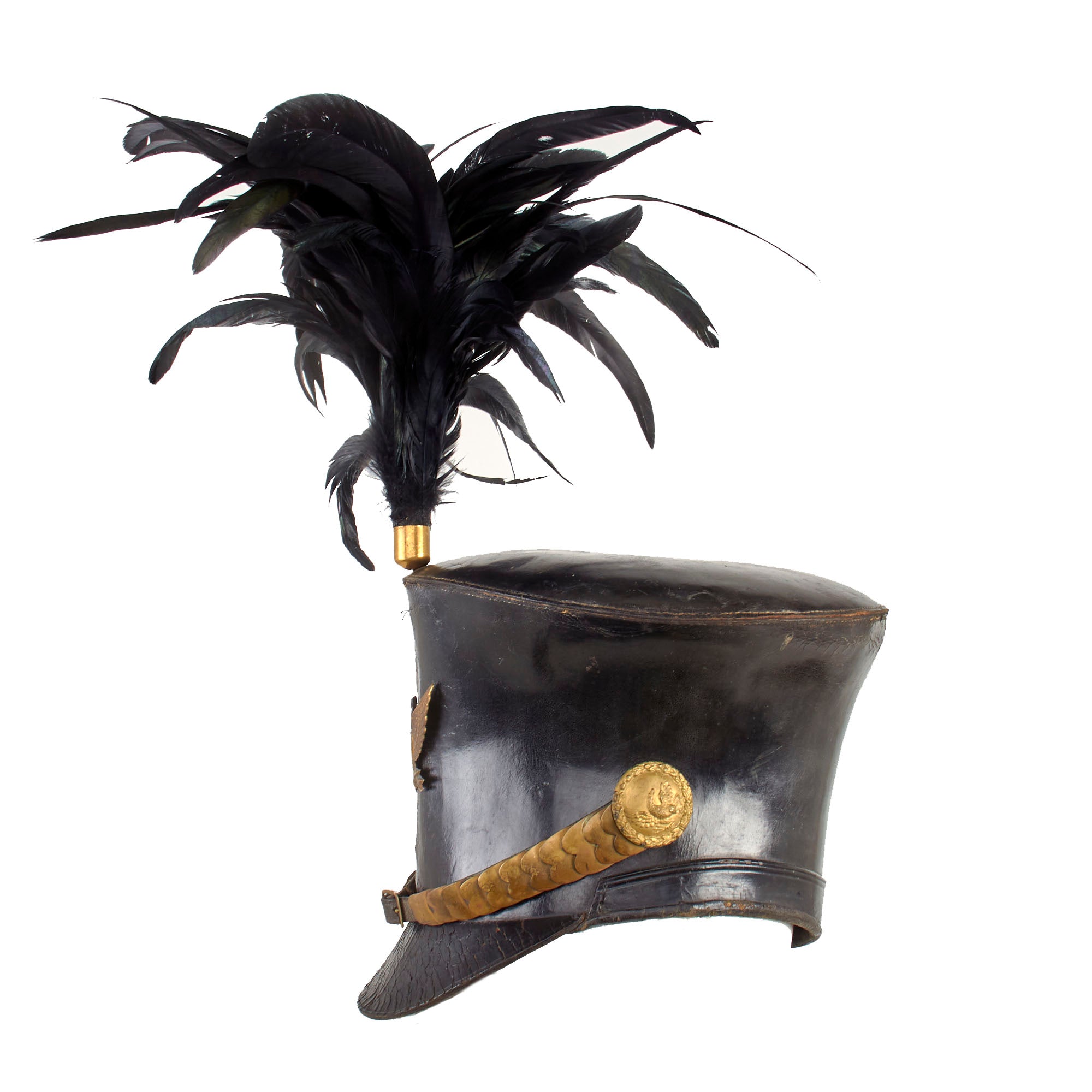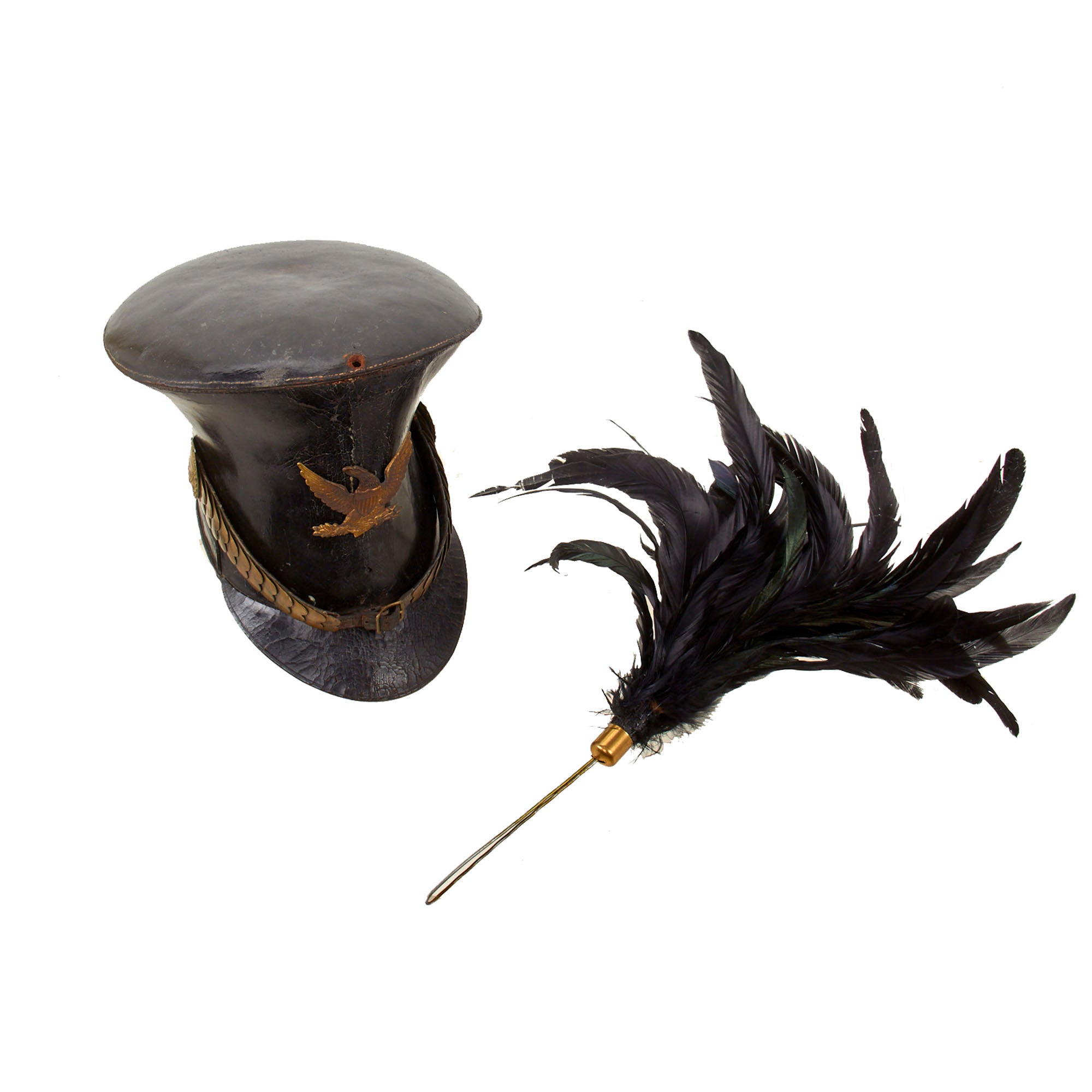 Overall shape is intact with a nice arched drop back still holding its overall shape. Typical crazing and expected period commensurate wear to the tarred black finish over pressed leather. Polished cloth lining is absent, with a solid leather sweatband and worn skull cap. Missing the original ostrich plume but a hole is present if you would wish to add an original one. 95% original green paint under the visor is retained. The height is approximately 7 - 3/4".