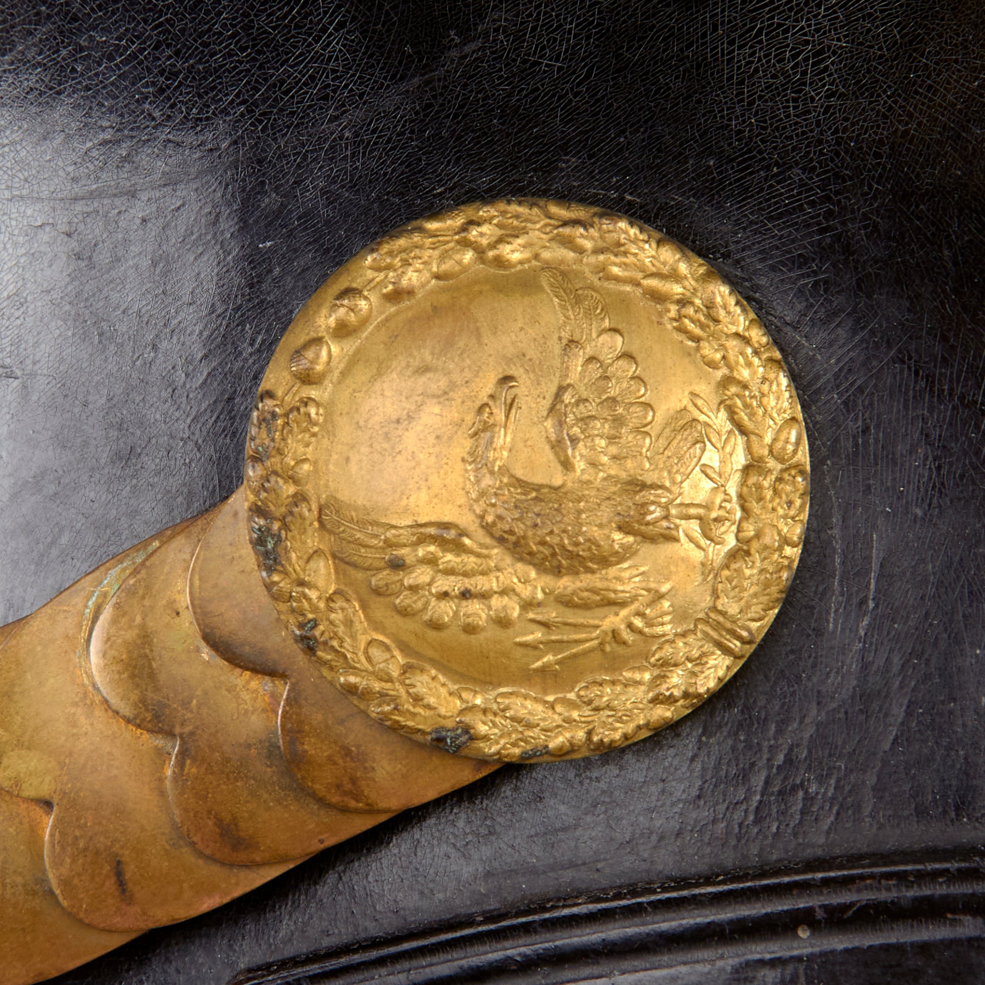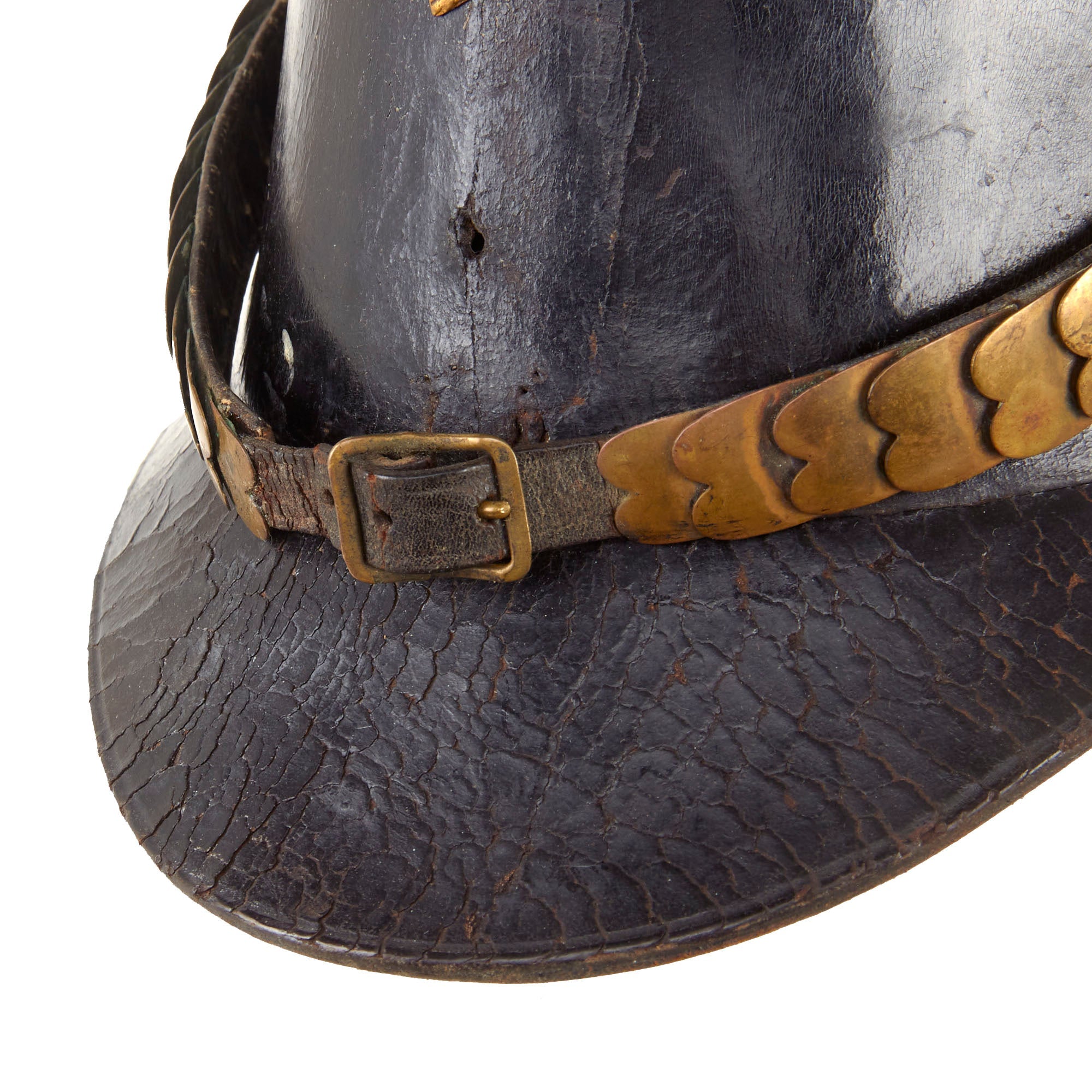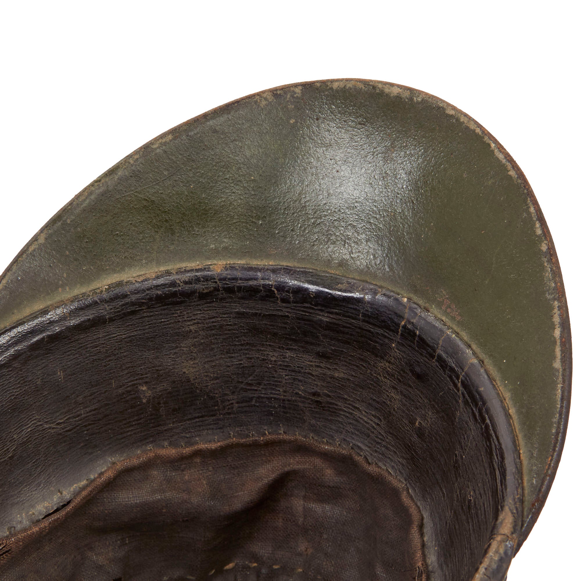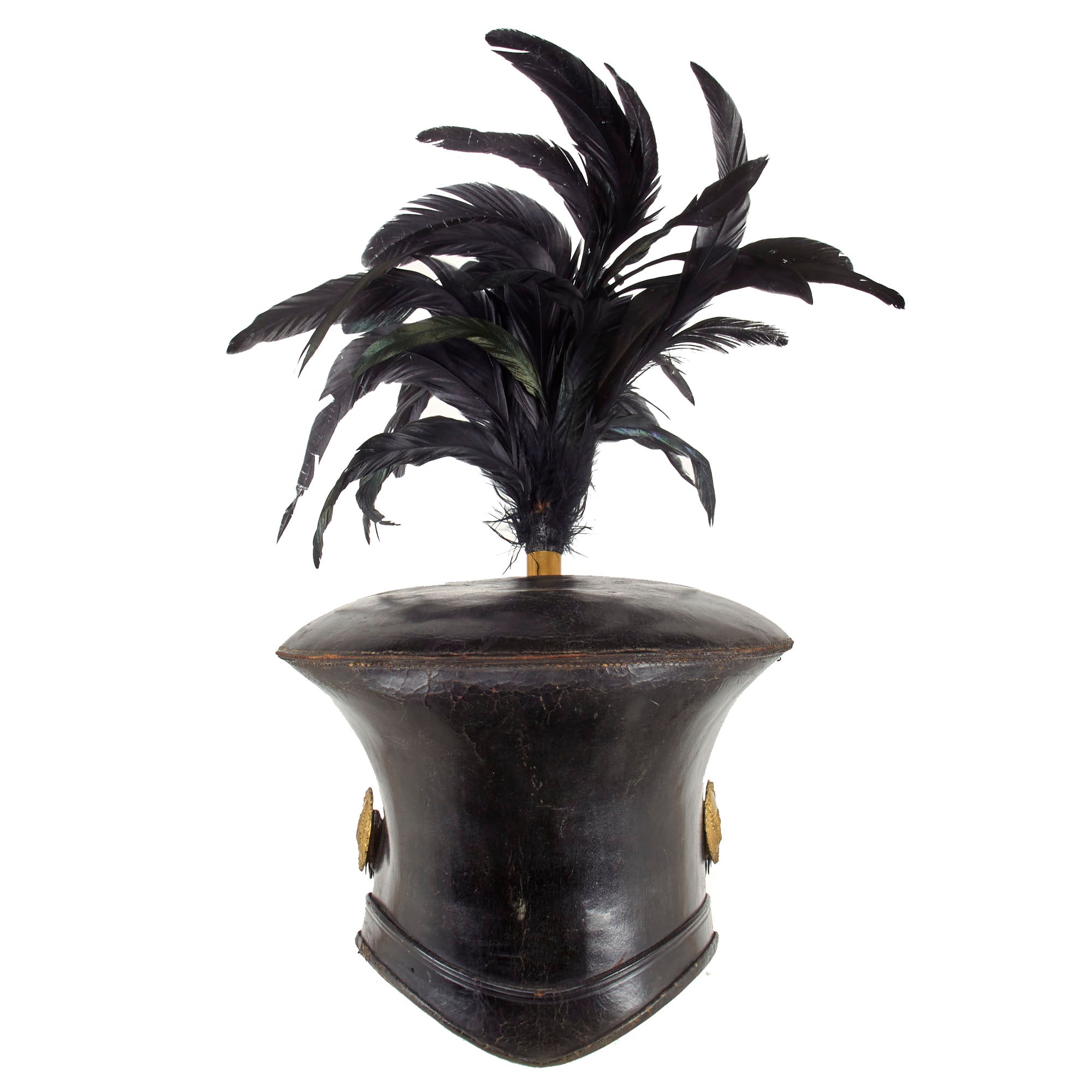 Overall shape is intact with a nice arched drop back still holding its overall shape. Typical crazing and expected period commensurate wear to the tarred black finish over pressed leather. Polished cloth lining is absent, with a solid leather sweatband and worn skull cap. Missing the original ostrich plume but a hole is present if you would wish to add an original one. 95% original green paint under the visor is retained. The height is approximately 7 - 3/4".