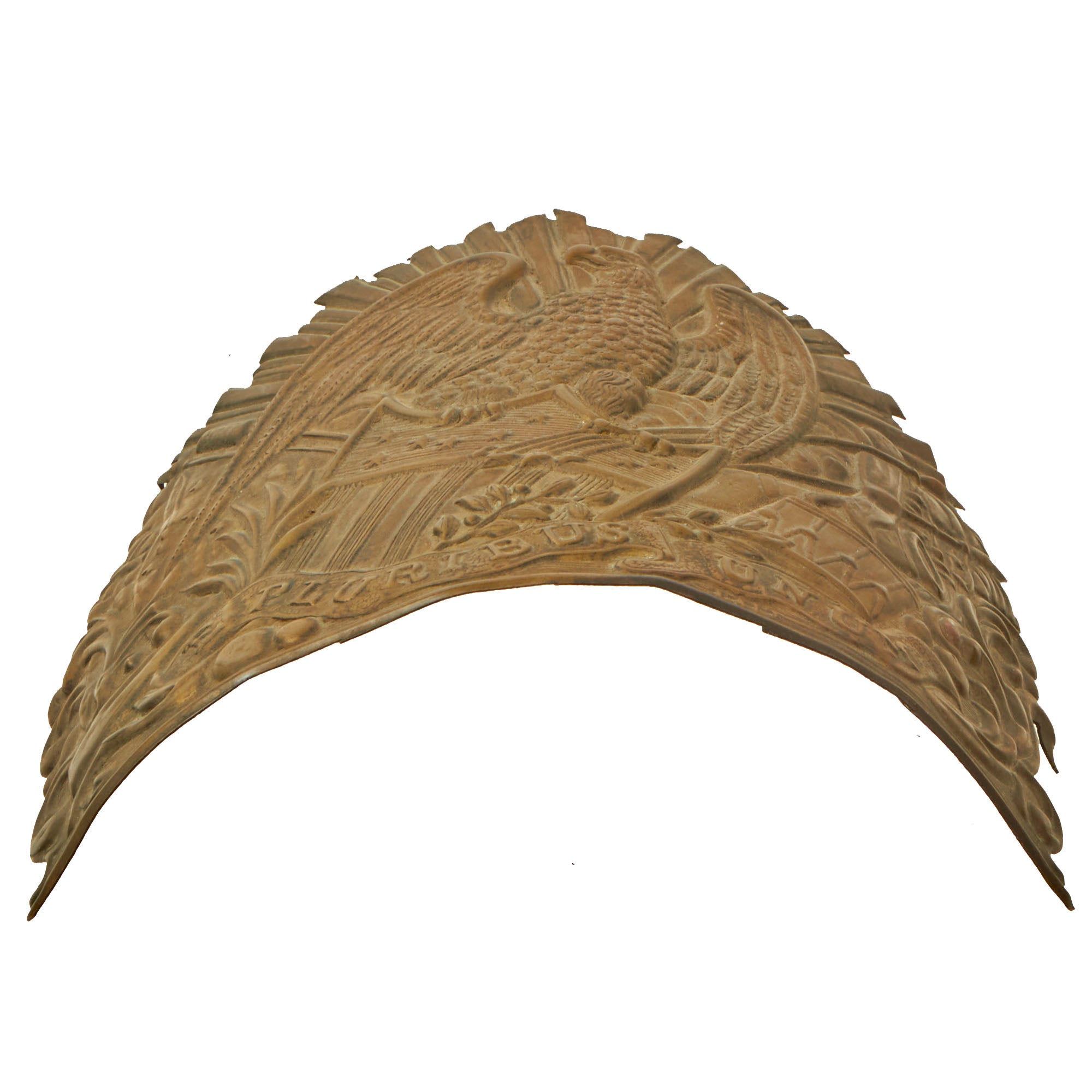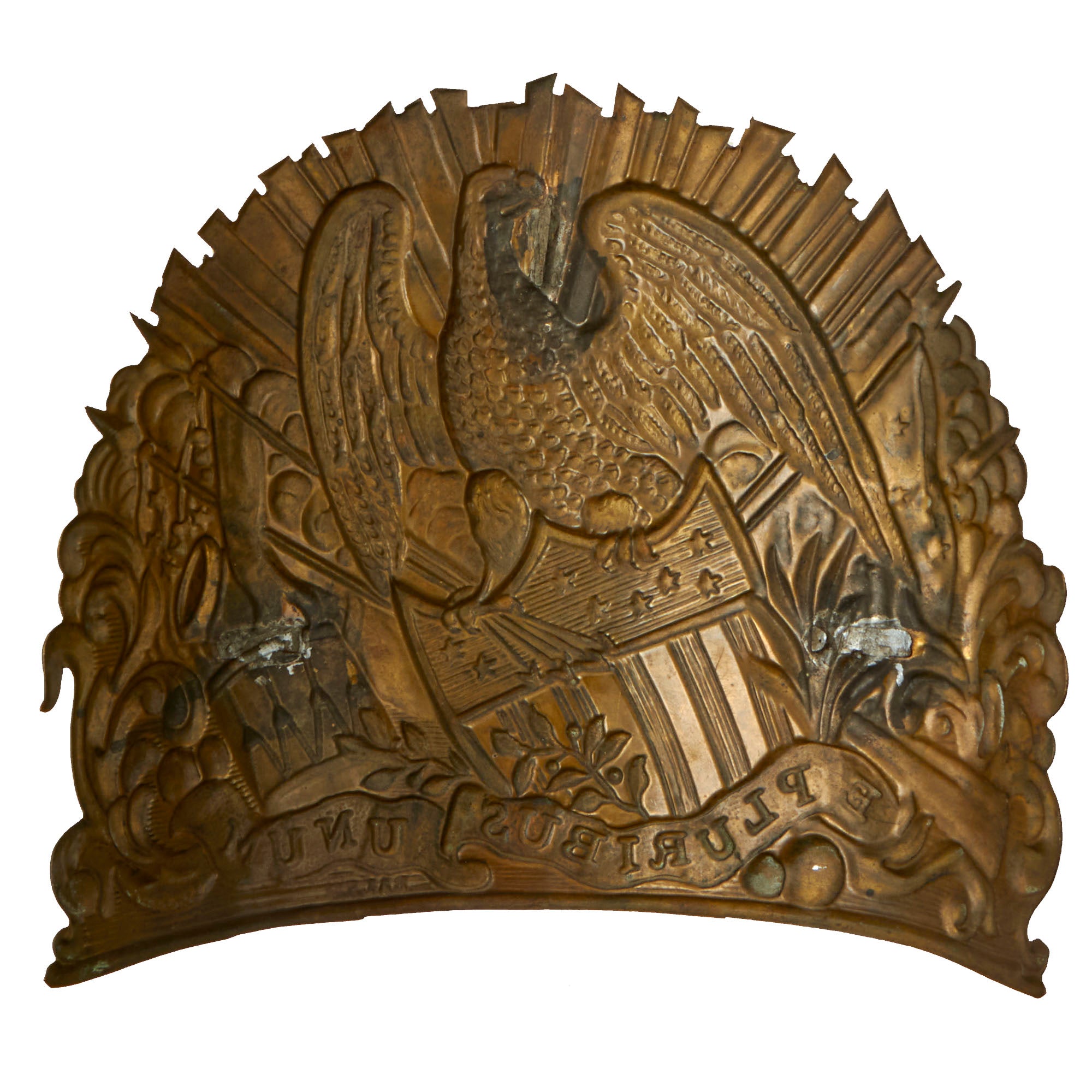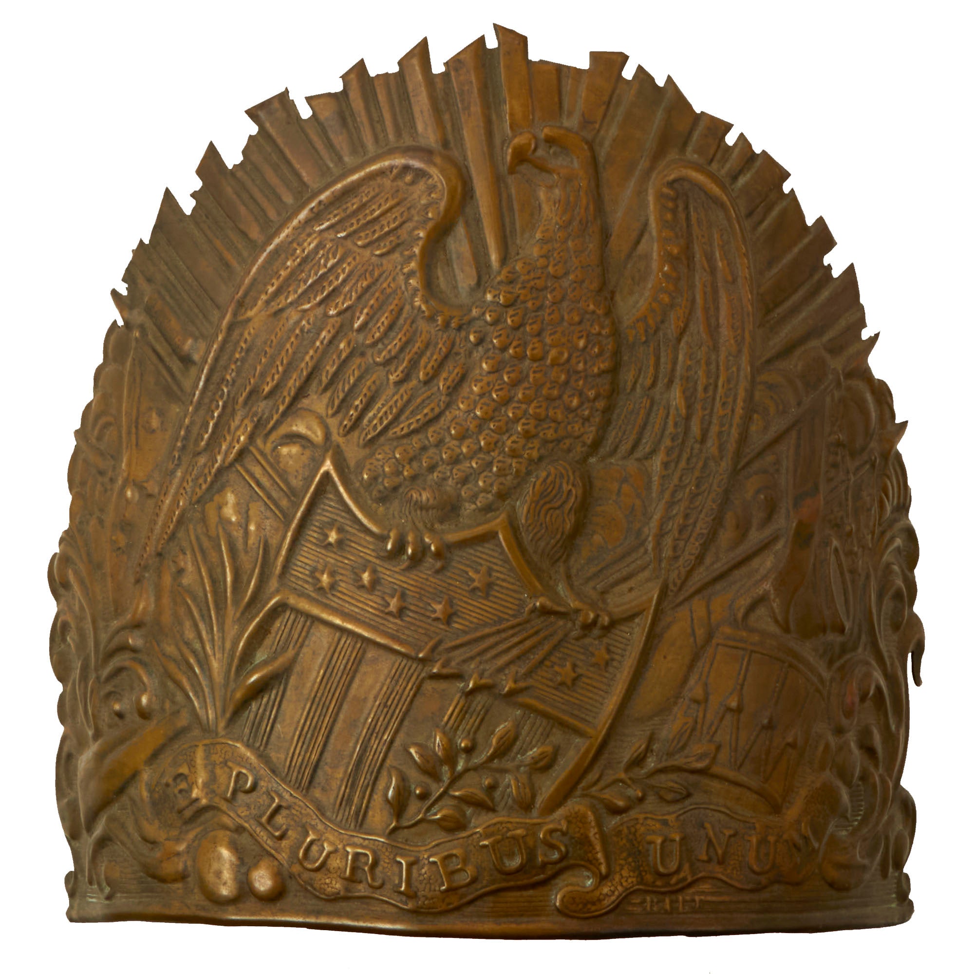 Original Item. Only One Available. This is a very nice U.S. Seminole Wars era Shako plate to be worn on the front of a large tar-bucket style shako hat worn by Federal and militia soldiers during the 1830s and 1840s. This example depicts an eagle clutching arrows and the American shield in front of flags and drums, with a scroll reading E PLURIBUS UNUM at the bottom.