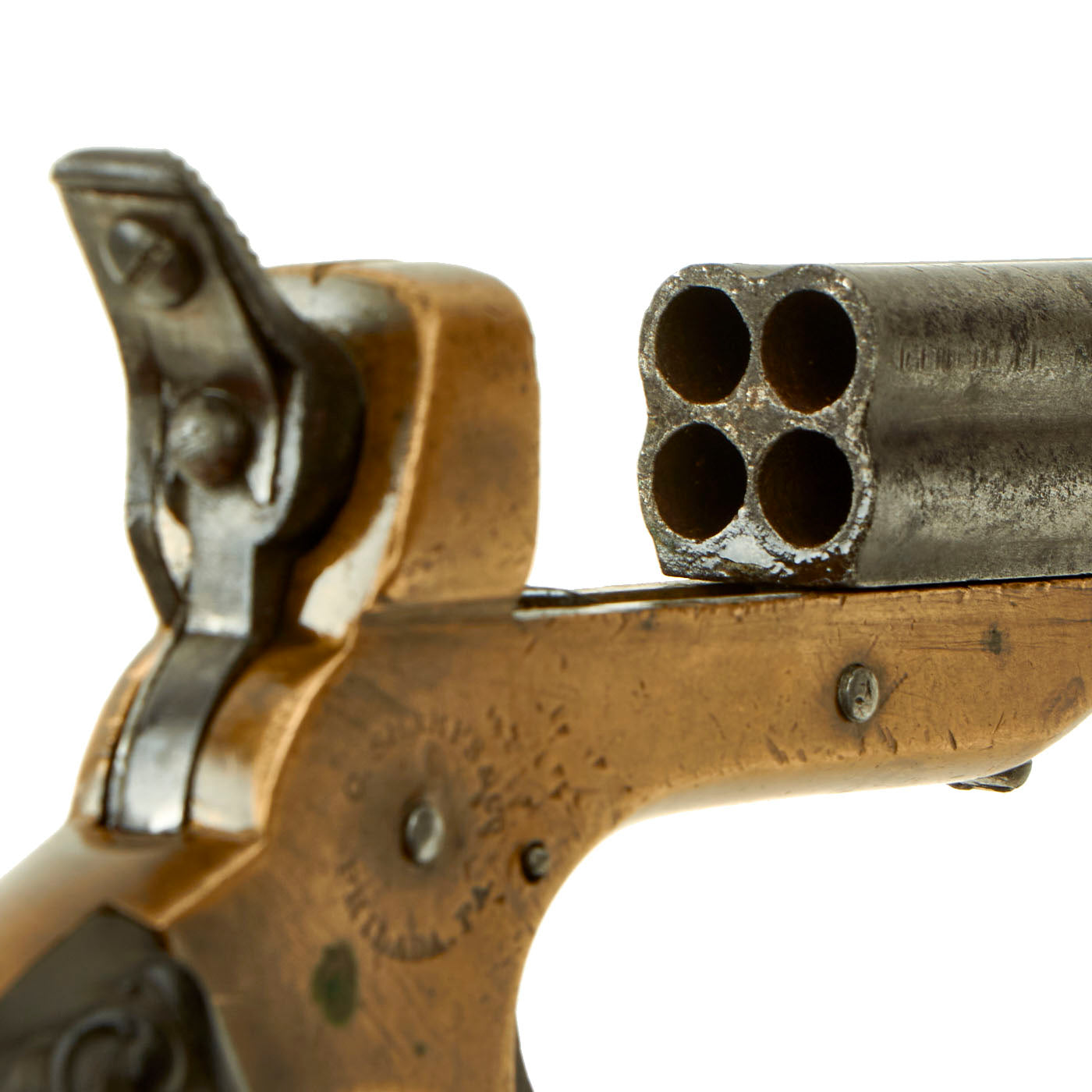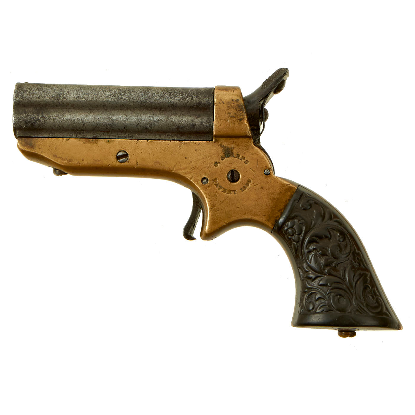 Original Item: Only One Available. This is exactly what the Mississippi gamblers carried on the River Boats after the Civil War for self protection. Featuring FOUR barrels, each in .22 Rim Fire that fired individually by way of a single action hammer with a rotating firing pin. Easy to conceal, these were very popular, and often outfitted with custom options, such as the lovely decorative grips on this example.