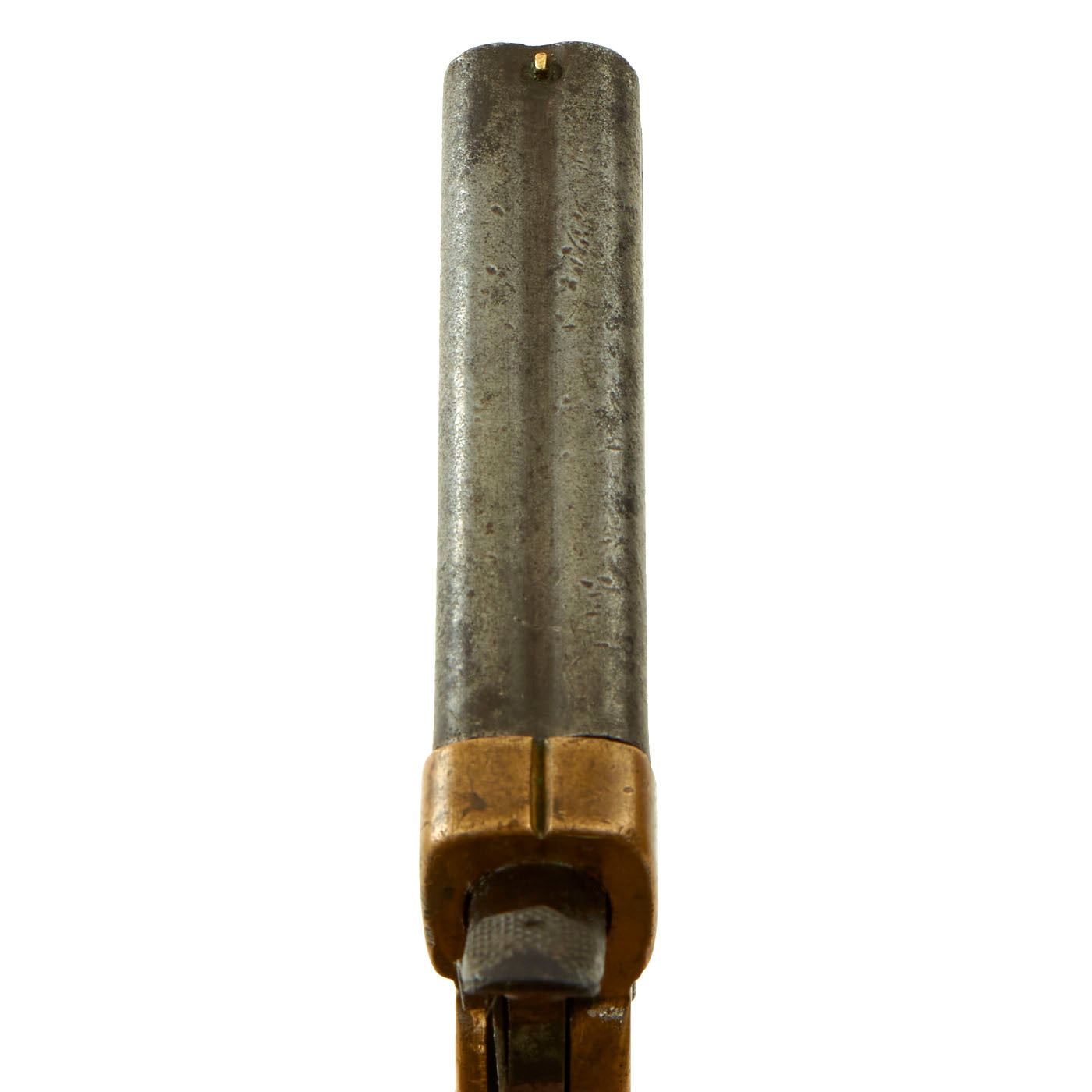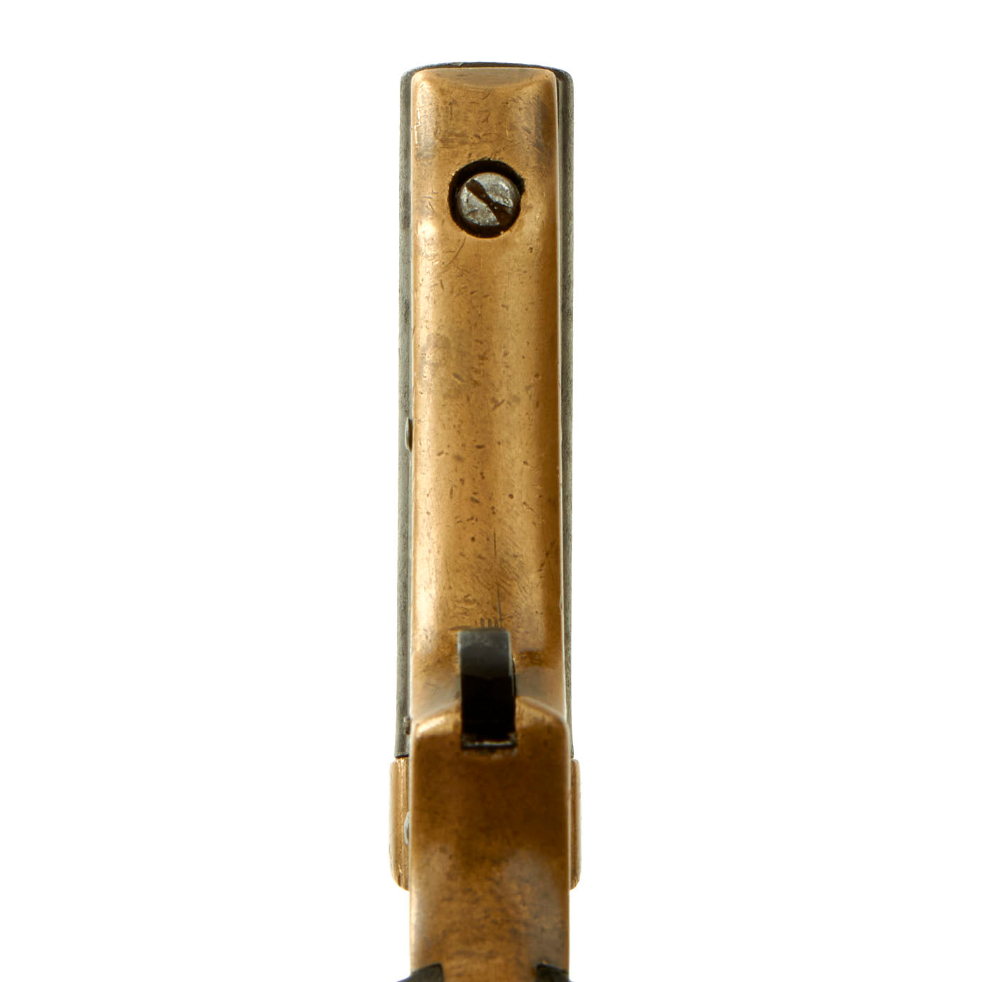 Overall metal finish on the barrel cluster exterior is a nice polished light gray patina, having faded from the original blued finish from cleaning. There is also some light peppering on the barrel exterior. The frame has lost virtually all of the original nickel plating, as with many examples we see. It now has a lovely light "mustard" patina overall. The flat bottom grip is very nice, with two lovely black decorative composition "gutta percha" style grip scales. The left scale is fully intact, while the right has a missing chunk on the front toe, and a small chip on the rear.