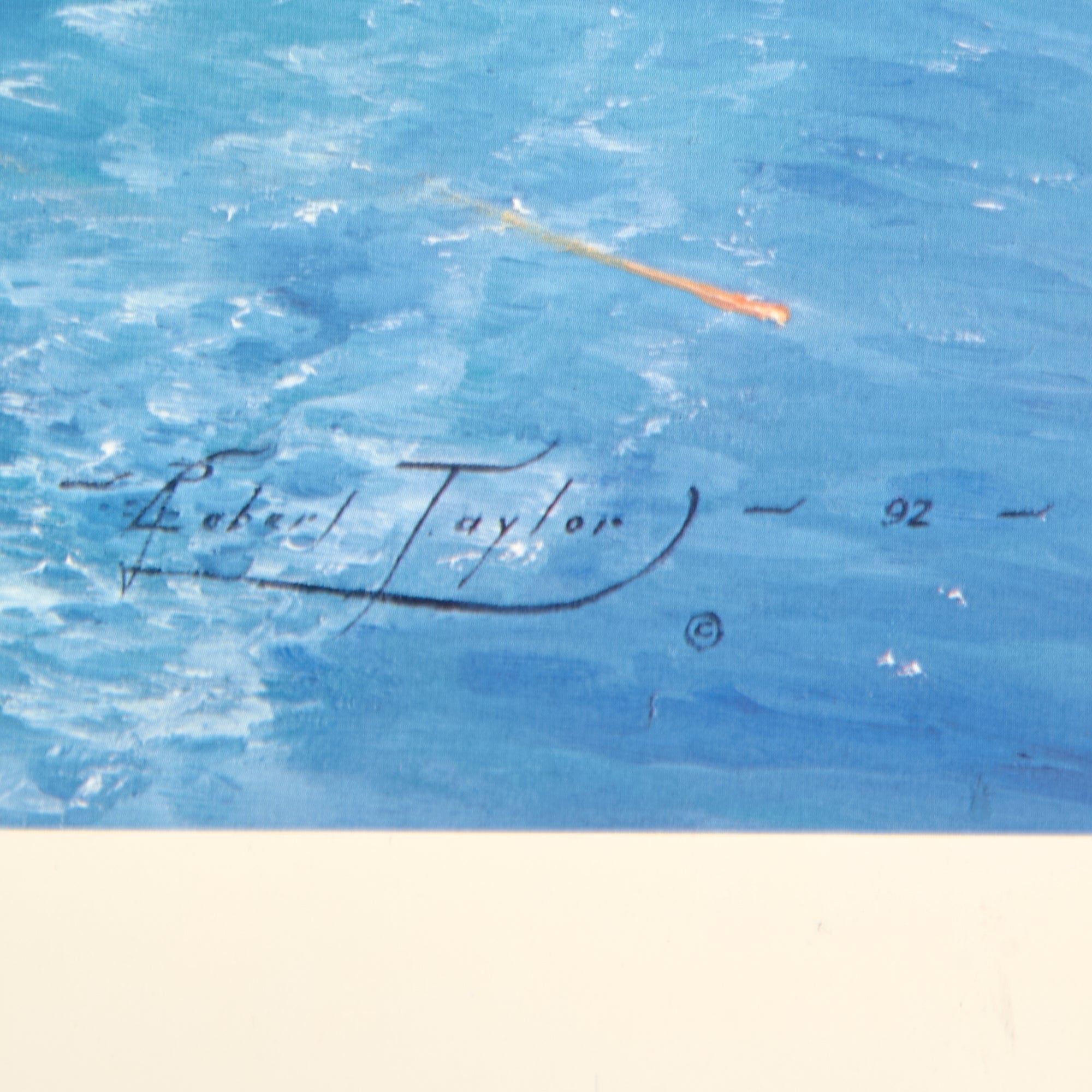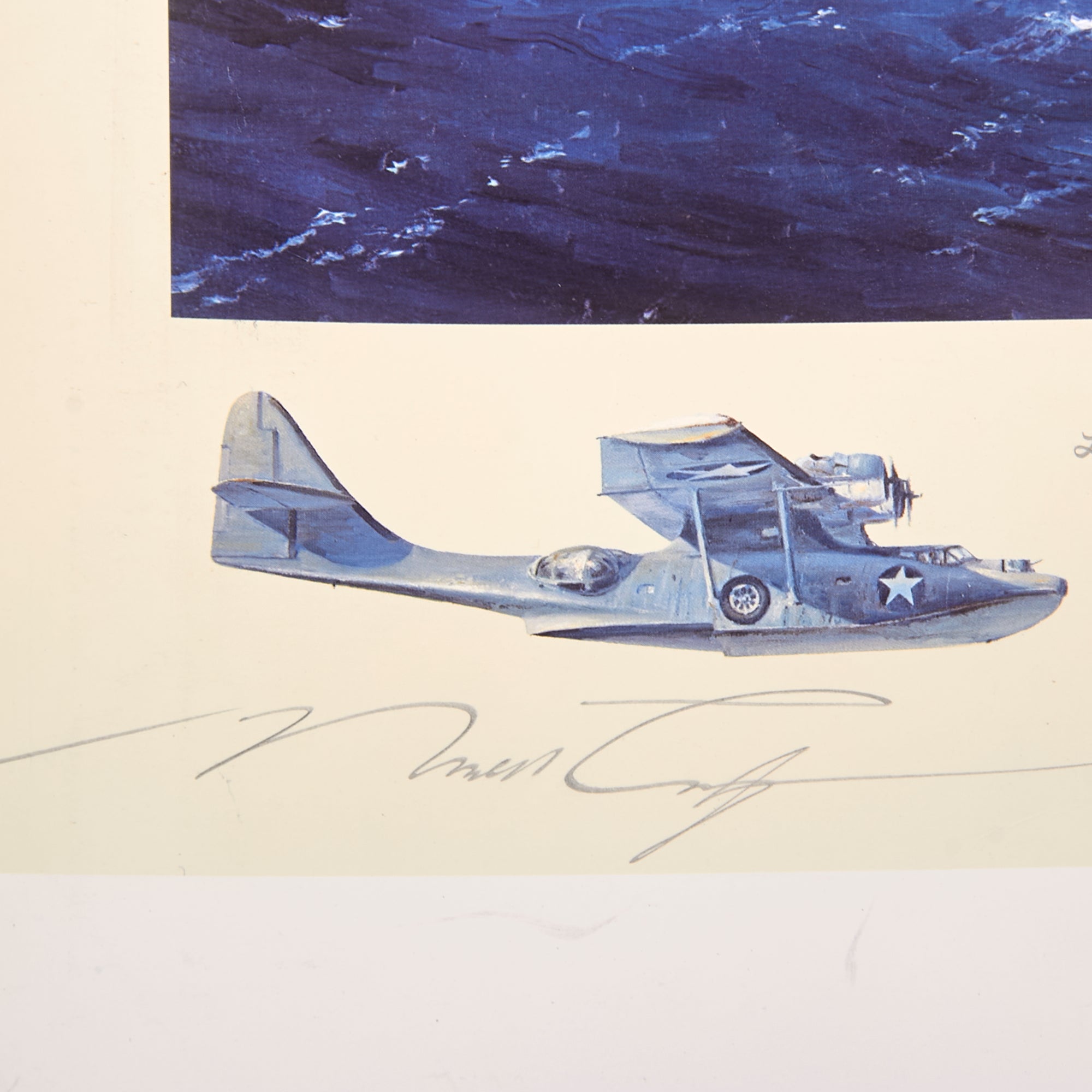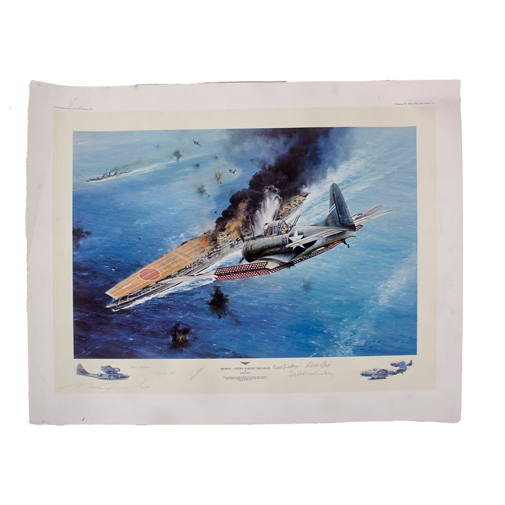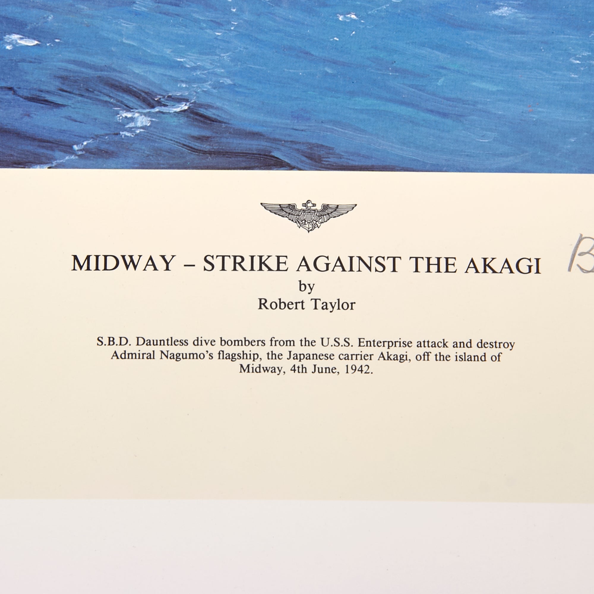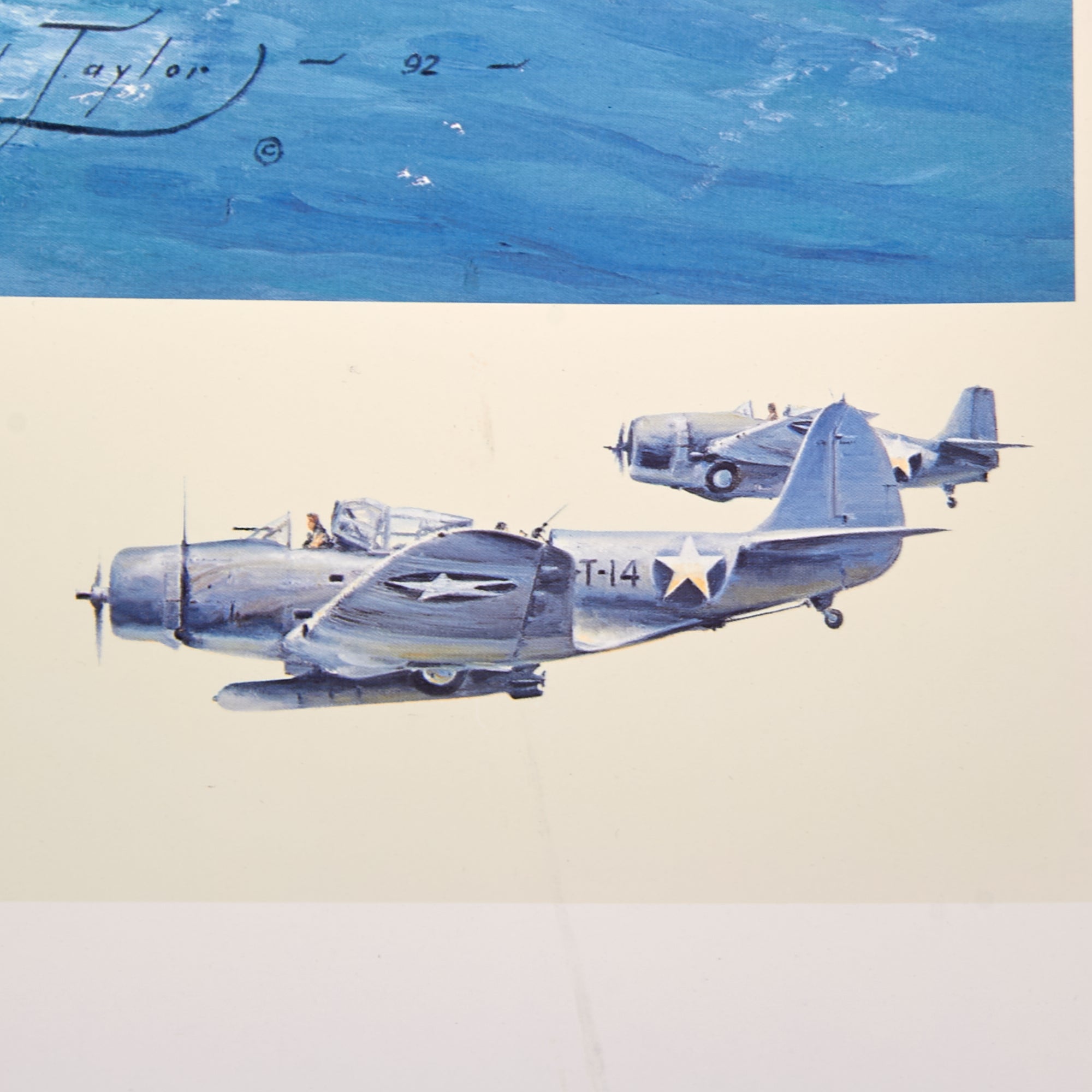 This certified, limited edition print, was reproduced from an original painting by Robert Taylor. This is the only print that bears the number 840/1250. Each print was signed personally by the artist, and numbered, with the original signatures of Six Distinguished Midway Pilots.