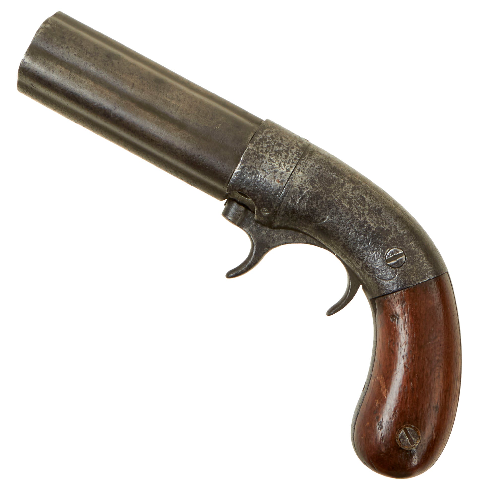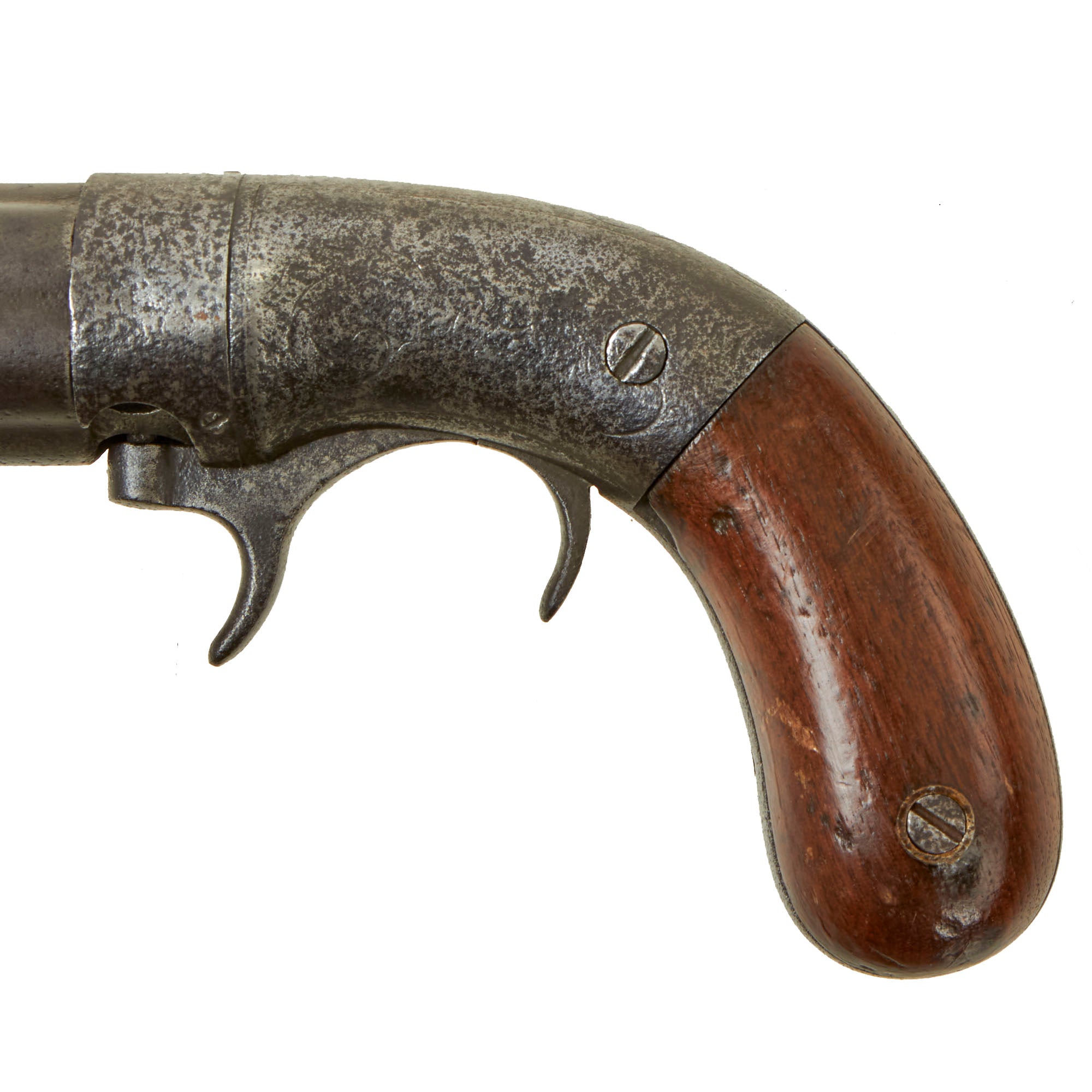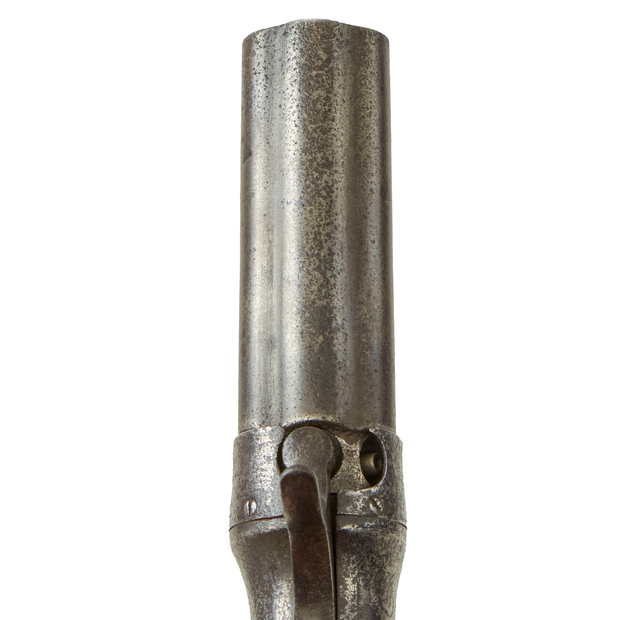 Original item. Only One Available. This is a very interesting U.S. Underhammer Percussion Pepperbox revolver, which were given their name due to the muzzle's resemblance to a pepper boxes / pots / grinders used at the time. Showing a lovely peppered patina, it features a 3 ½" long barrel cluster in approximately 0.31" caliber, and measures approximately 7 ½" in overall length.