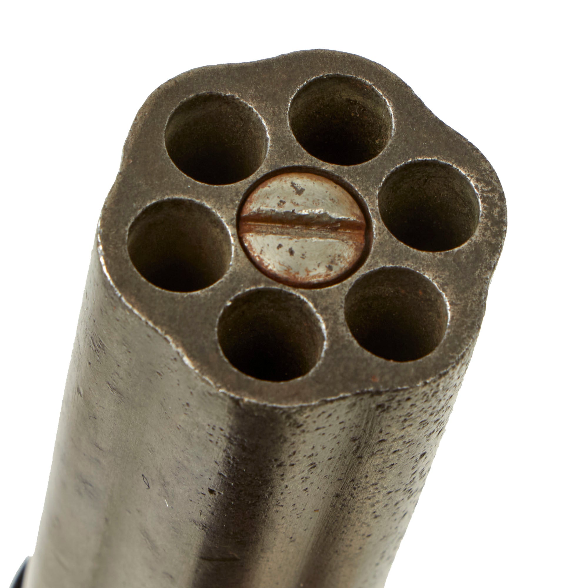 The revolver looks to originally have had floral engraving on the flash guard and frame, however it now shows much use, so the original engravings are now faint. We were not able to find any maker markings or proof marks, but it is possible that they were worn away over the years. Removing the grips shows that it is marked with serial number 35 on the frame, mainspring, trigger spring, and on the inside of the right grip scale (the left is usually unmarked on U.S. Pepperboxes). It also is marked 35 on the rear of the barrel cluster between the cap nipple cones, which makes this a very nice "ALL MATCHING" example, with no parts swapped out over the years!