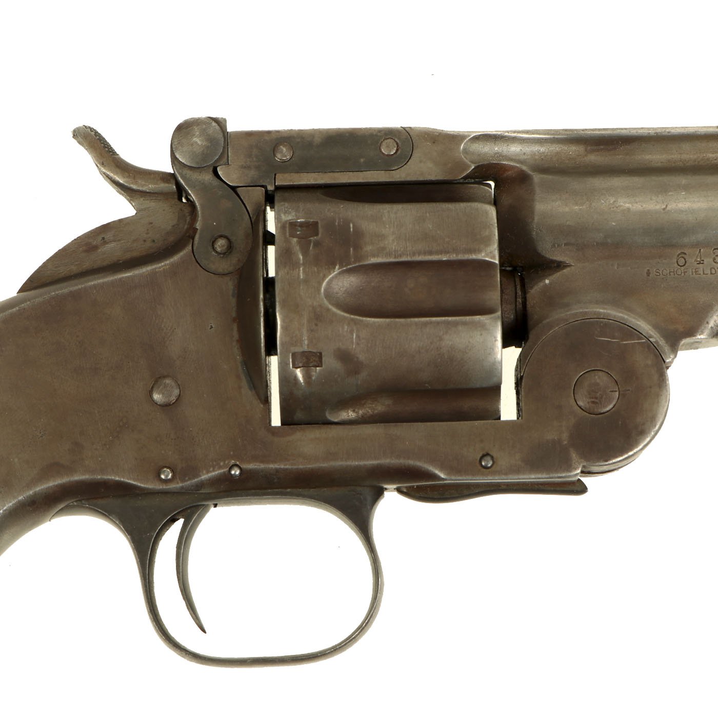 Original Item: Only One available. This is a really nice and rare old Wild West Revolver to find. This is a very nice Smith & Wesson "Schofield Model" No. 3 revolver, in .45 Smith & Wesson Caliber. It has some lovely aged walnut grips. The S&W Model No. 3 was introduced in 1869 as the U.S. Army's principal sidearm, after which they requested several changes to the design suggested by Major George W. Schofield.