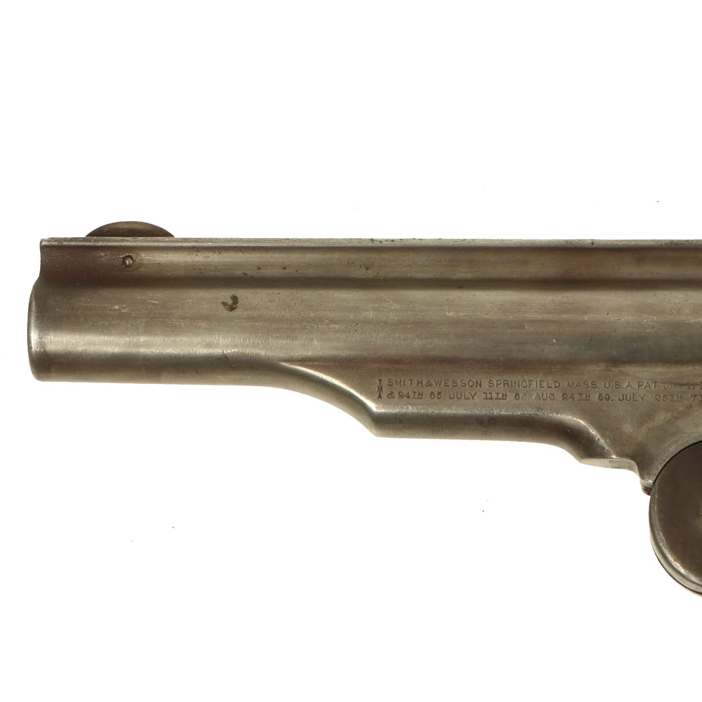 This fine example features a shortened 5" barrel and has a cylinder capacity of 6 shots, and functions in single-action only. The left side of the barrel bears the Smith & Wesson patent information: