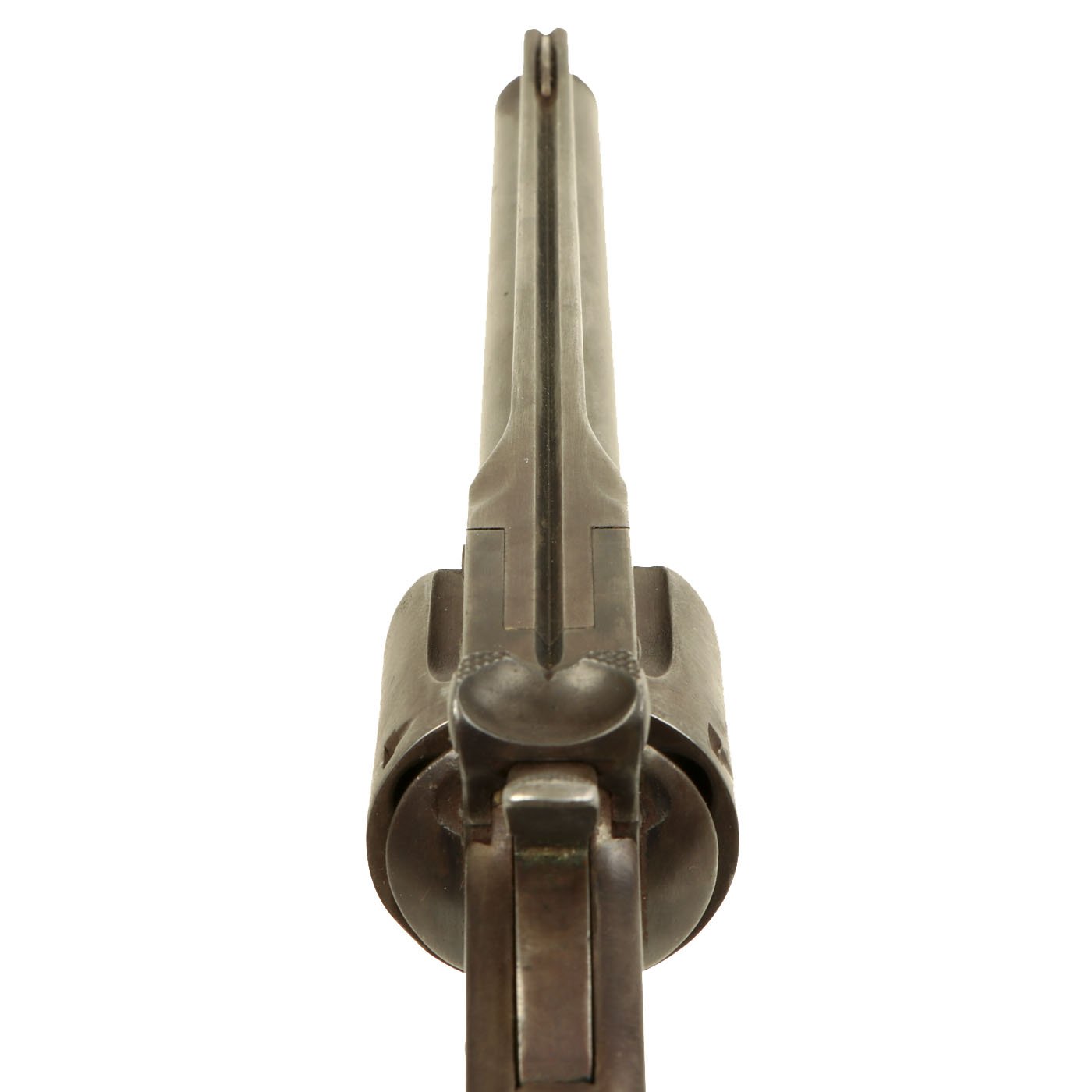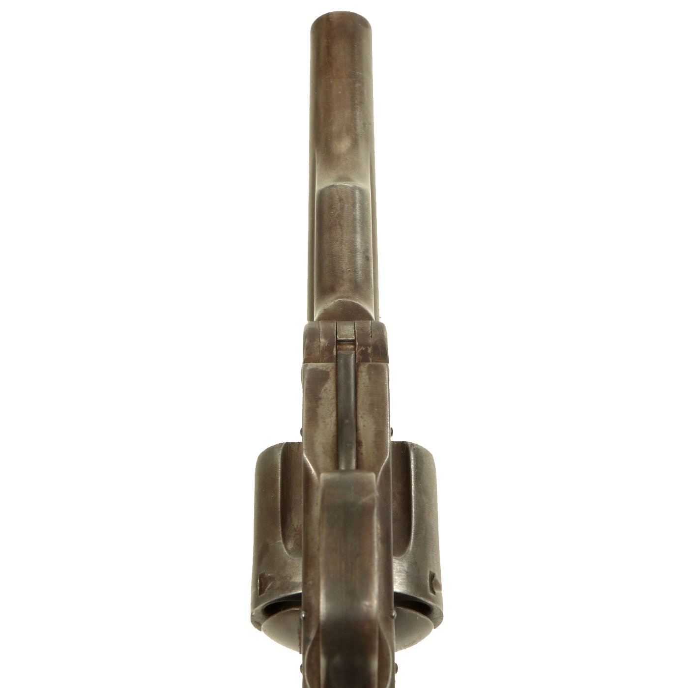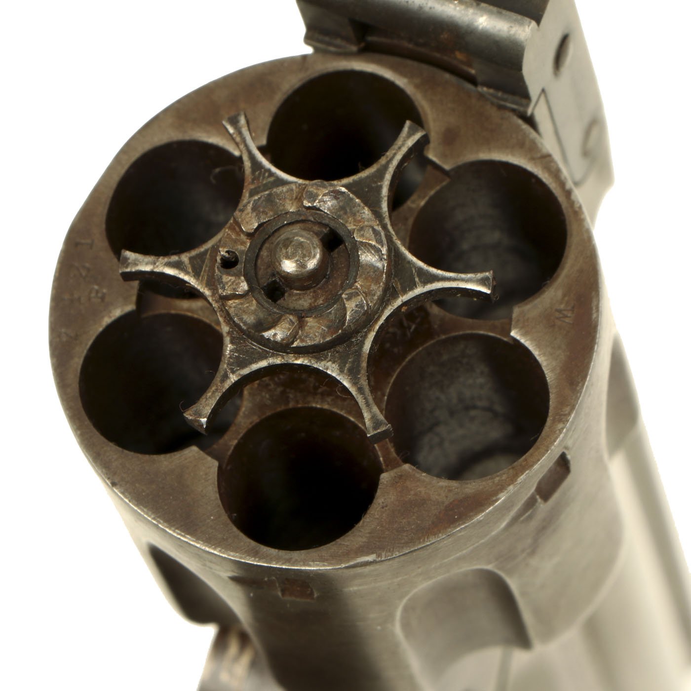 The revolver functions, however portions of the action are worn, making it finicky, so it will not cycle correctly at times. The cylinder must be moved by hand to get it going again. The revolver breaks open correctly with ejection, and correctly retracts. The bore shows clear rifling, with some fouling and wear.
