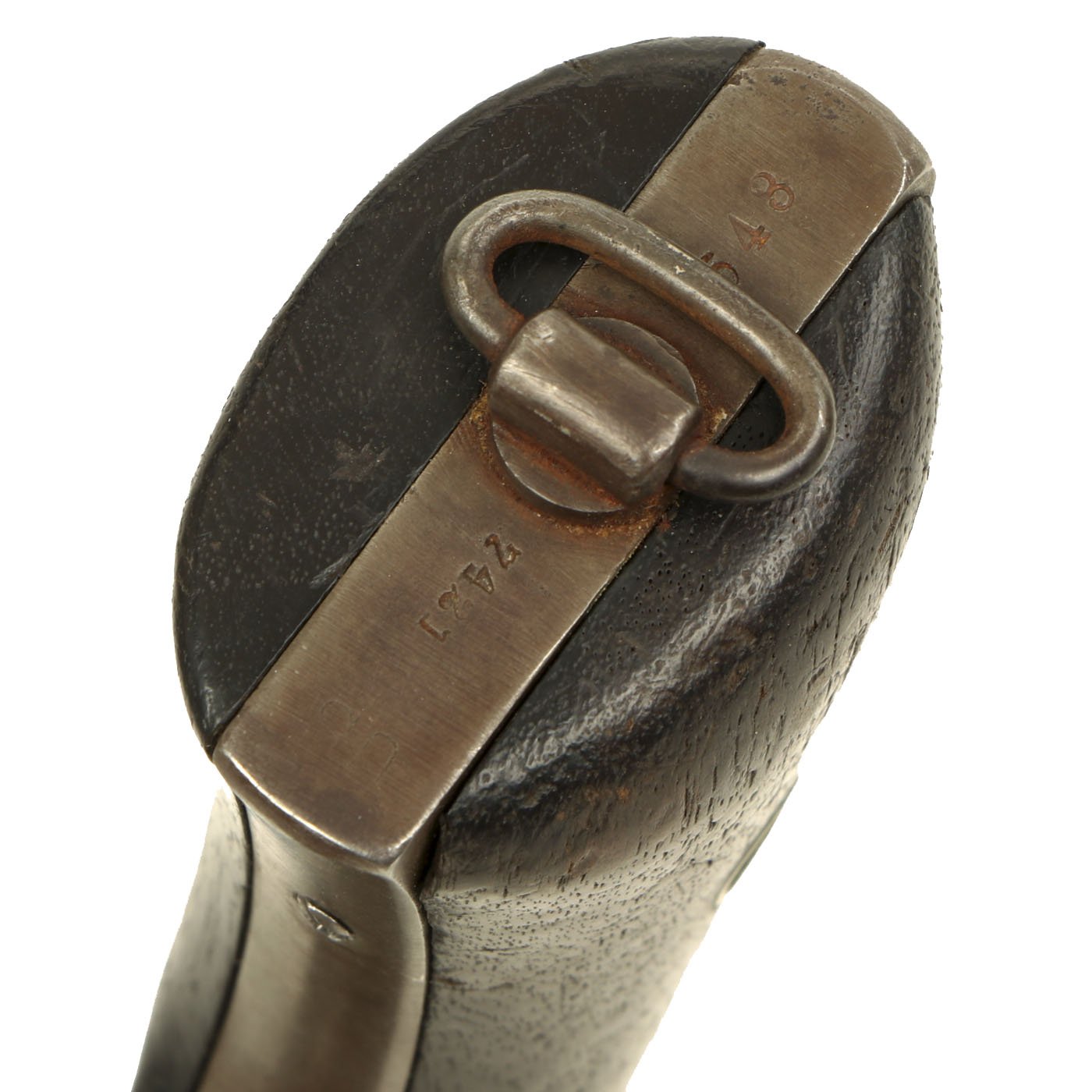 These patent markings are definitive for a Schofield model, as is the design of the revolver, which features a frame latch that pulls back, instead of lifting up. Above this patent information is also the marking 643 and WF & CO. EX., the markings of the Wells Fargo company. This number is the inventory number from Wells Fargo, and it also is stamped on the bottom of the grip. There is also a U.S. marking there, indicating U.S. Army Service, next to the original serial number 7421, which also appears on the back of the cylinder.