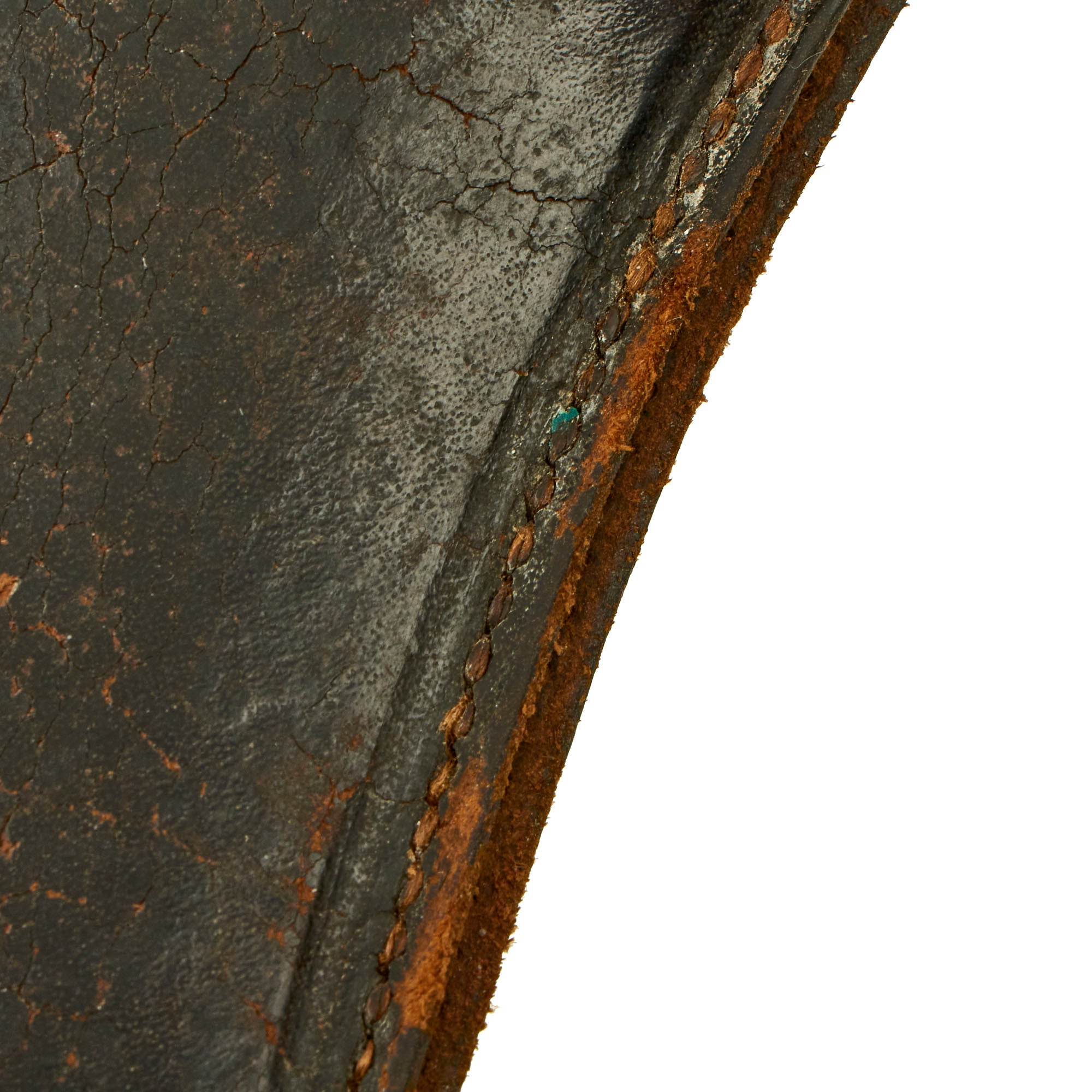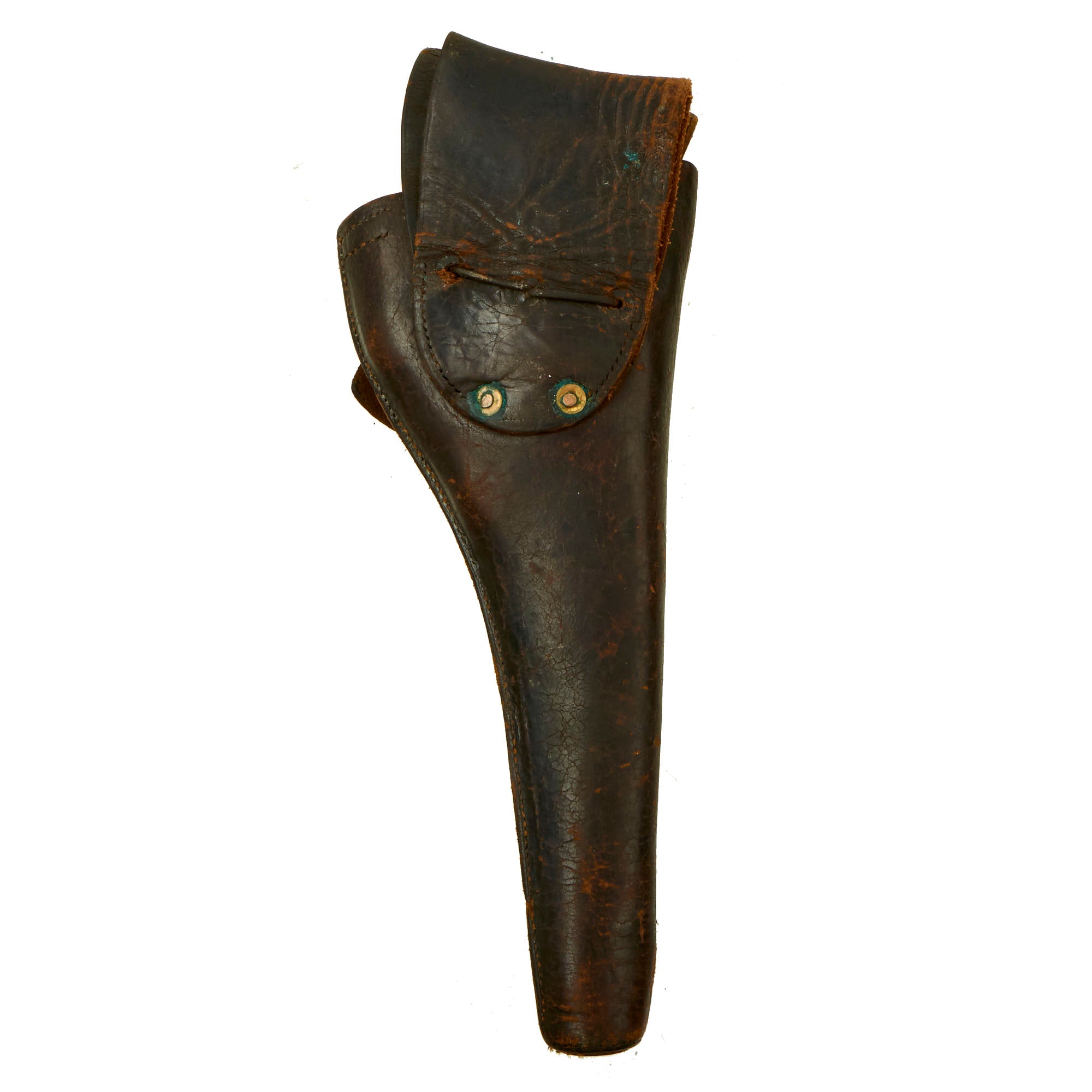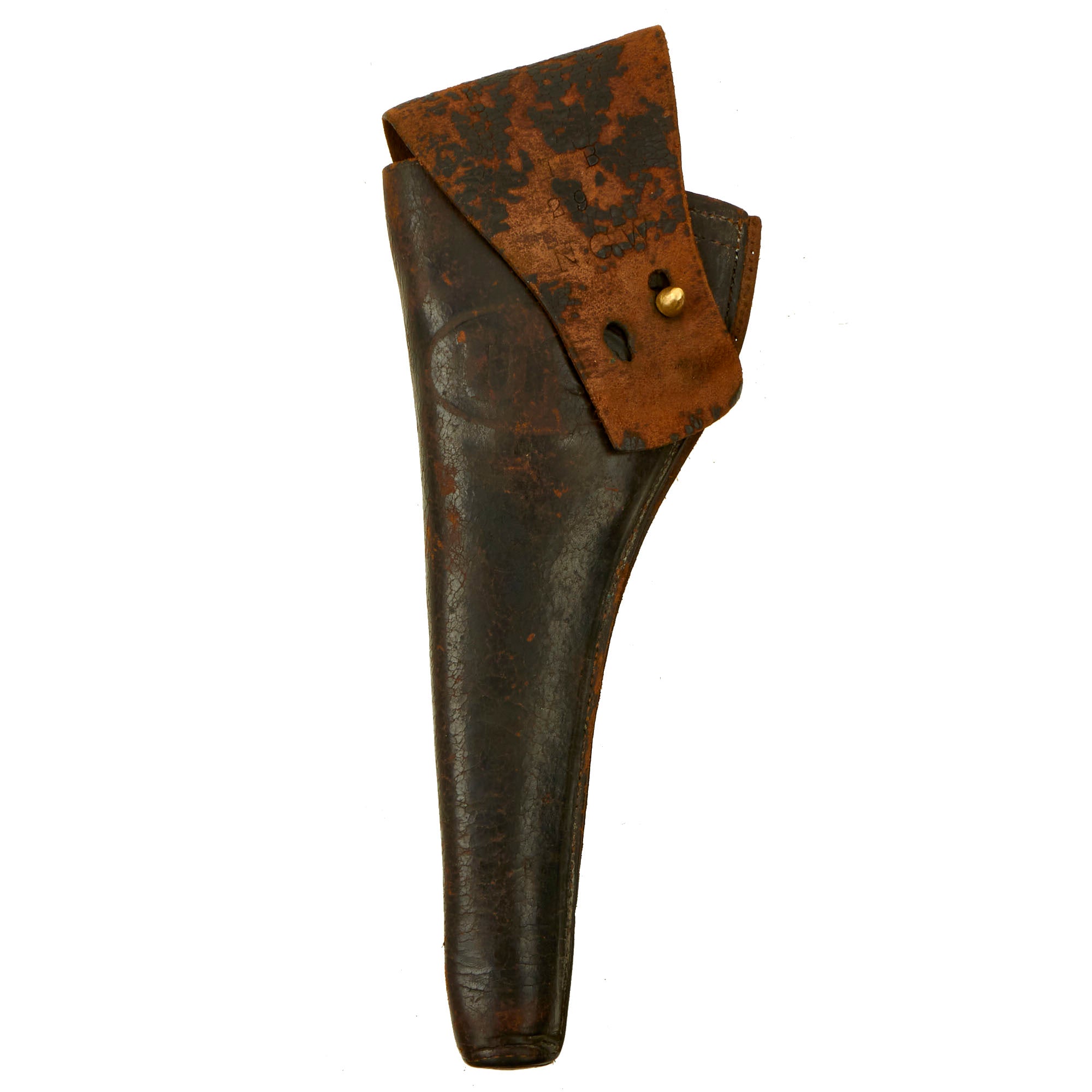 In addition to the surplus market, they were also sold off to state governments for use in their militia and Guard units, and this revolver came to us with a period correct M1881 top flap holster, designed to fit both the Colt Single Action Army AND the Smith & Wesson Schofield revolvers. This is why it has two holes in the top flap for the stud. This well-patinated example has unit markings stamped onto the flap, the most important of which is N.G.W., for "National Guard Washington". The holster is definitely in relic condition, with the finish flaking off and the seams mostly split, but it it came with the revolver and has clearly been with it for some time.