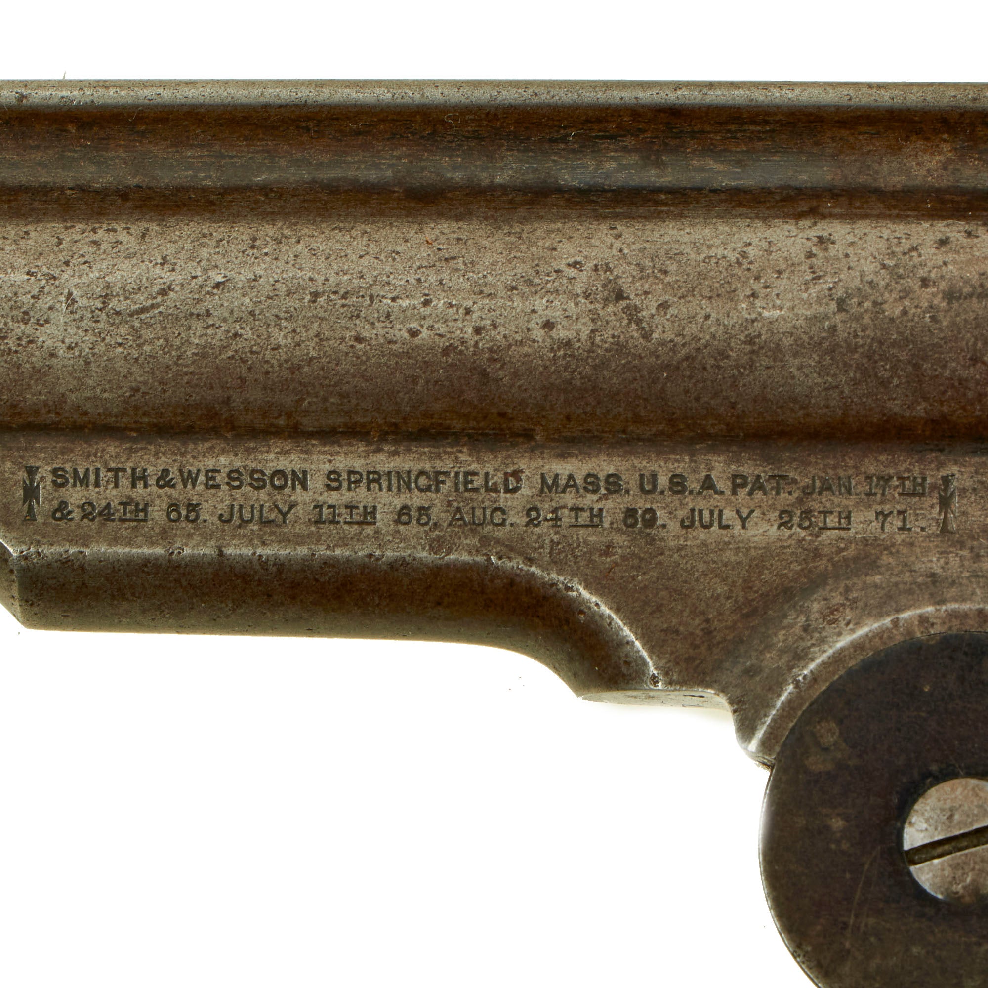 This fine documented example of a 2nd Model Schofield features an unmodified 7" barrel and has a cylinder capacity of 6 shots, functioning in single-action only. The left side of the barrel bears the correct Smith & Wesson patent information: