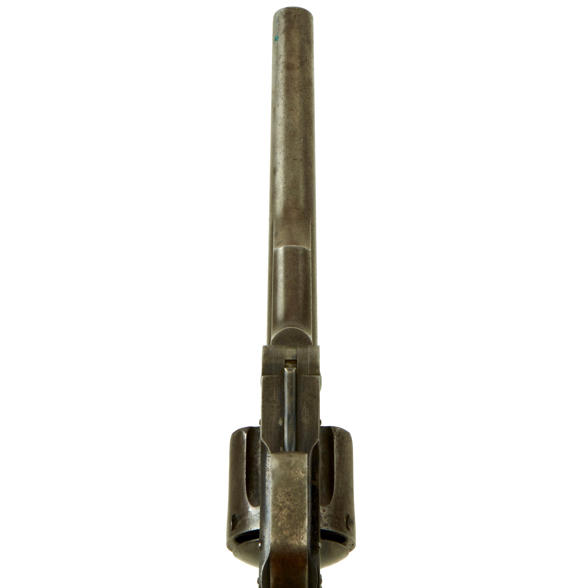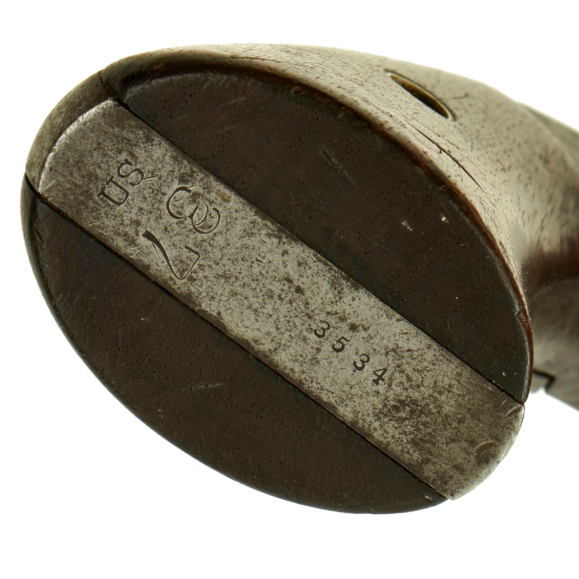 There is also a U.S. marking on the bottom of the grip, indicating U.S. Army Service, as well as a rack number 37. Next to this is the original serial number 3534, which also appears on the back of the cylinder and on the inside of the right grip scale. This serial number is definitive for a 2nd Model Schofield revolver. Additionally. both grips still bear faint inspection cartouches, which are entirely correct. The right grip has a faint script CW cartouche, for US arsenal sub-inspector Charles Woodman, specifically noted for inspecting the 2nd Model Schofield 1876-1877. The left grip has a fainter cartouche, but we can tell that it is a script JRJr., for US Ordnance Department inspector Lt. James Rockwell Jr., U.S. Army, noted for inspecting Schofield Revolvers 1874-1876. Under this is a very faint 1876, the date of acceptance, which fits right in with the documentation.