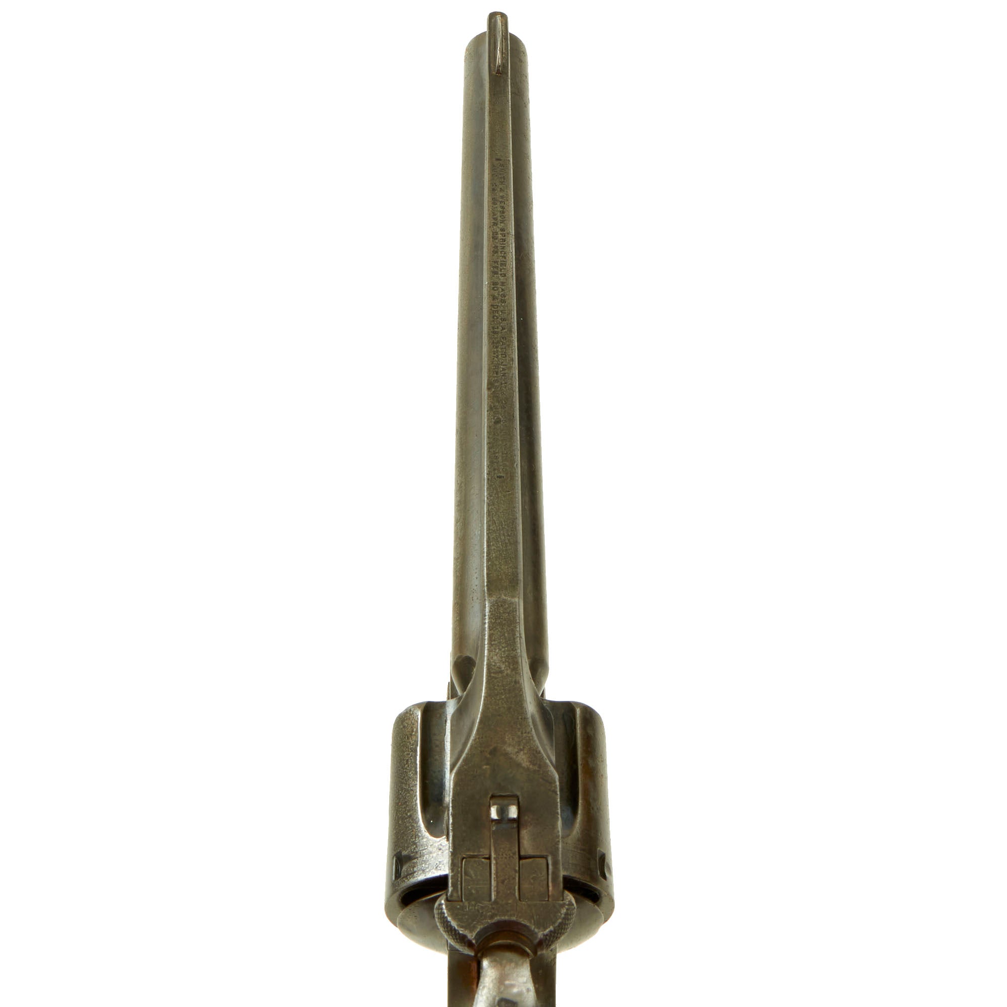 As mentioned previously, the revolver has a lovely overall oxidized patina, showing long use in service. This revolver was definitely originally blued, and still shows trades of that finish in more protected areas of the revolver. The revolver cycles well, with crisp indexing and a crisp dry fire. The cylinder lock is a bit worn, so sometimes the cylinder can be rotated backwards at full cock. The revolver breaks open correctly with ejection, and the ejector correctly snaps back once the action is fully open. The bore on the revolver is very good condition, showing strong lands and grooves with a mostly bright finish. There is some fouling in the grooves and oxidation haze near the cylinder, but overall it's a great shape for a black powder revolver that saw long service.