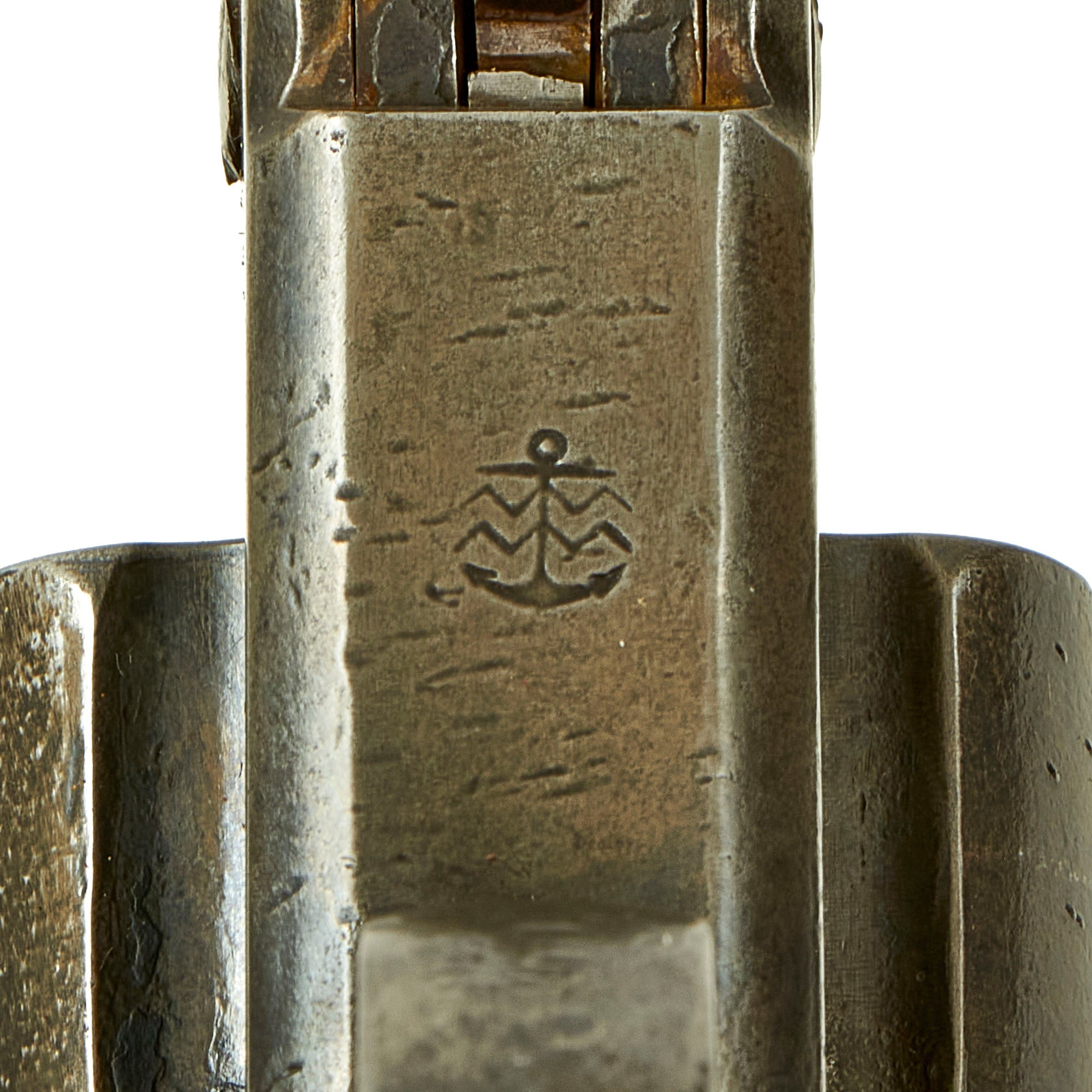 The Japanese military adopted the top-break .44 caliber “Russian” Model 3 Smith & Wesson revolvers as the “No. 1 Model Break Open Handgun”, and would proceed to acquire several thousand of these over the next three decades. Due to the fact that these purchases took place over time, the guns technically belonged to four different model classes: Model 3 Russian 2nd Model, Model 3 Russian 3rd Model, New Model No. 3 Single Action and New Model No. 3 Frontier. However as these all used the same .44 S&W "Russian" cartridge and only had minor differences mechanically and visually, the Japanese military kept the same designation for all. Of these imported revolvers, some were specifically processed for Naval use, and these are the ones that bear the "Wavy Anchor" proof that this example has.