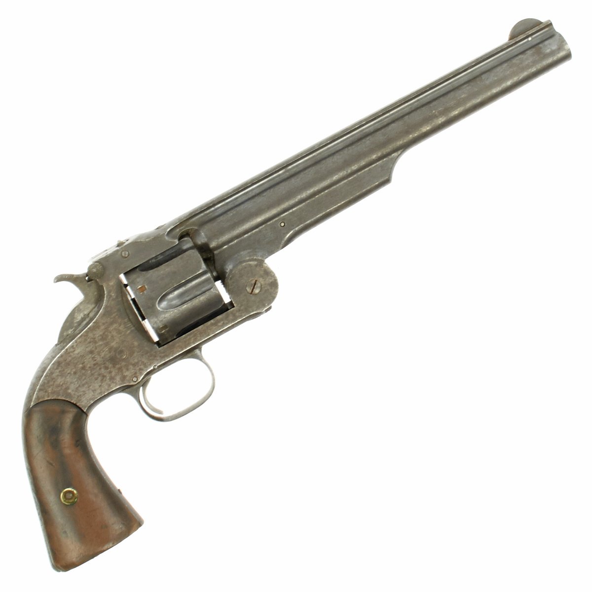 Original Item: Only One available. This is an unusual old Wild West Revolver to find. This is a very nice Smith & Wesson Model 3 revolver in .44 S&W, which was introduced in 1869 as the U.S. Army's principal sidearm, which they used until 1873. It features a long 8" barrel and has a cylinder capacity of 6 shots, and functions in single-action only. The top of the barrel bears all the S. & W. patent dates up to 1869: