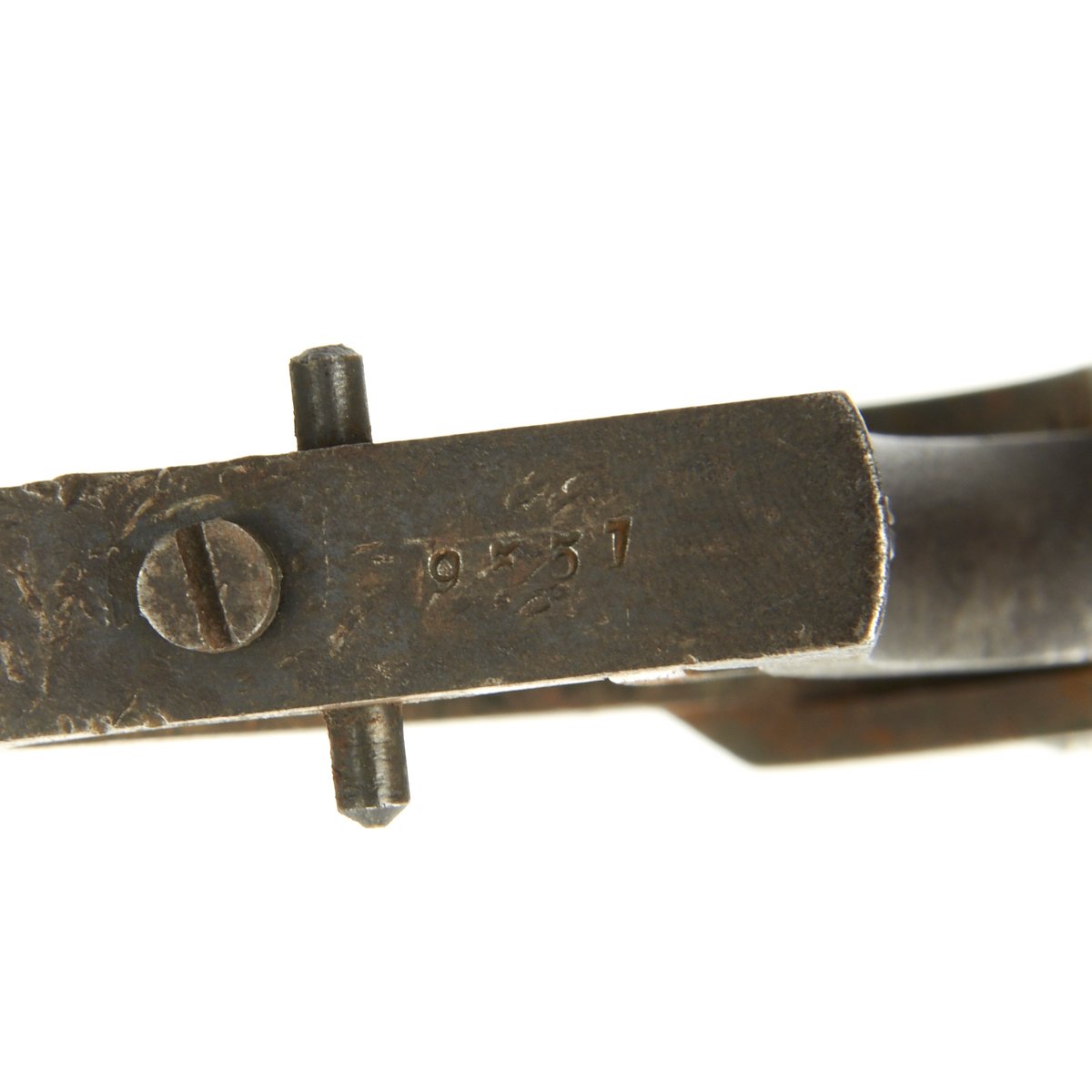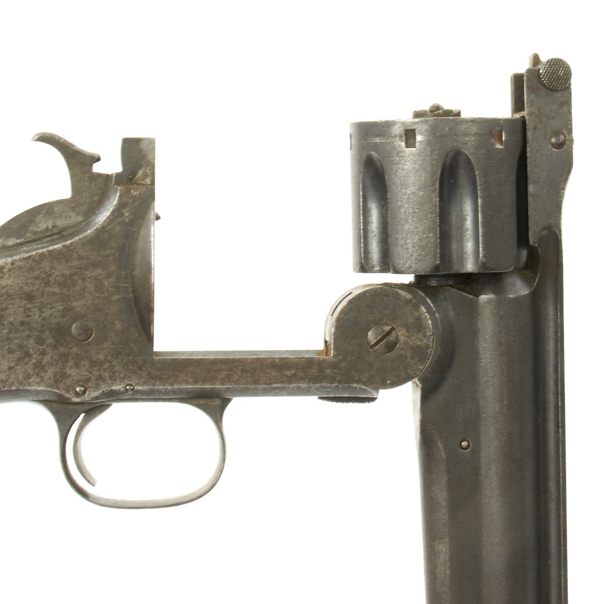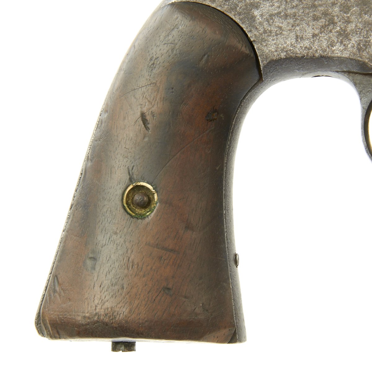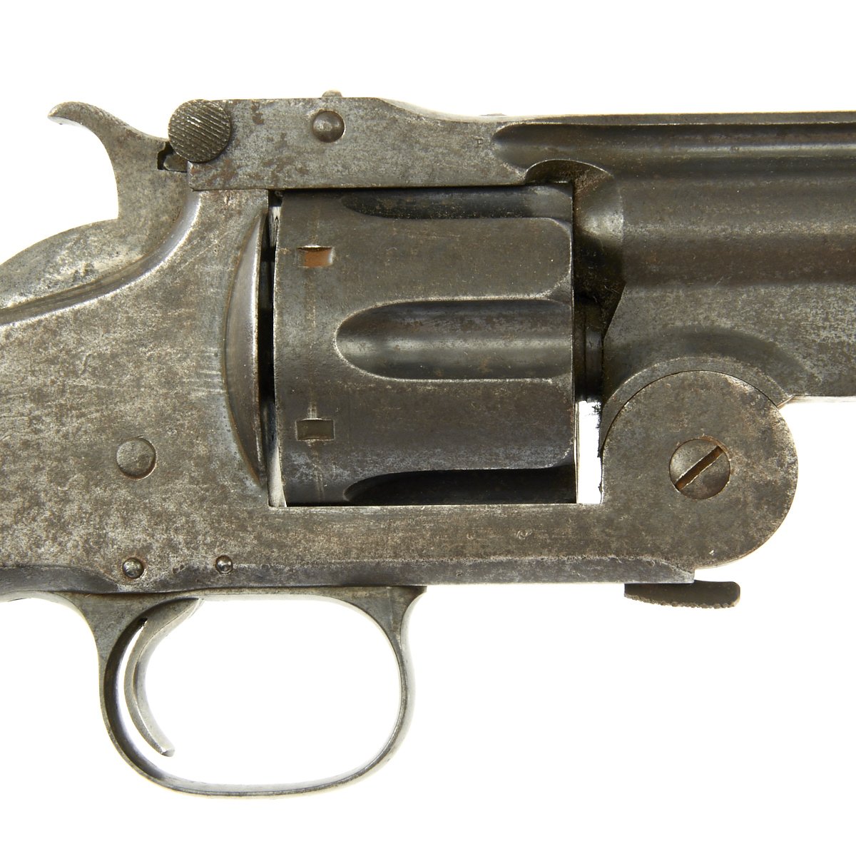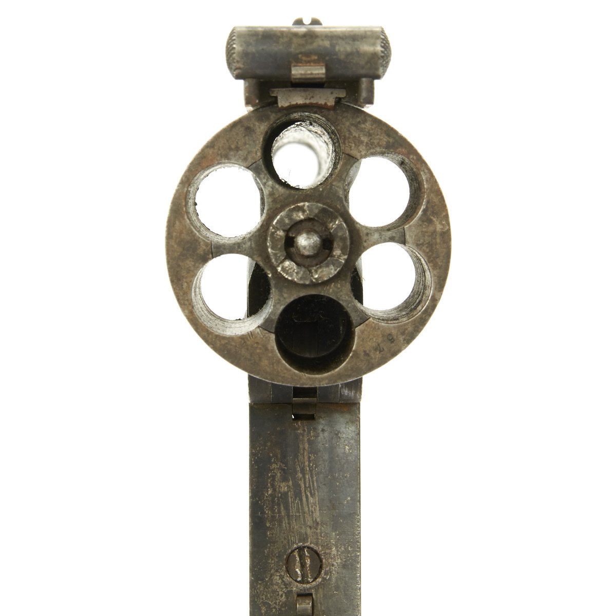 This fine early revolver is offered uncleaned, straight from very long term storage so it is "fresh" to the market. It functions well, with a strong auction and functional spent cartridge ejector. As with any revolver of this age, it can be a bit finicky. The spring for the ejector release is missing, so it must be held forward for ejection to occur. Bore has lands and grooves, though they definitely show wear. This was not a case queen!