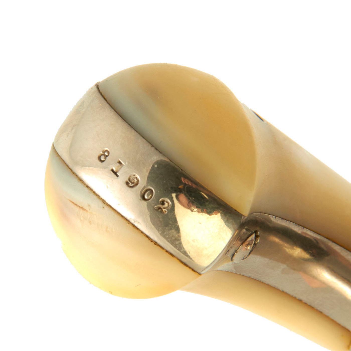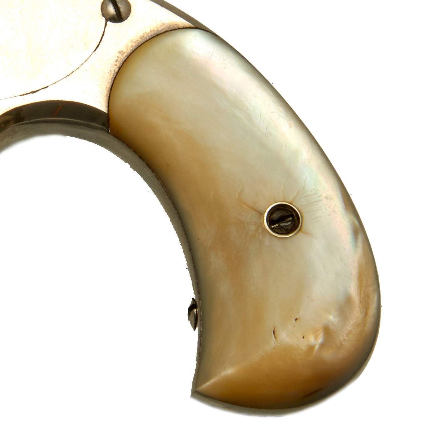 This example Is definitely an upmarket example, with a high quality factory nickel plated finish, with a case hardened hammer and blued frame latch. Additionally, the grips are lovely solid mother of pearl, so this was clearly the revolver of a very fashionable individual. Maybe a "Madam" or an Exotic Dancer? As famous WWII General George S. Patton said once when someone stated that his famous revolvers were "pearl-handled":
