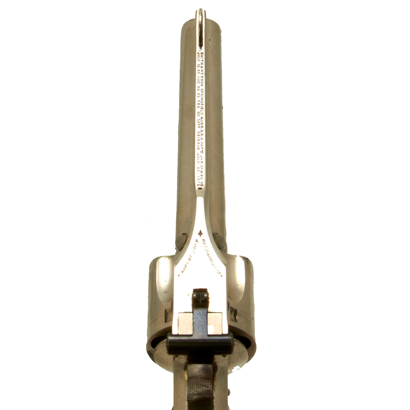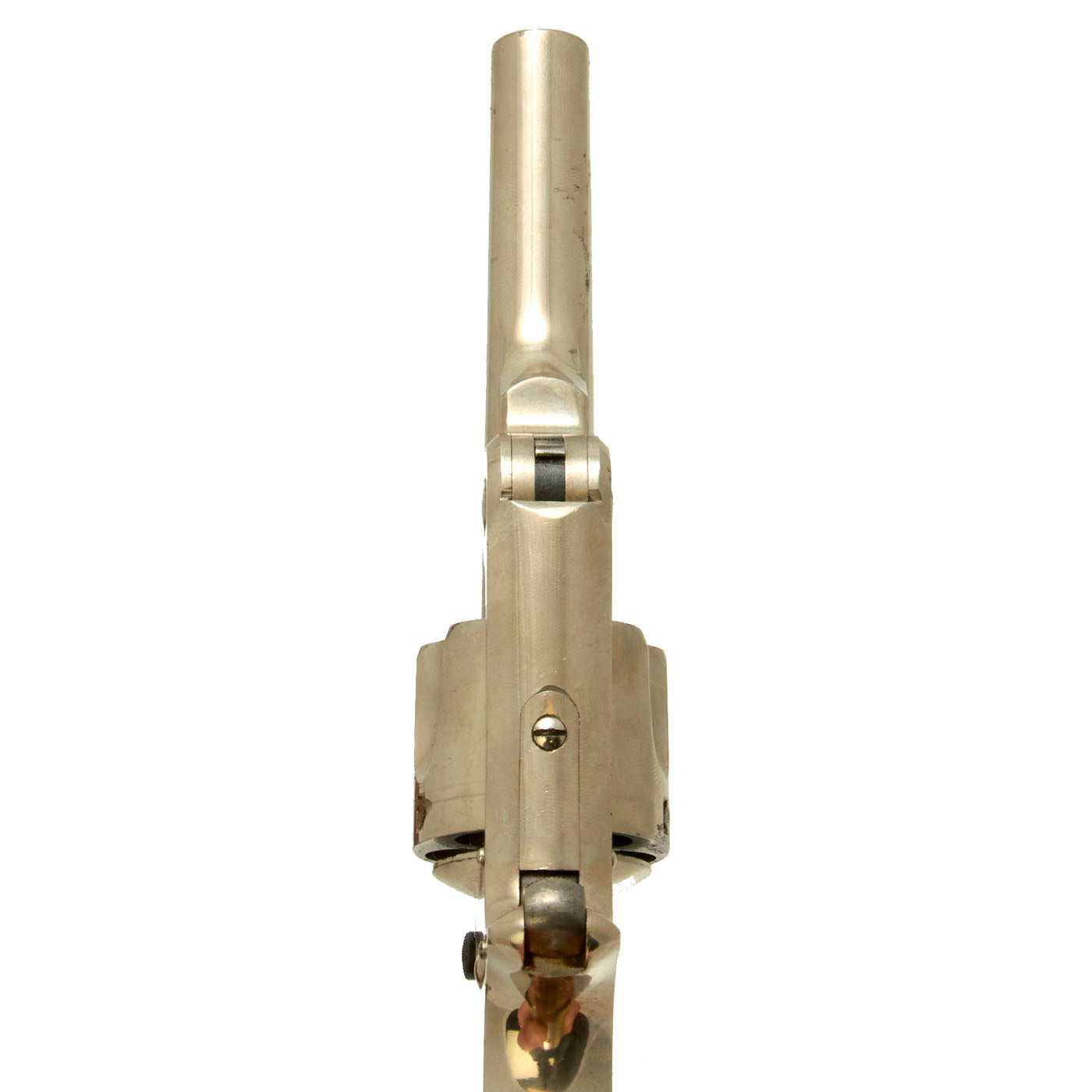 The revolver is in near excellent condition, and probably is the best example that we have ever handled. Almost all of the original nickel plating is retained, with just a few blemishes on the left side of the barrel, and all markings are fully legible, with no wear. The bore is in very good condition, showing little wear and a mostly bright finish, with some areas of light oxidation. The revolver cycles just fine, with no mechanical issues to note.