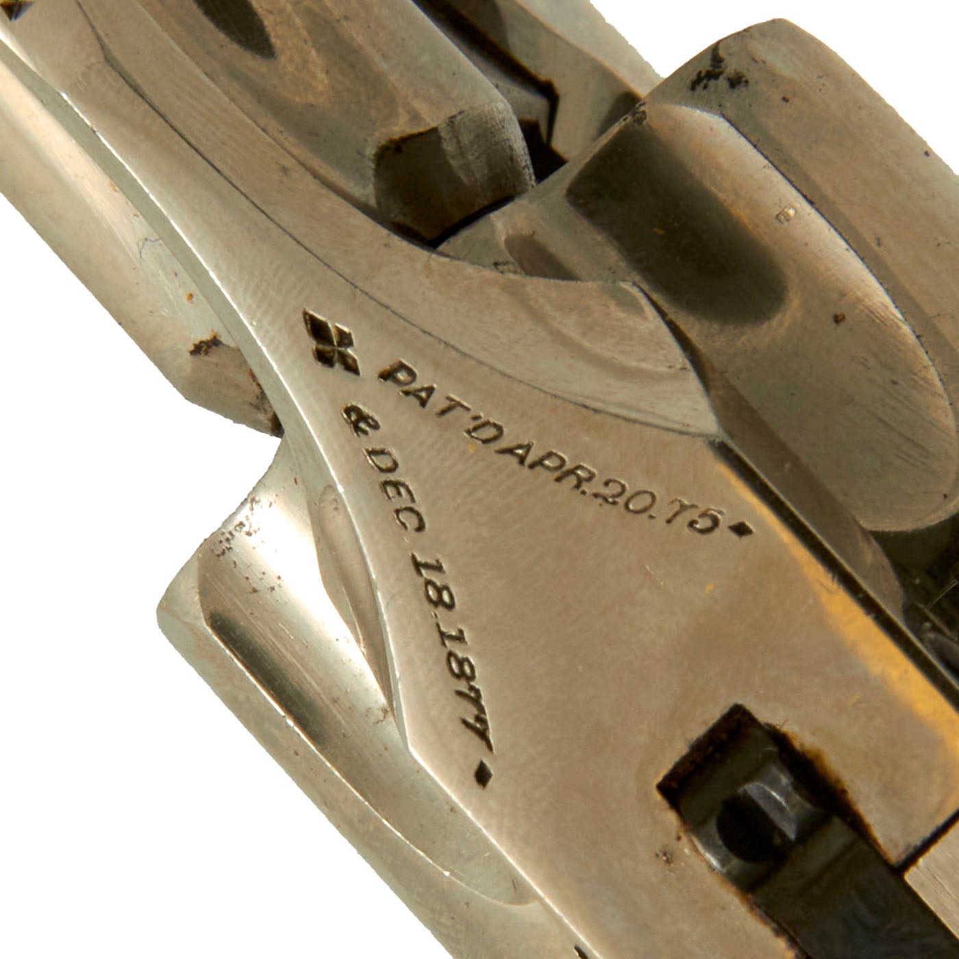 The revolver bears ALL MATCHING serial numbers, with 81902 clearly marked on the cylinder, top latch, barrel, and on the bottom of the grip. The last serial number for this exact model was around 97,500, so we estimate production at 1885, with production ceasing in 1892. All Model 1 1/2 revolvers are pre-1898, and therefor considered antique. It has the full late production patent numbers on the top of the barrel strap still clearly legible: