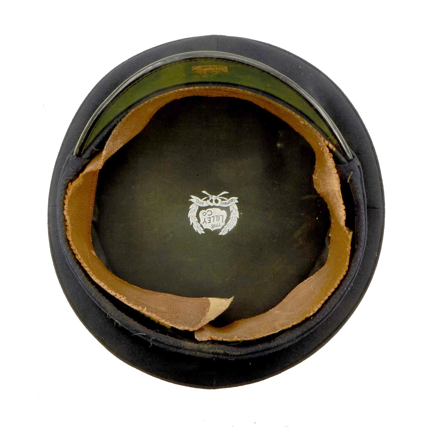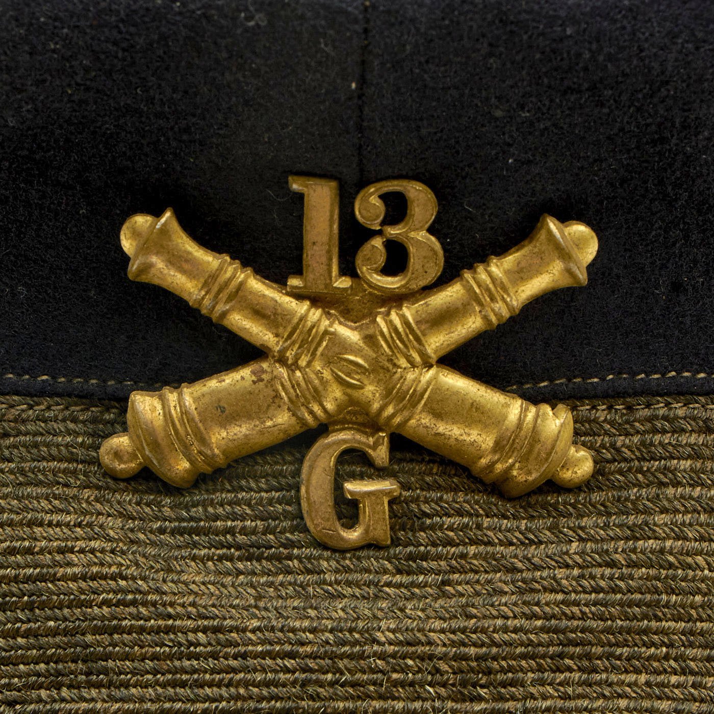 Original item: Only One Available. This is a very nice Spanish American War Era 13th Artillery Regiment "G" Company peaked visor hat in dark Navy Blue. Size is approximately 7 (56 cm). Features a quality screw back "Crossed Cannons" Regimental badge on the front, with 13 over G. The crown lining of the cap shows an excellent condition maker logo: