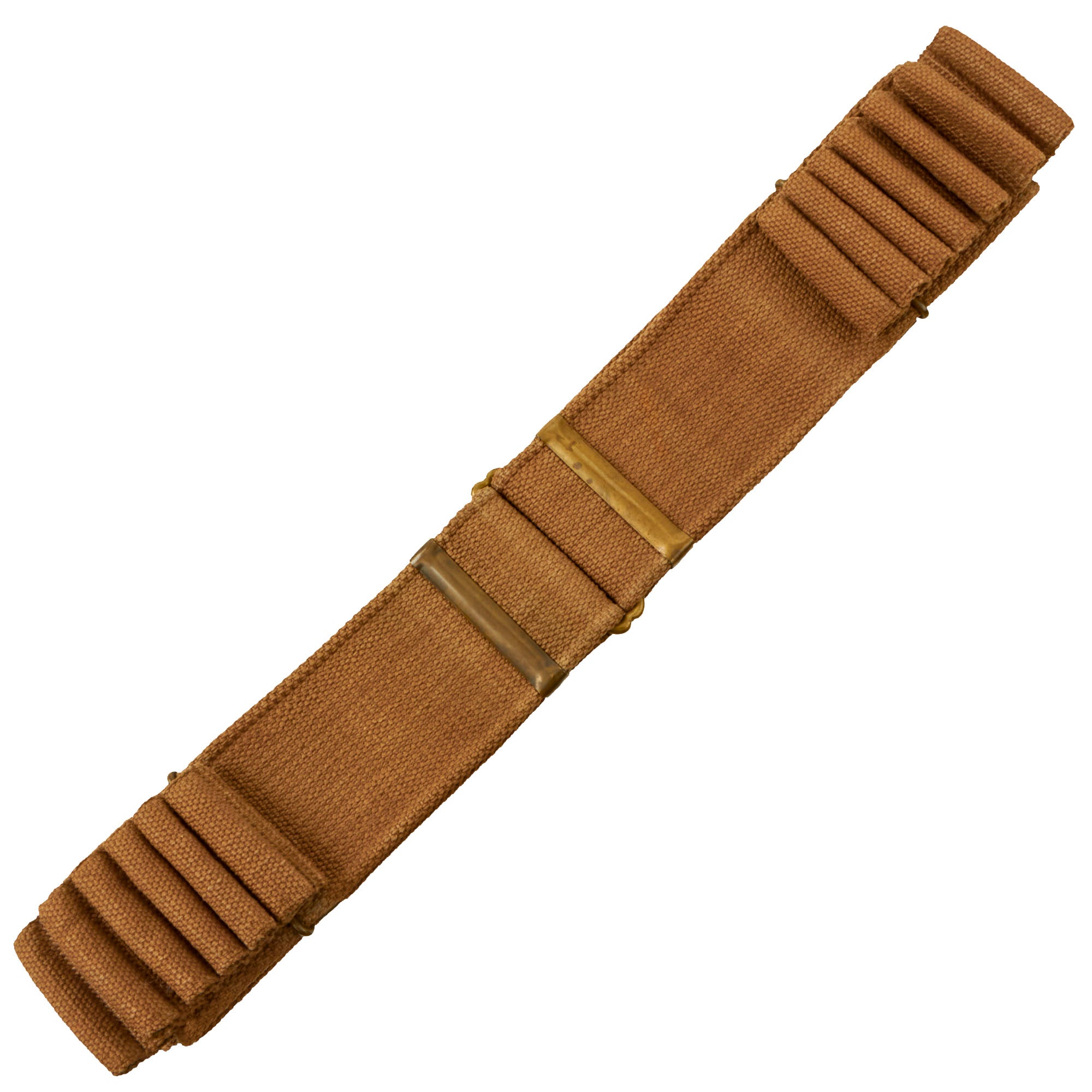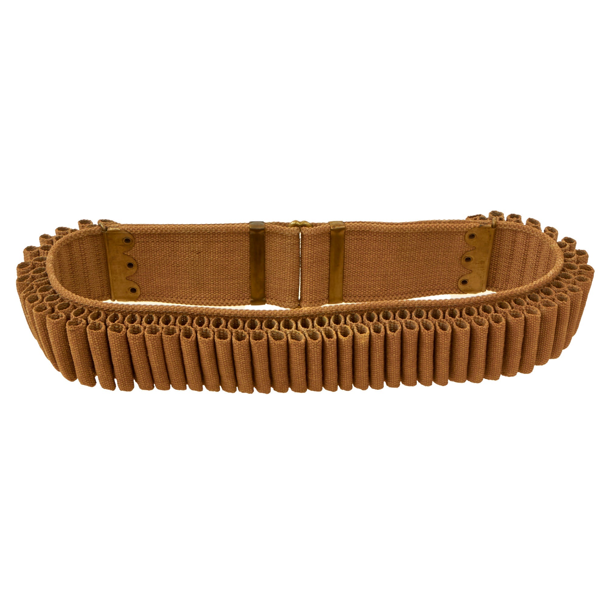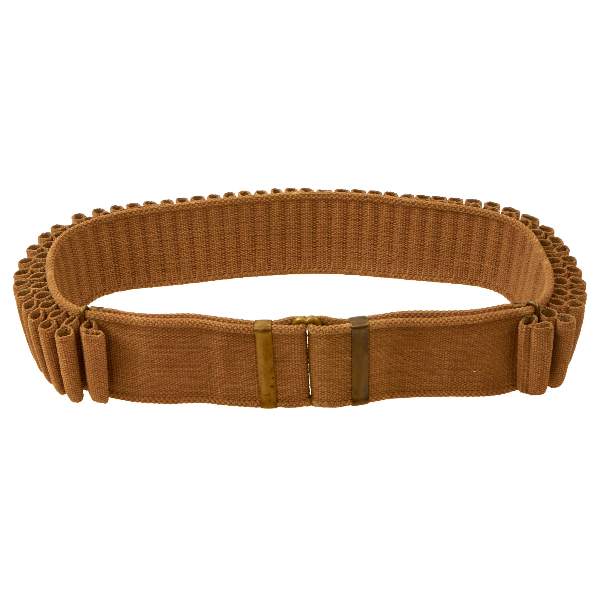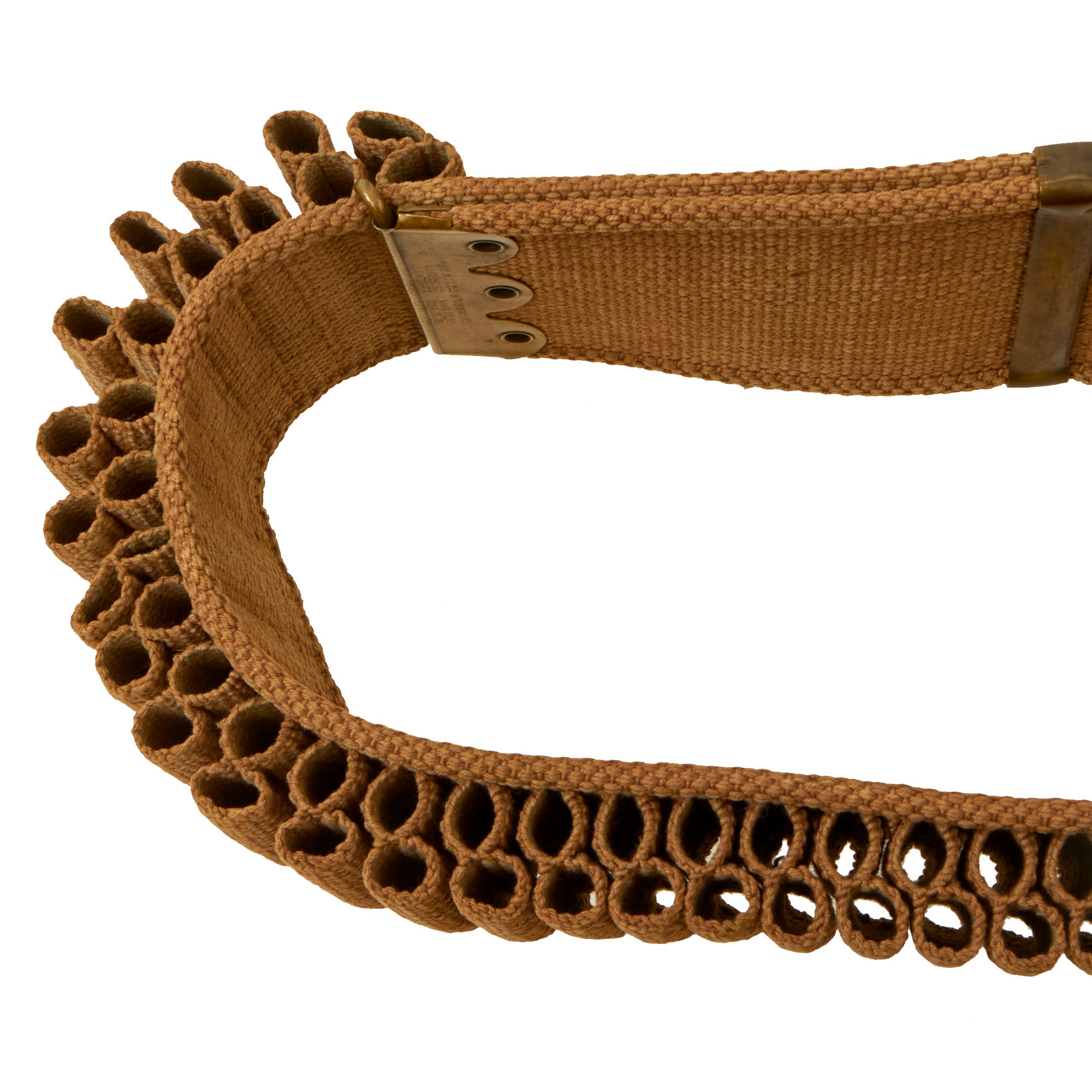 The belt is a khaki web material and double-sleeves, so it has spaces for 100 30/40 Krag cartridges. The web belt is soft and pliable and in fine condition, with no loops missing. This example has no buckle and is taken on and off via the small clip in the center. The tan color has aged well and displays beautifully.
