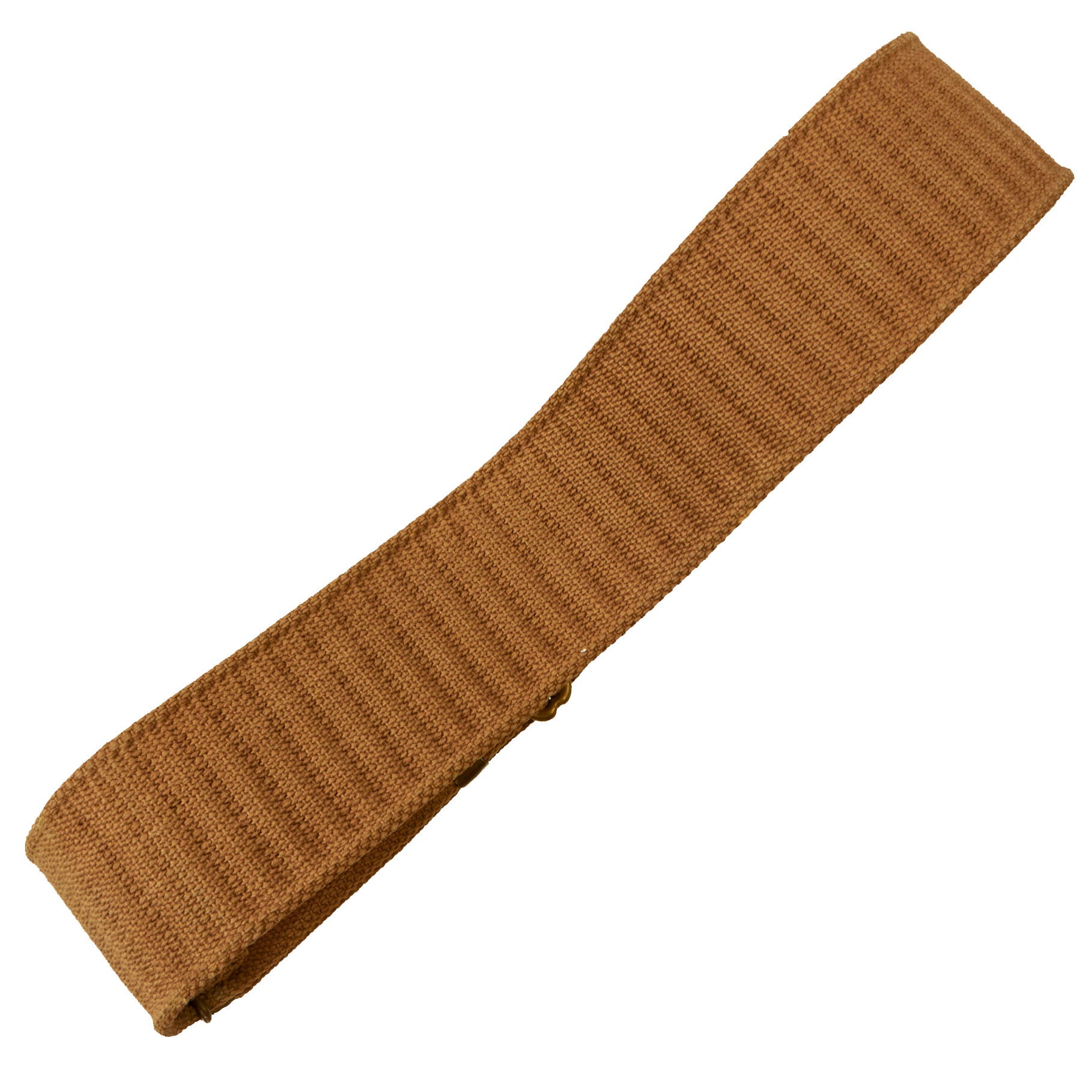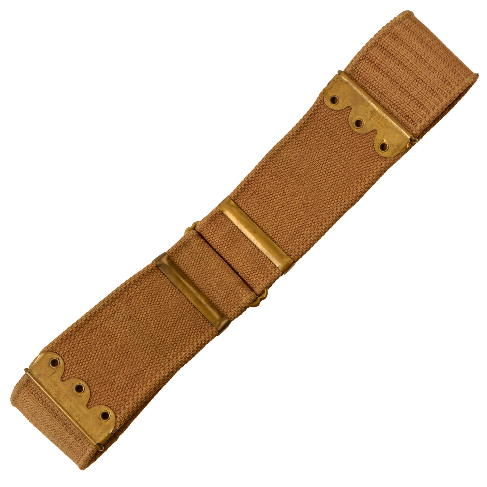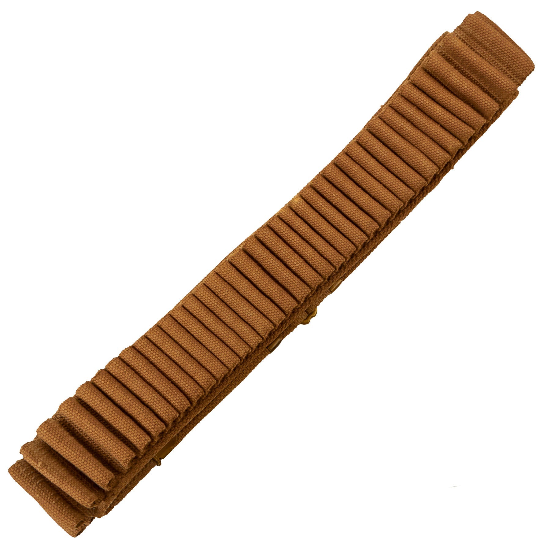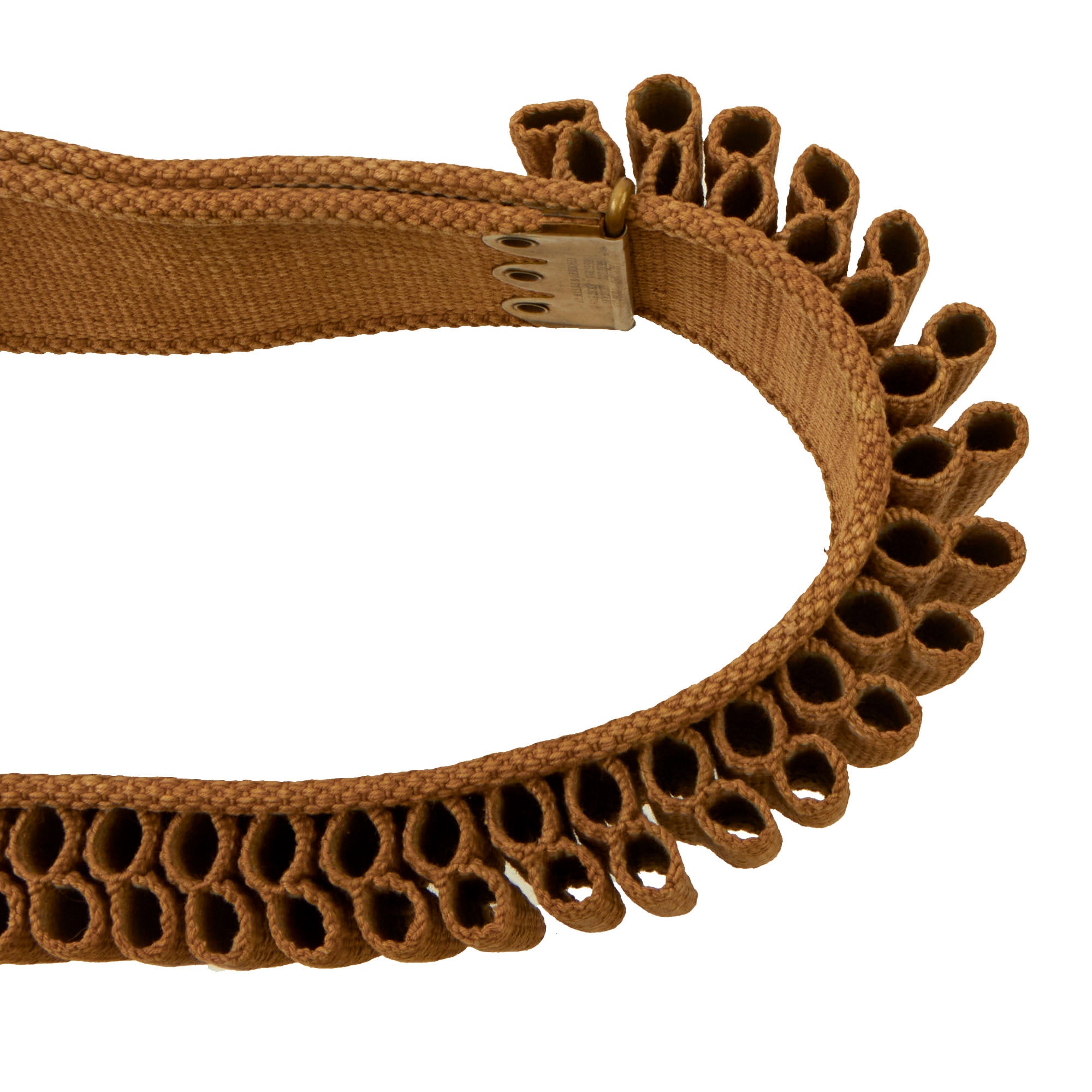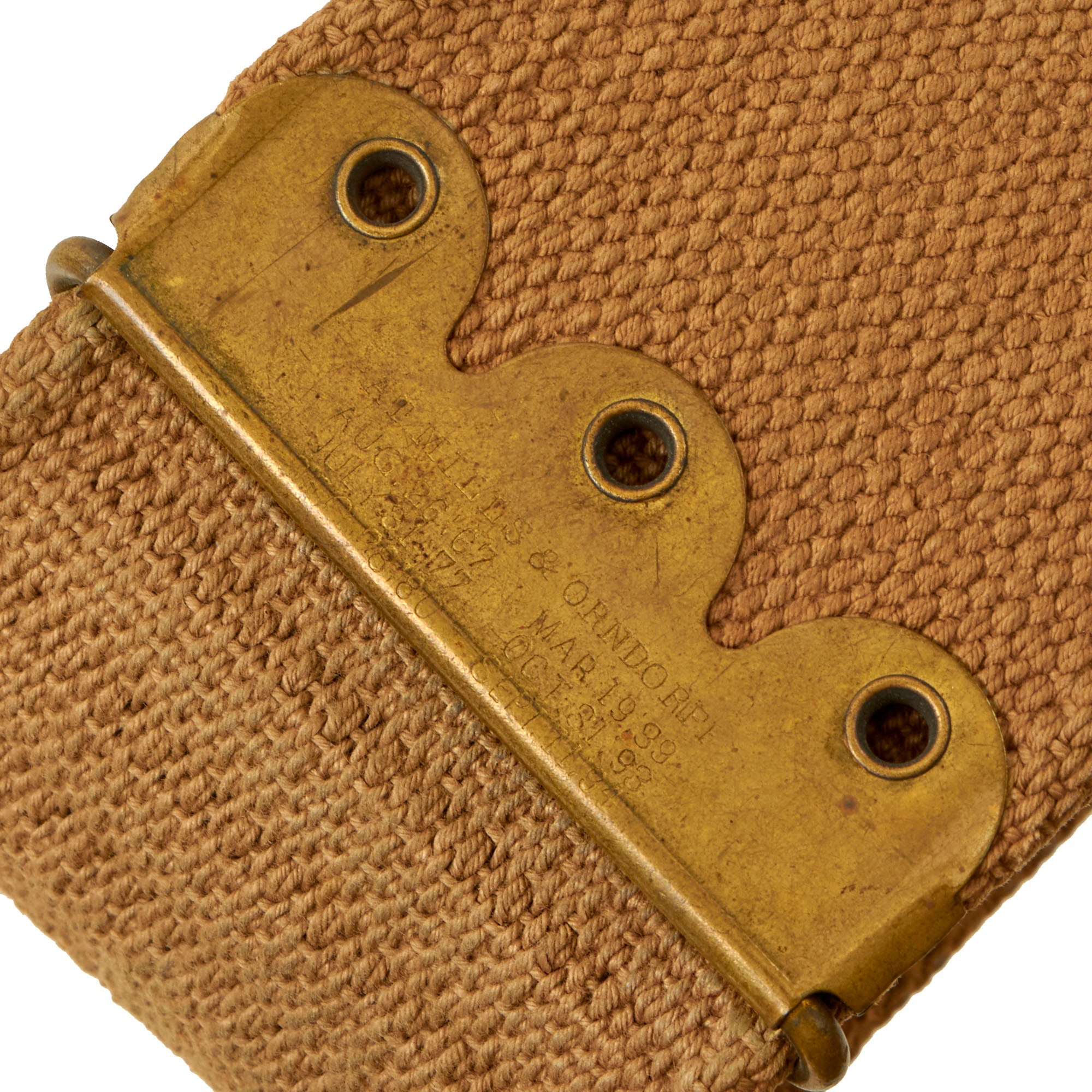 The belt is a khaki web material and double-sleeves, so it has spaces for 100 30/40 Krag cartridges. The web belt is soft and pliable and in fine condition, with no loops missing. This example has no buckle and is taken on and off via the small clip in the center. The tan color has aged well and displays beautifully.