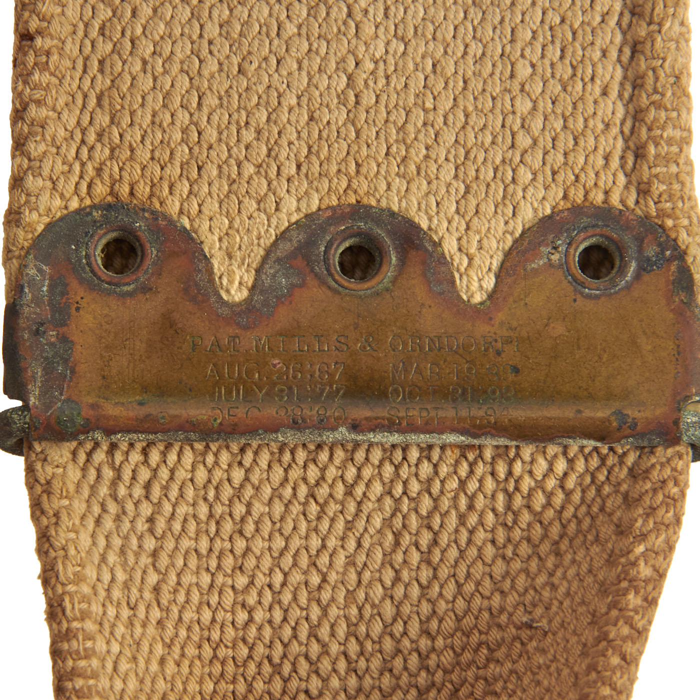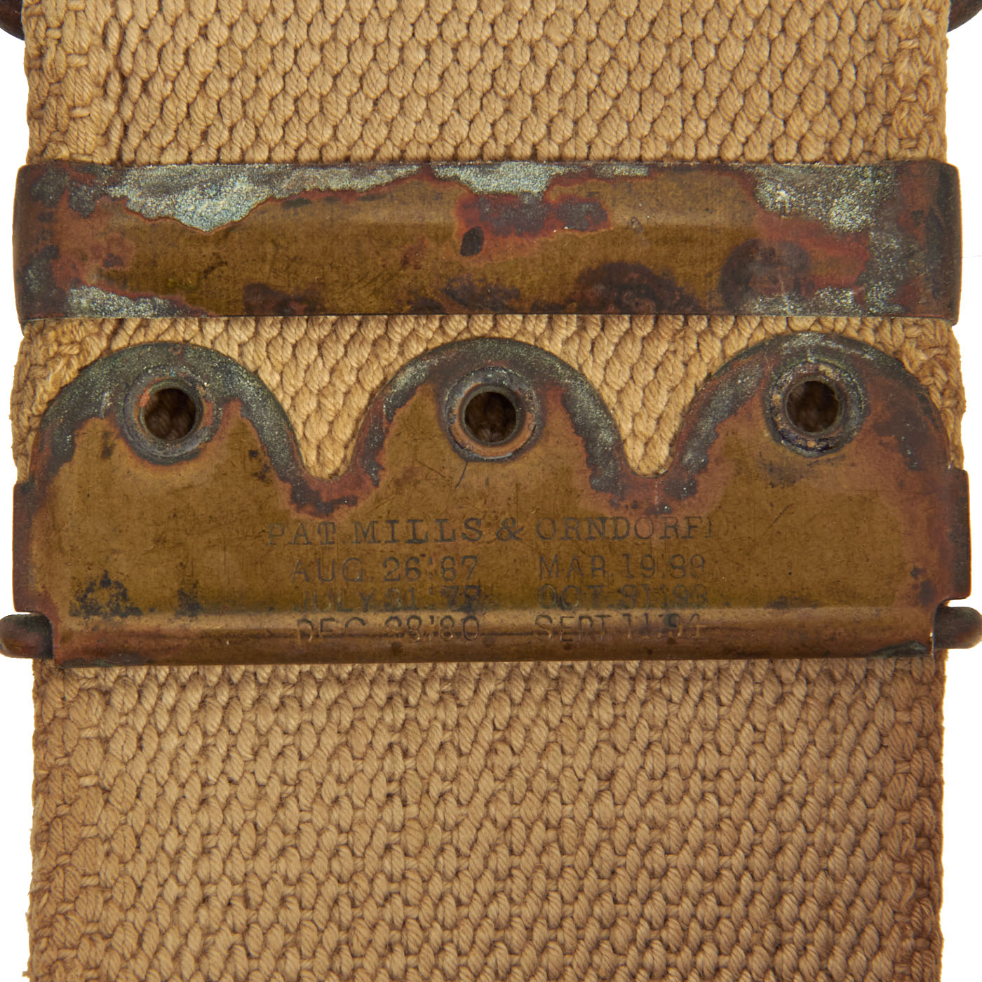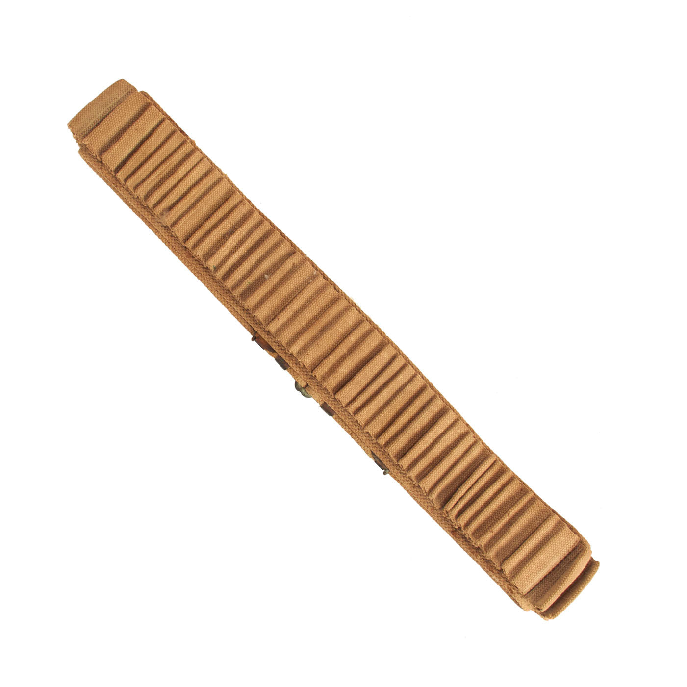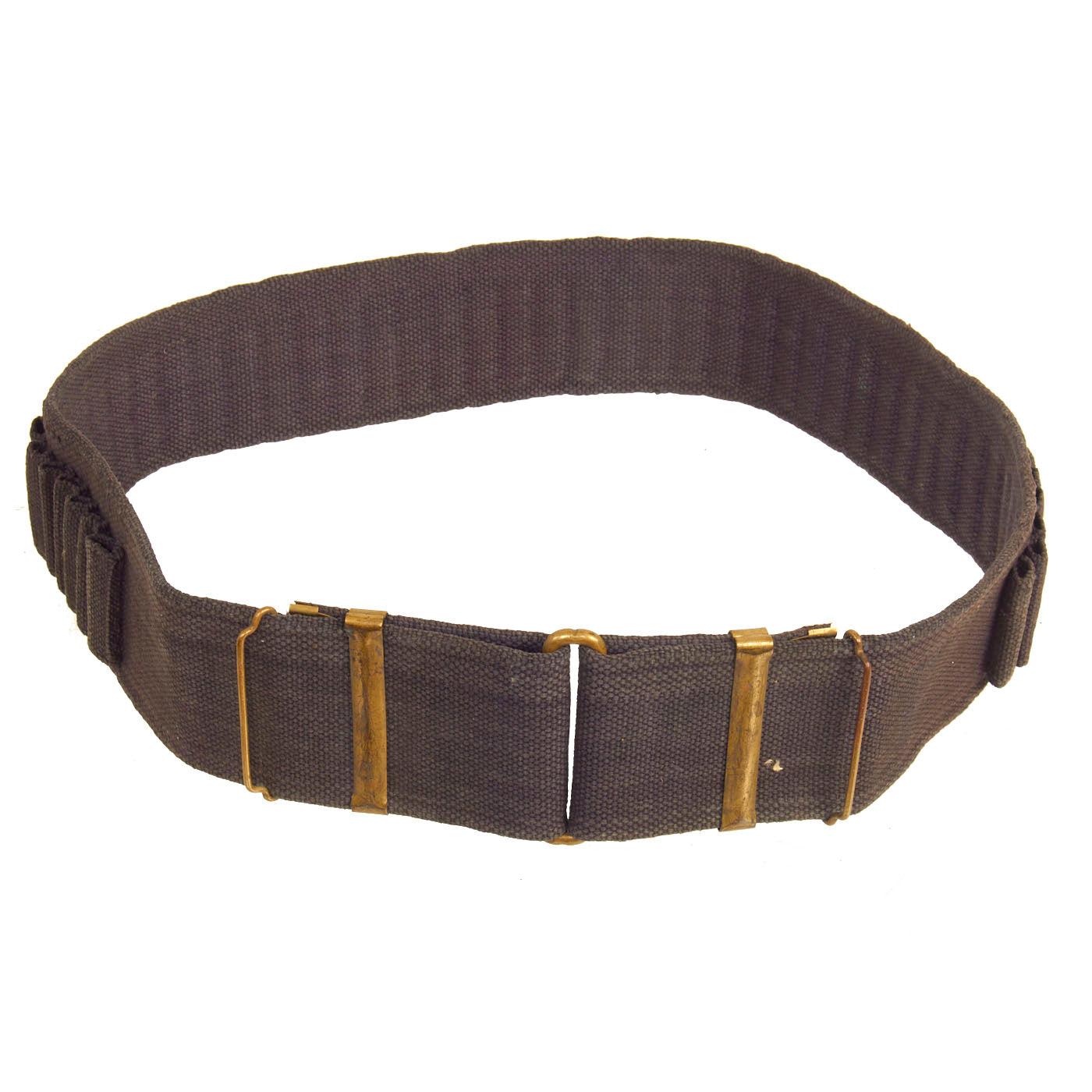 The belt does not have a "buckle", but instead a large split loop, which is used to fasten the two ends of the belt together. All brass has a lovely aged patina. All woven cartridge loops are intact and in very good shape. There are no markings that we can find unfortunately. We do believe this to be a Mills produced one but without a stamp or markings there’s no way to be 100 percent positive.