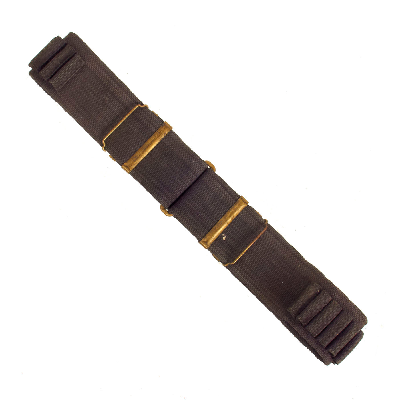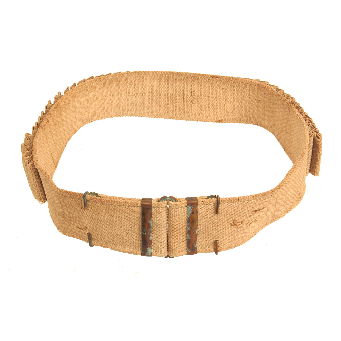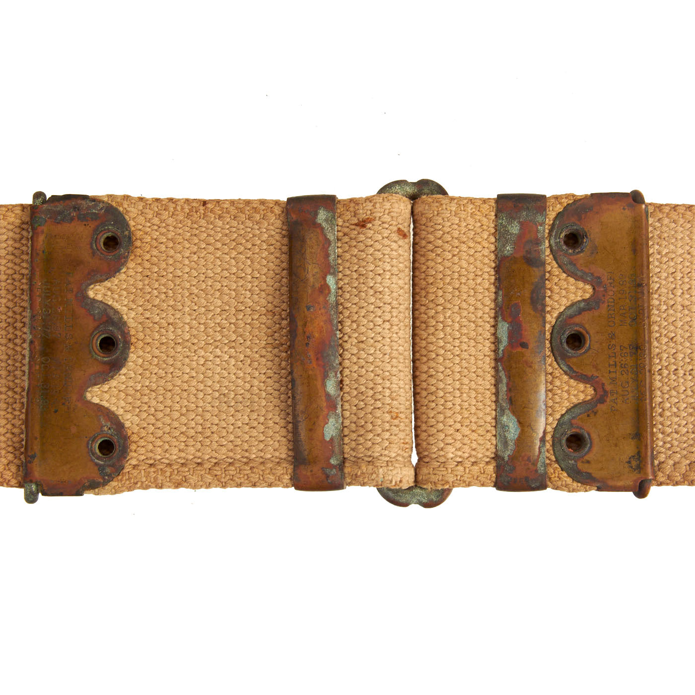 The belt does not have a "buckle", but instead a large split loop, which is used to fasten the two ends of the belt together. All brass has a lovely aged patina. All woven cartridge loops are intact and in very good shape. There are no markings that we can find unfortunately. We do believe this to be a Mills produced one but without a stamp or markings there’s no way to be 100 percent positive.