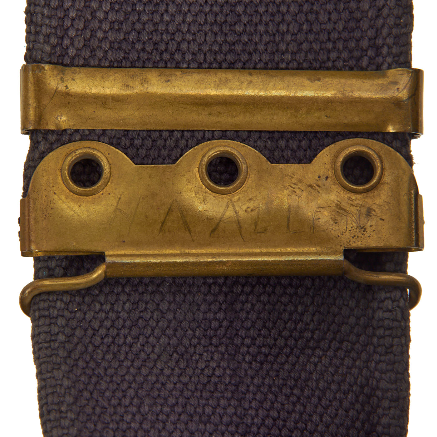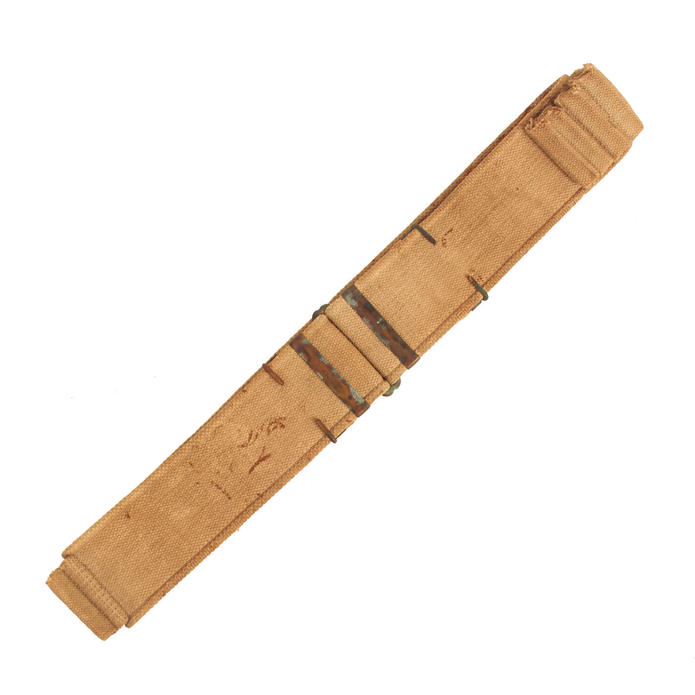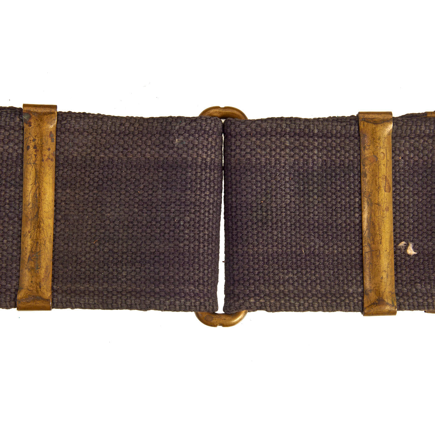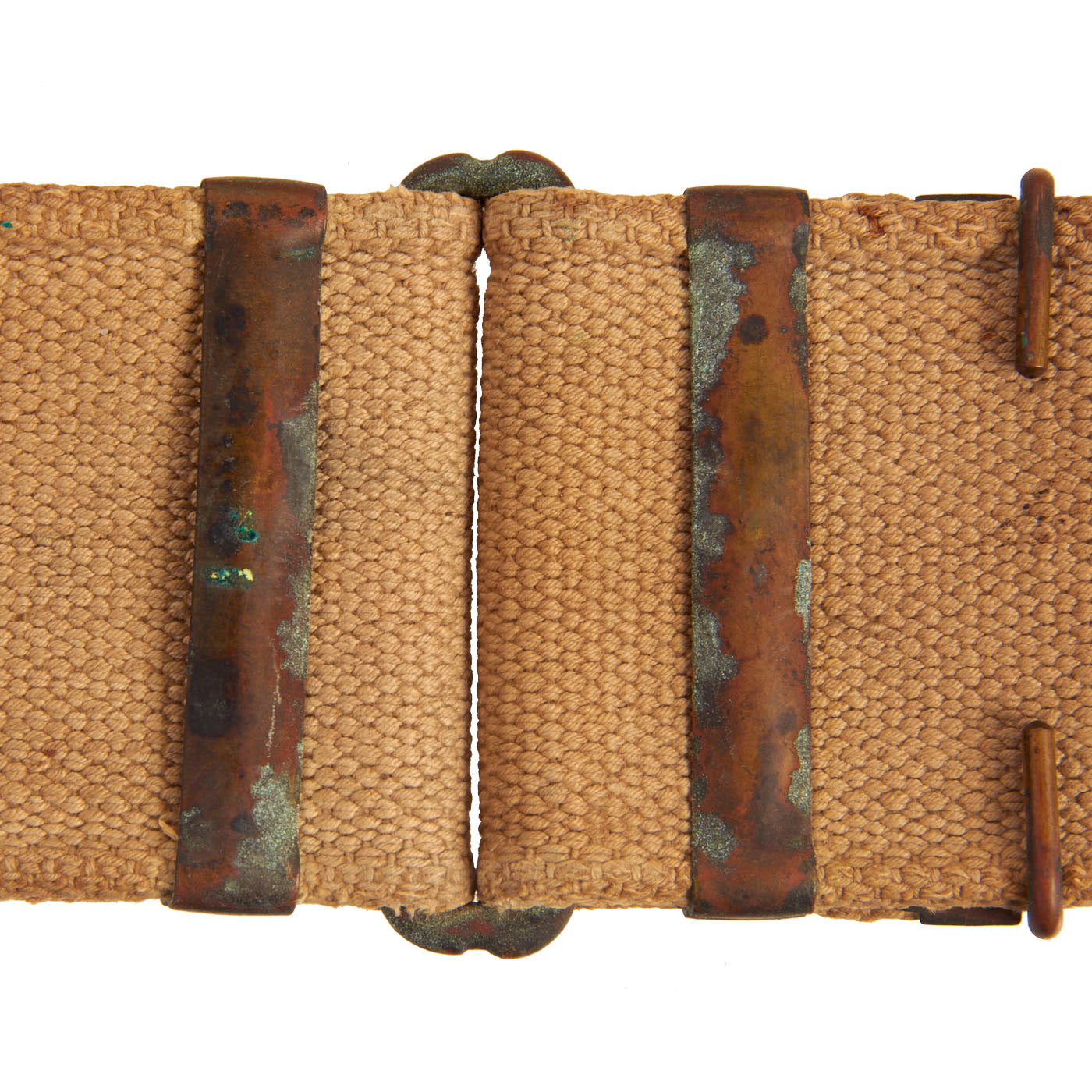 The belt does not have a "buckle", but instead a large split loop, which is used to fasten the two ends of the belt together. All brass has a lovely aged patina. All woven cartridge loops are intact and in very good shape. There are no markings that we can find unfortunately. We do believe this to be a Mills produced one but without a stamp or markings there’s no way to be 100 percent positive.