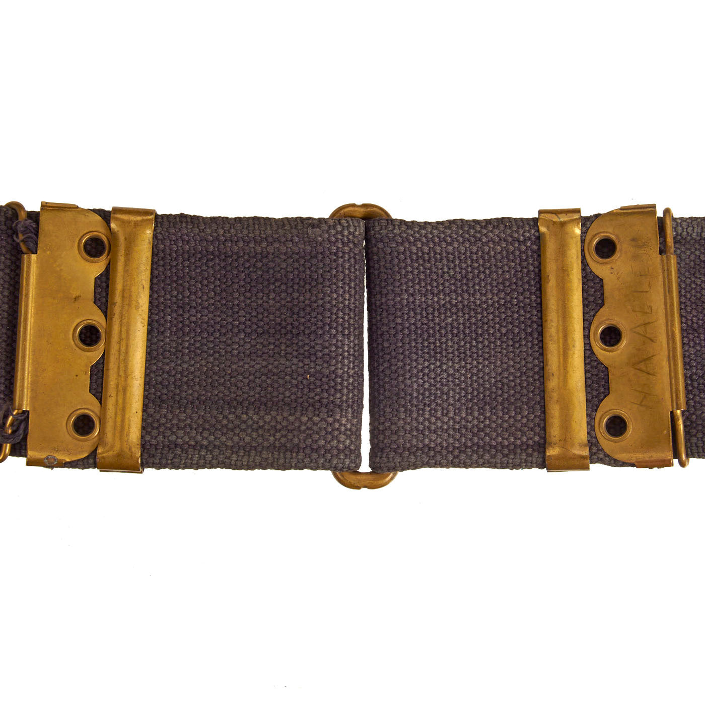 The belt does not have a "buckle", but instead a large split loop, which is used to fasten the two ends of the belt together. All brass has a lovely aged patina. All woven cartridge loops are intact and in very good shape. The brass does have clear markings on them: