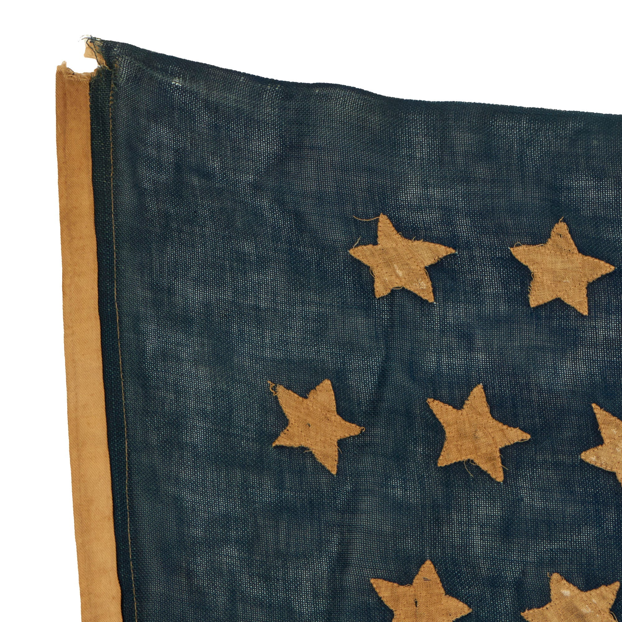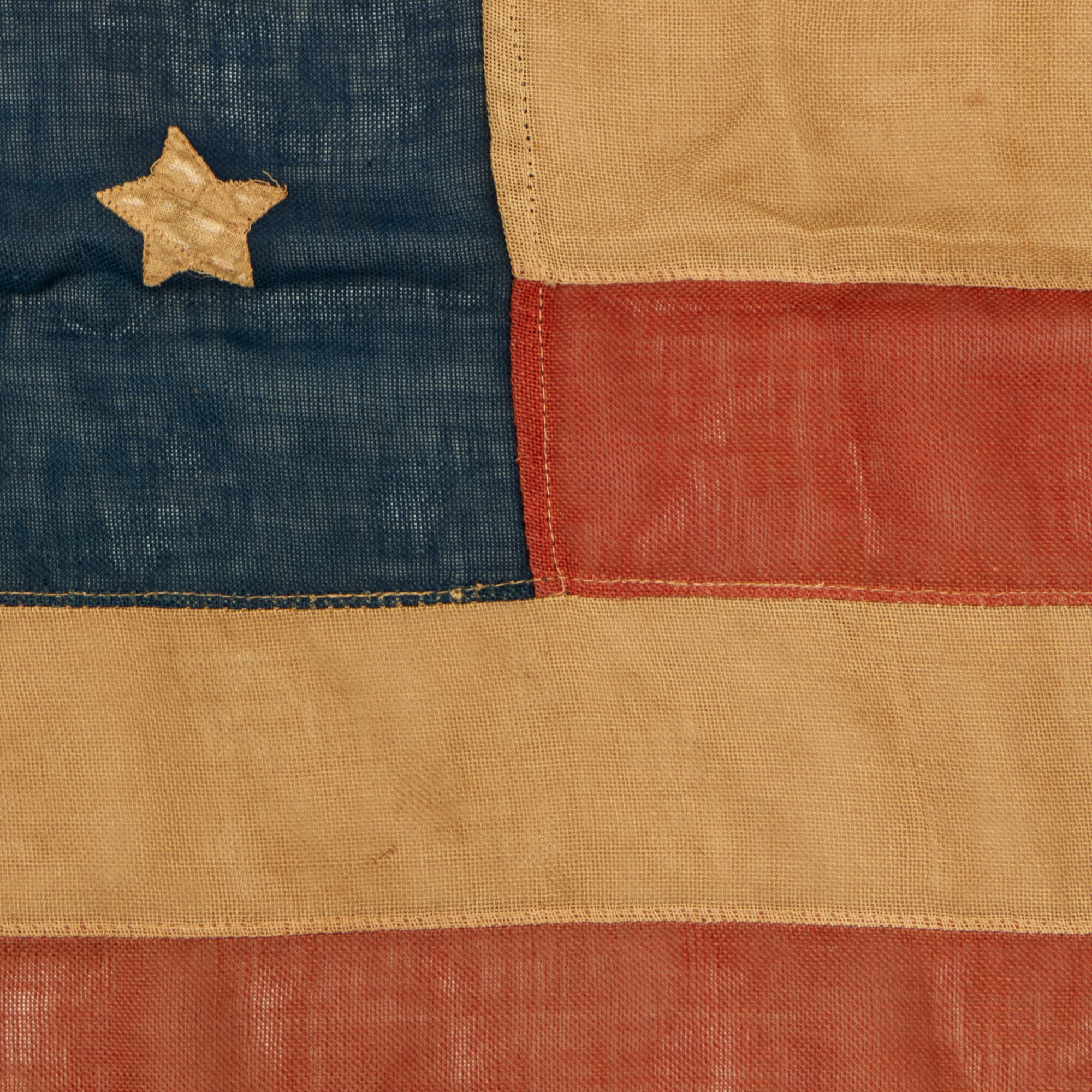 The flag is in fair condition considering that it is over 100 years old, but has some serious condition issues. Time and wear have led to fraying and holes in the wool body, and the colors have heavily faded over time as well. There are no maker-marks on the header, and one of the grommets is missing.