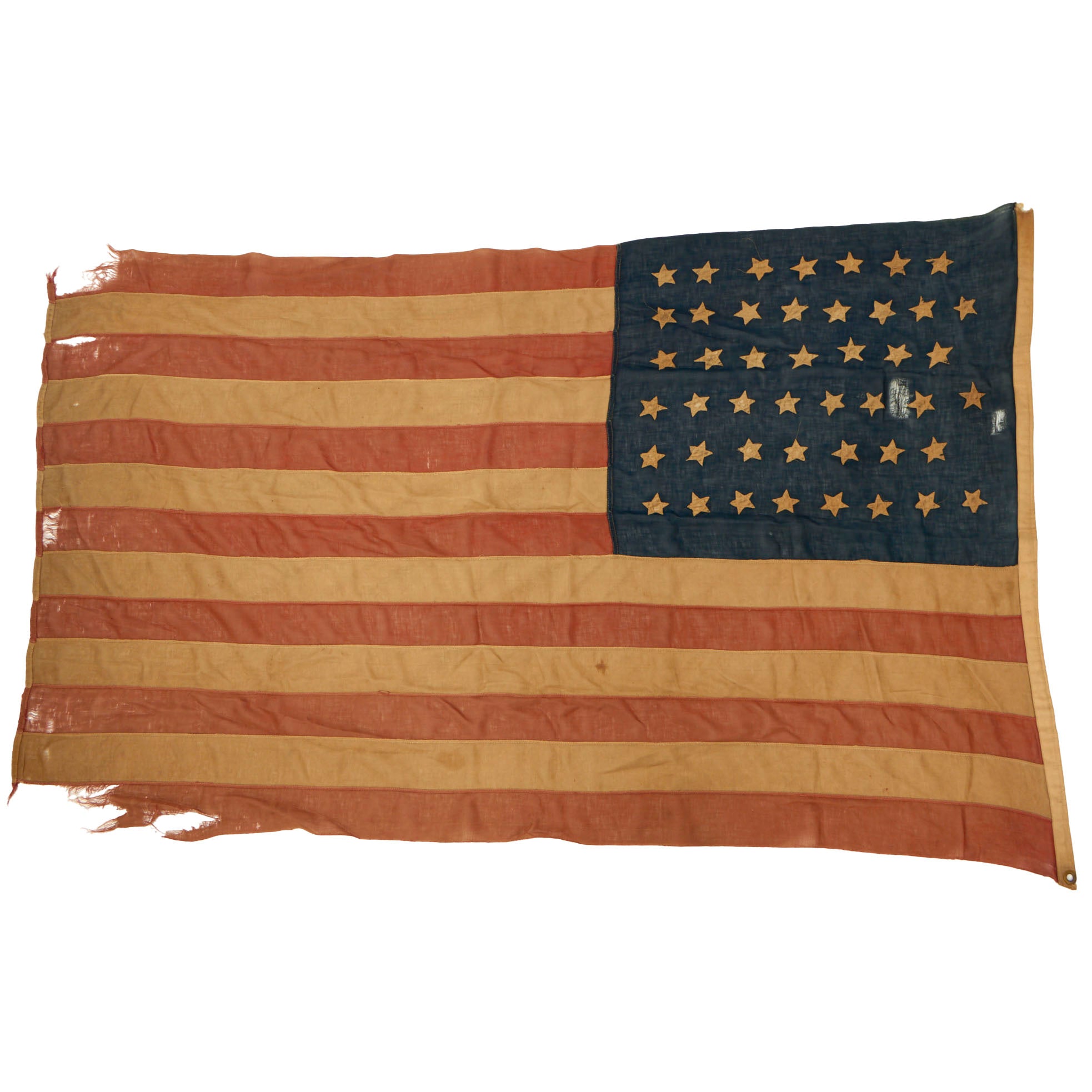 Original Item: Only One Available. This is a very nice but well-worn Spanish American War 45 Star American Flag, in a nice displayable roughly 46” x 70” size. This design of the flag was in use from July 4, 1896 to July 3, 1908, when Oklahoma was officially made part of the country. The flag body is of multi-piece wool construction, with the canvas stars sewn on, with a white canvas header that is missing one of the grommets. There is some material loss at several points on the flag, and this example would look best framed. The corners show the heaviest wear with some tearing in the dark blue canton material.