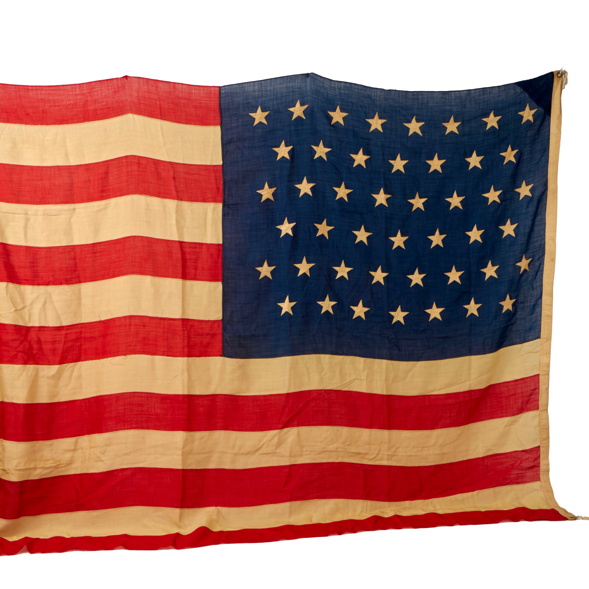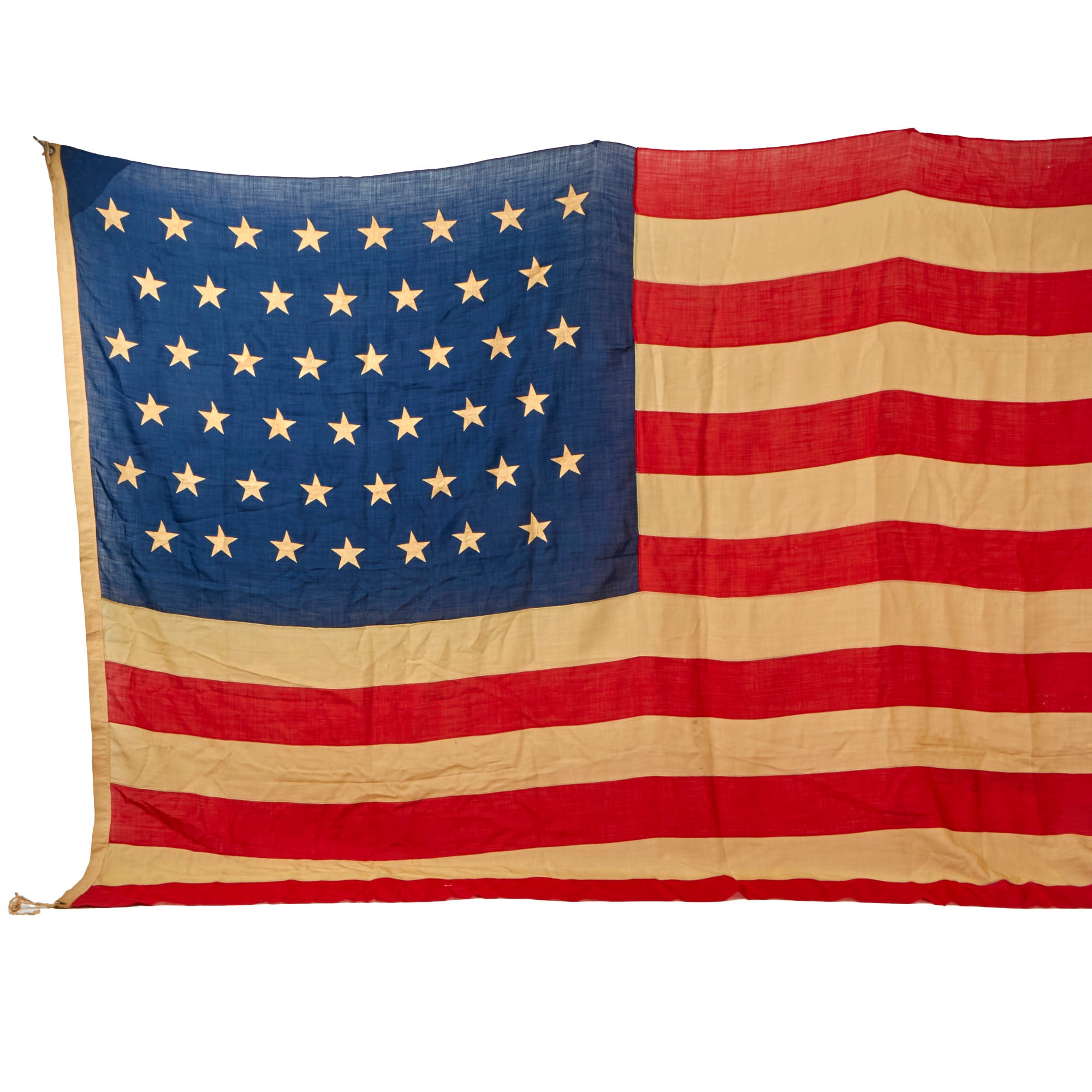 Original Item: Only One Available. This is a very nice Spanish American War 45 Star American Flag, in a nice displayable 73” x 116” size. This design of the flag was in use from July 4, 1896 to July 3, 1908, when Oklahoma was officially made part of the country. The flag body is of multi-piece wool construction, with the canvas stars sewn on, with a white canvas header and plated brass grommets on the top and bottom corners of the hoist side.