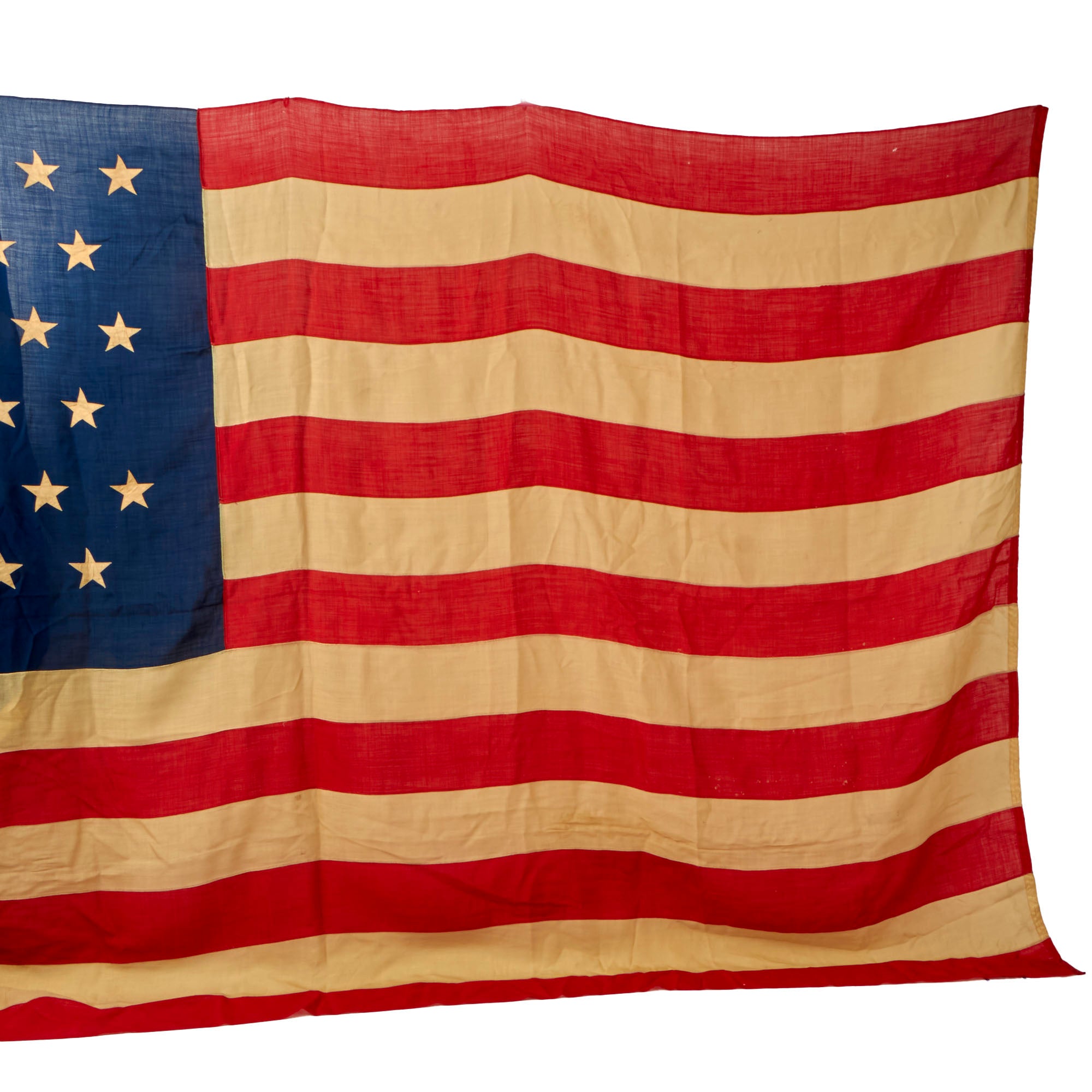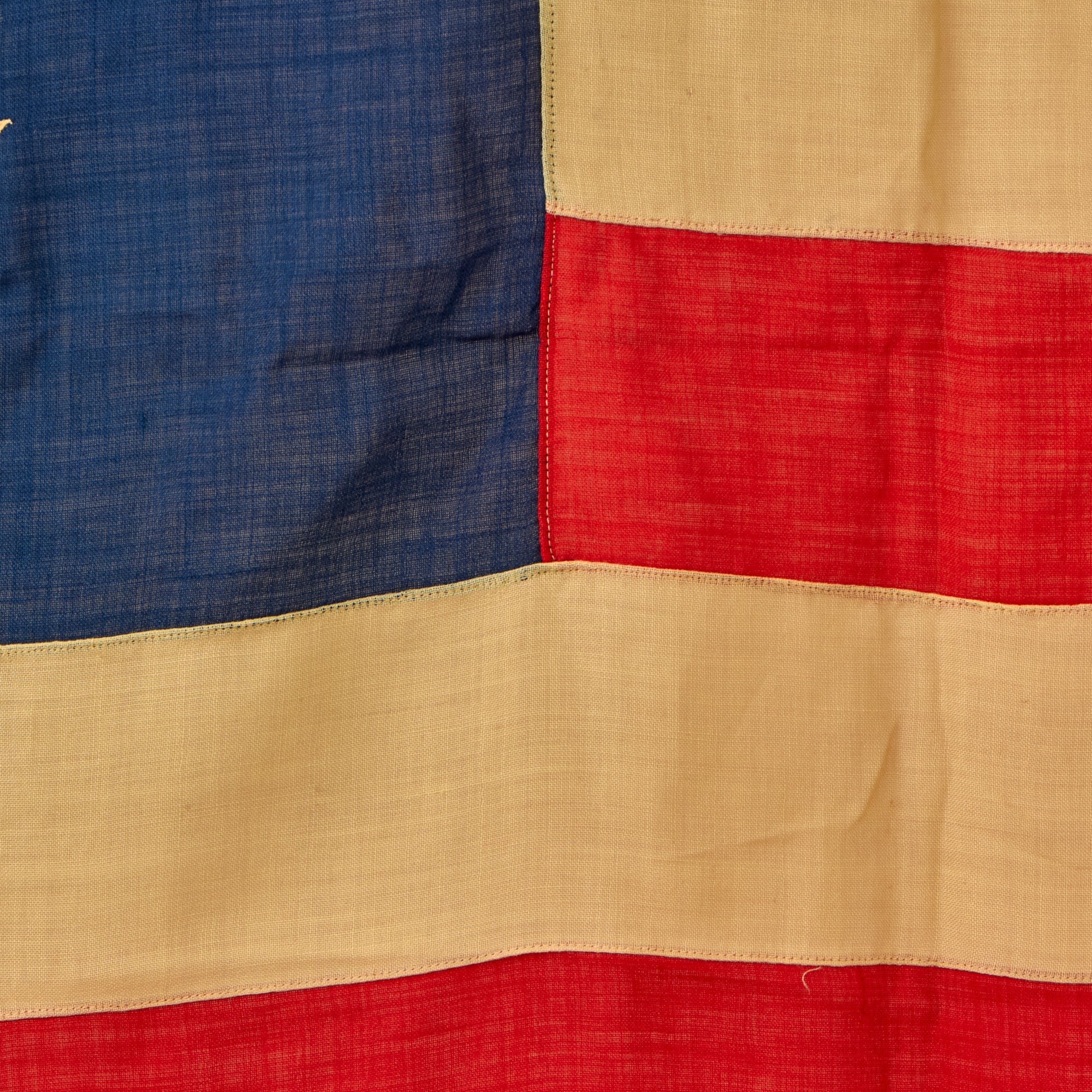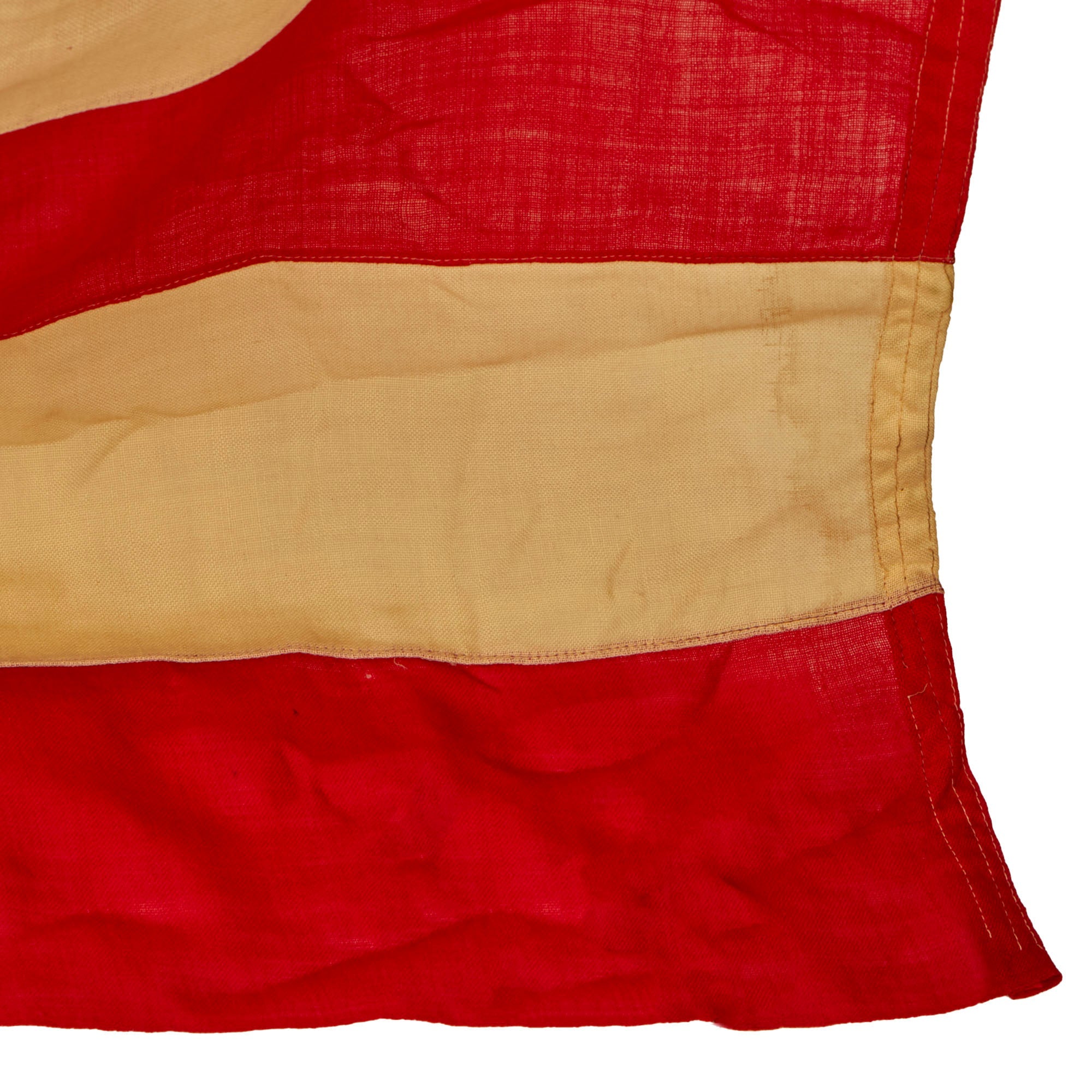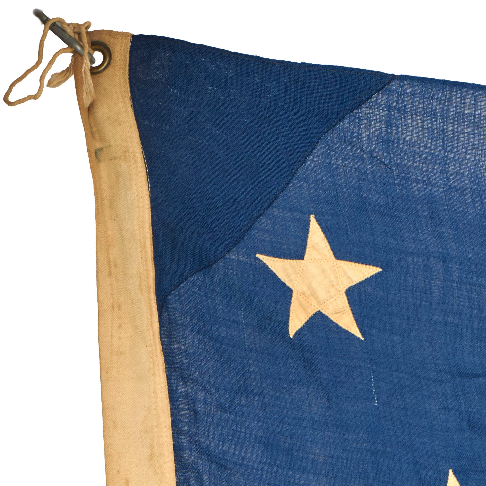 The general rule of thumb is that cotton flags were issued during WWII and nylon flags were issued during the Korean War. Flags made prior to WWII were made of a wool blend. This flag is made from multiple pieces of fabric, with sewn on white stars and zinc grommets.
