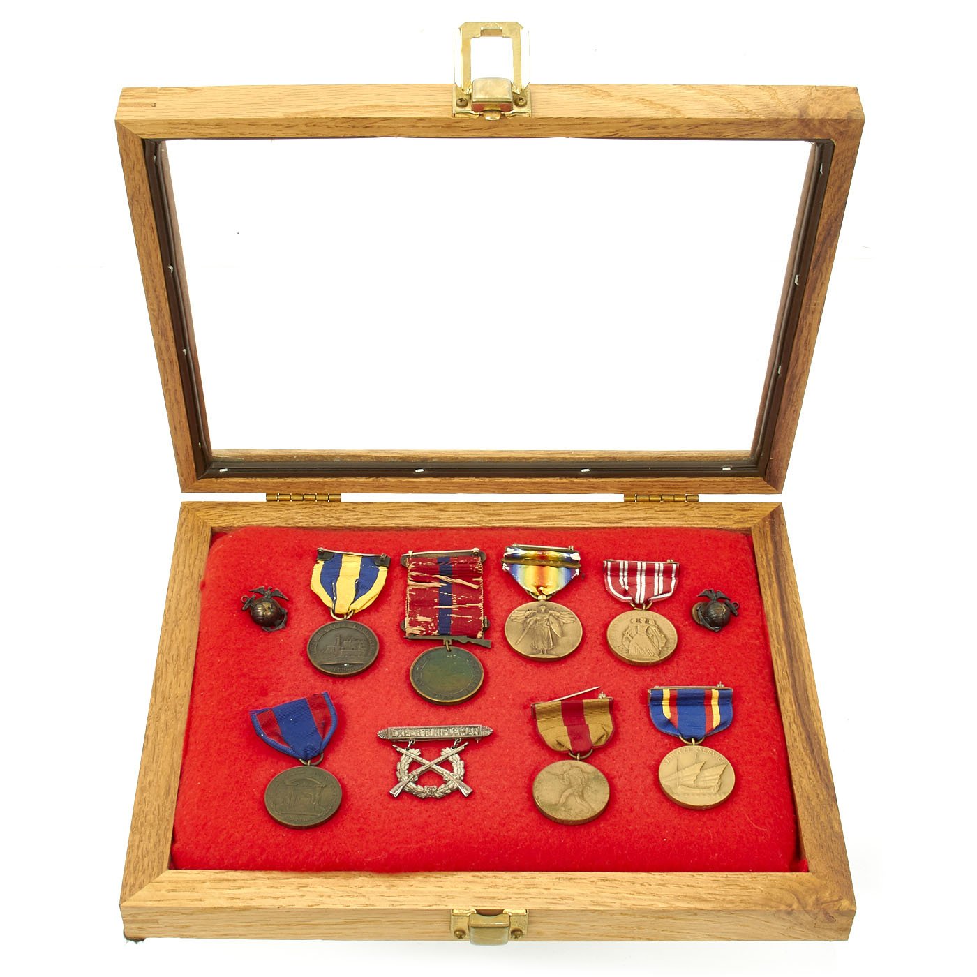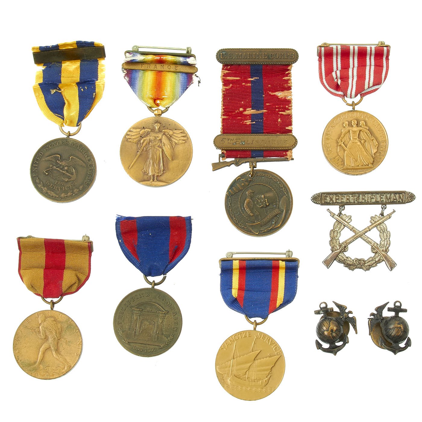Original Items: One-of-a-kind Collection. United States Marine Corps Service Member John F. Evans served before, during, and after the Great War. The medals and pins in this set belonged to him and include: