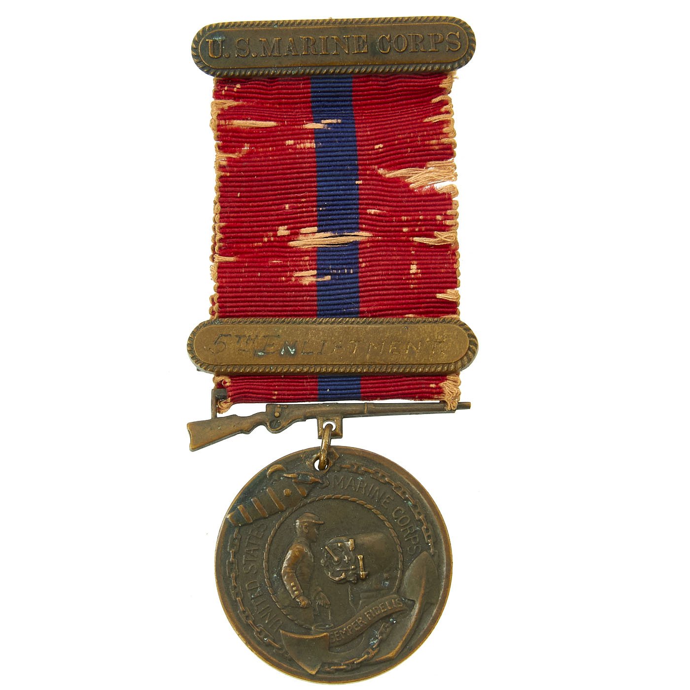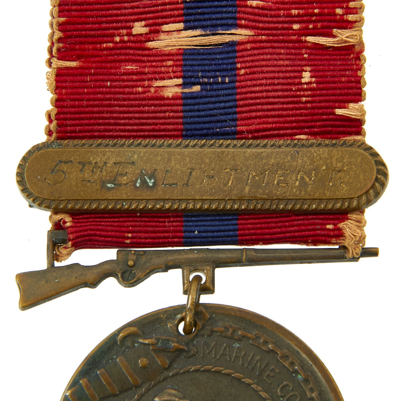 - Original WWI USMC Good Conduct Medal with original ribbon and 5th Enlistment bar, the medal is engraved: