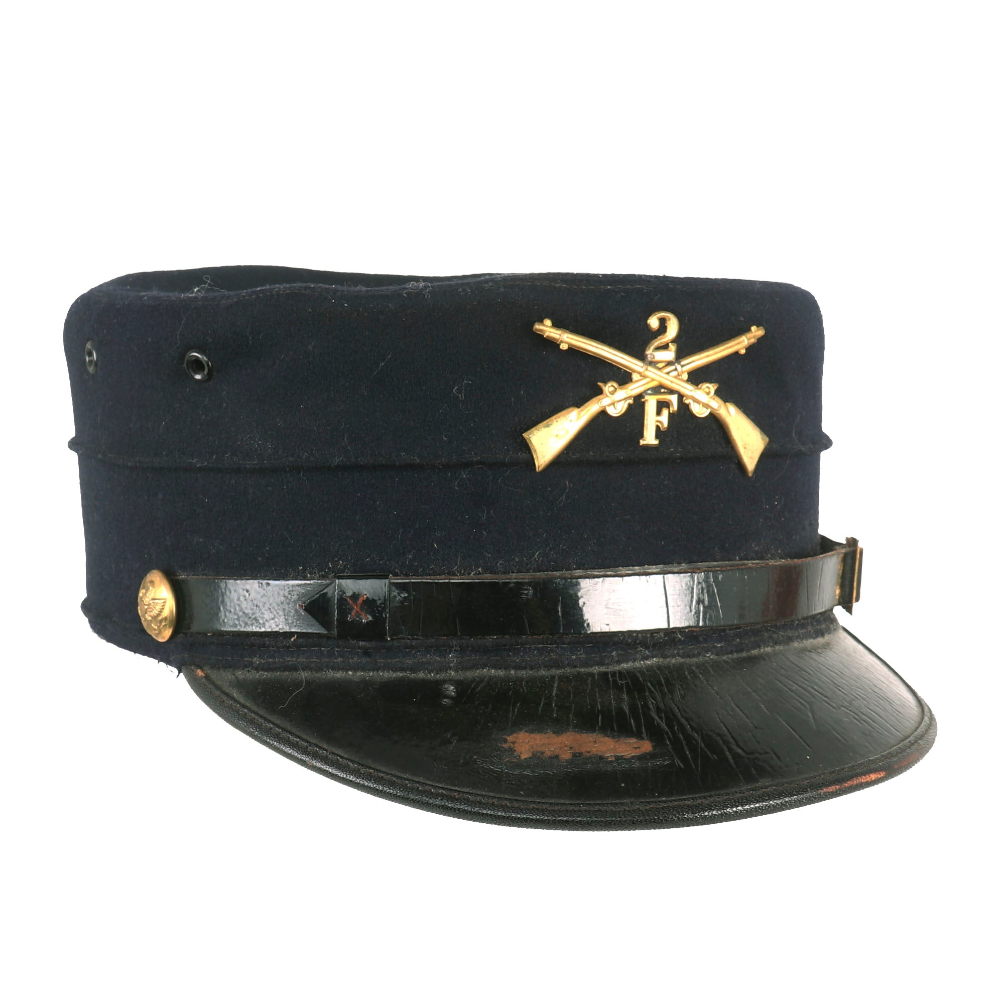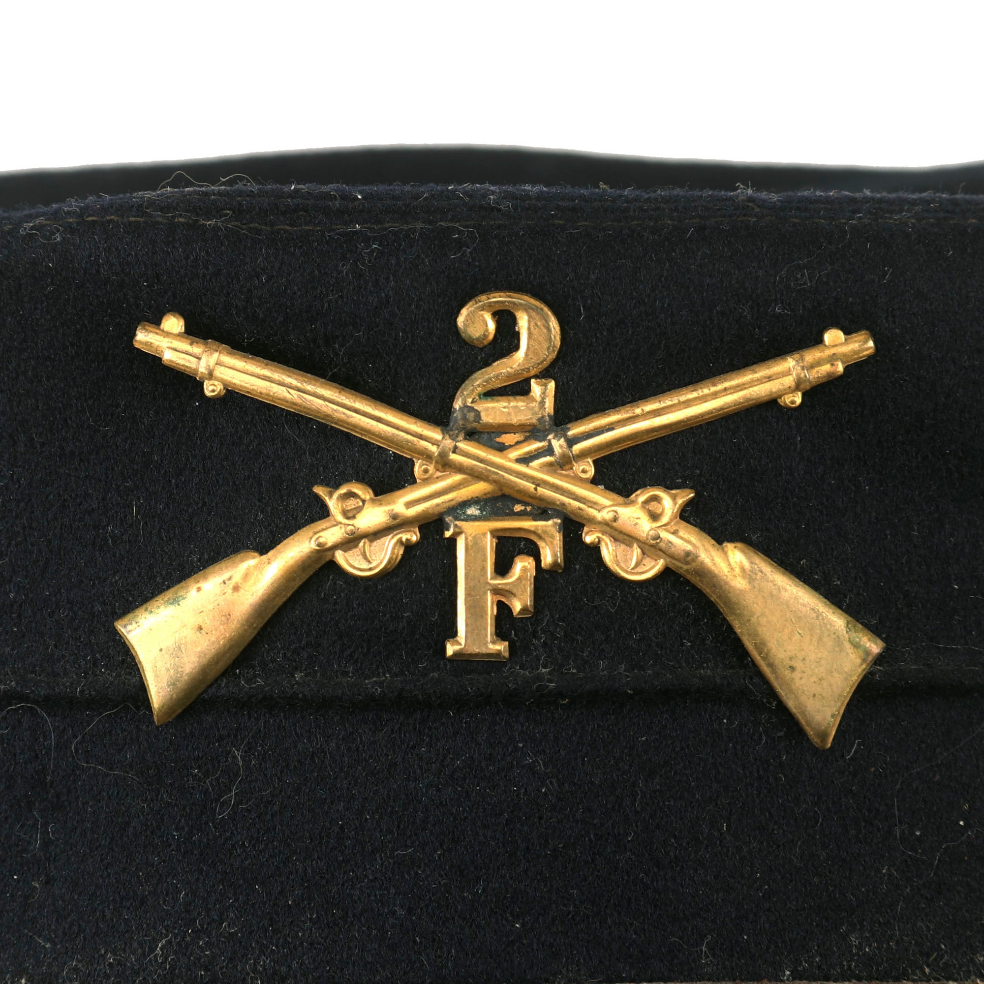 Original Item. Only One Available. This is a tremendous Spanish American War forage with a badge for Company F of the 2nd Infantry Regiment, which fought valiantly at the Battle of Santiago in Cuba, and in over 25 engagements in the Philippines during the Insurrection from 1900-1903. The cap is in great overall condition with a few minor flaws. This was the U.S. Army's first transition to a visor cap after leaving the traditional kepi design.