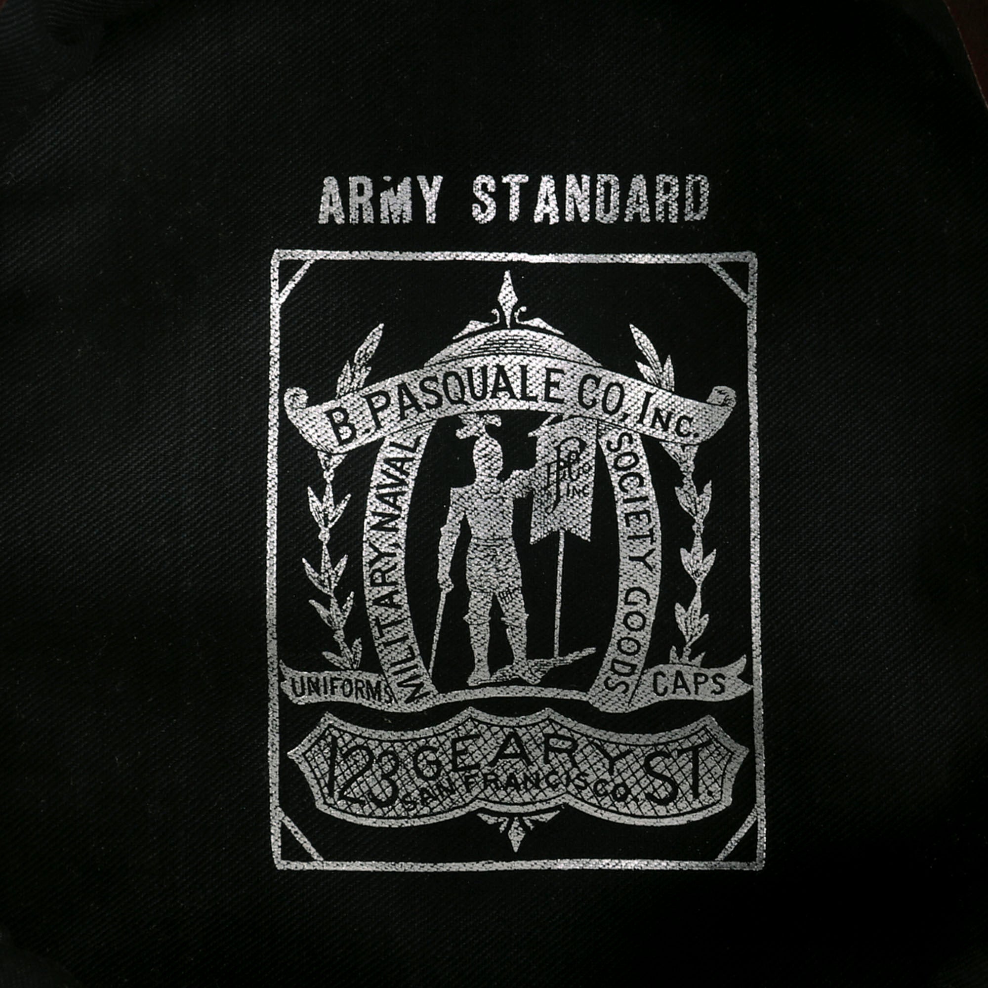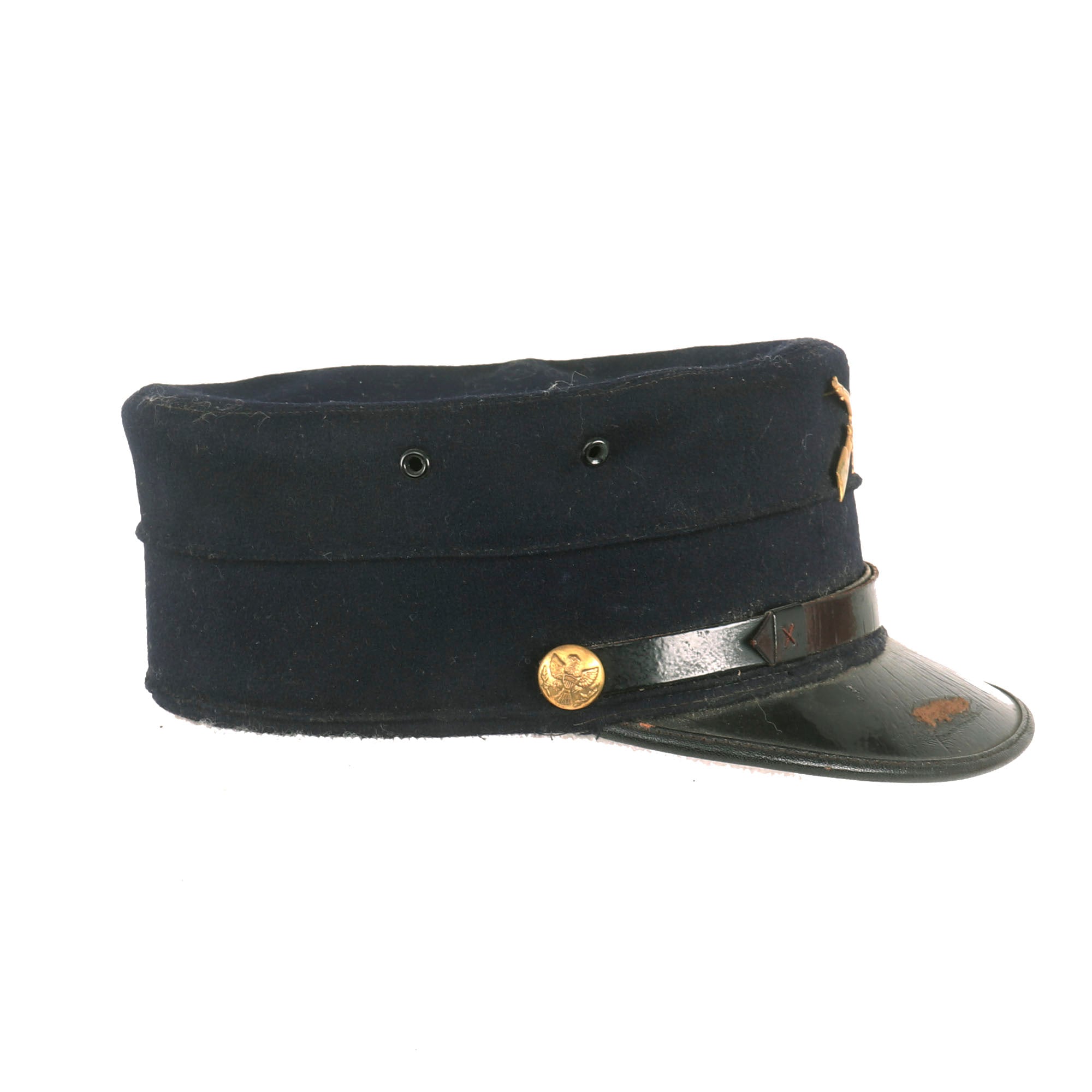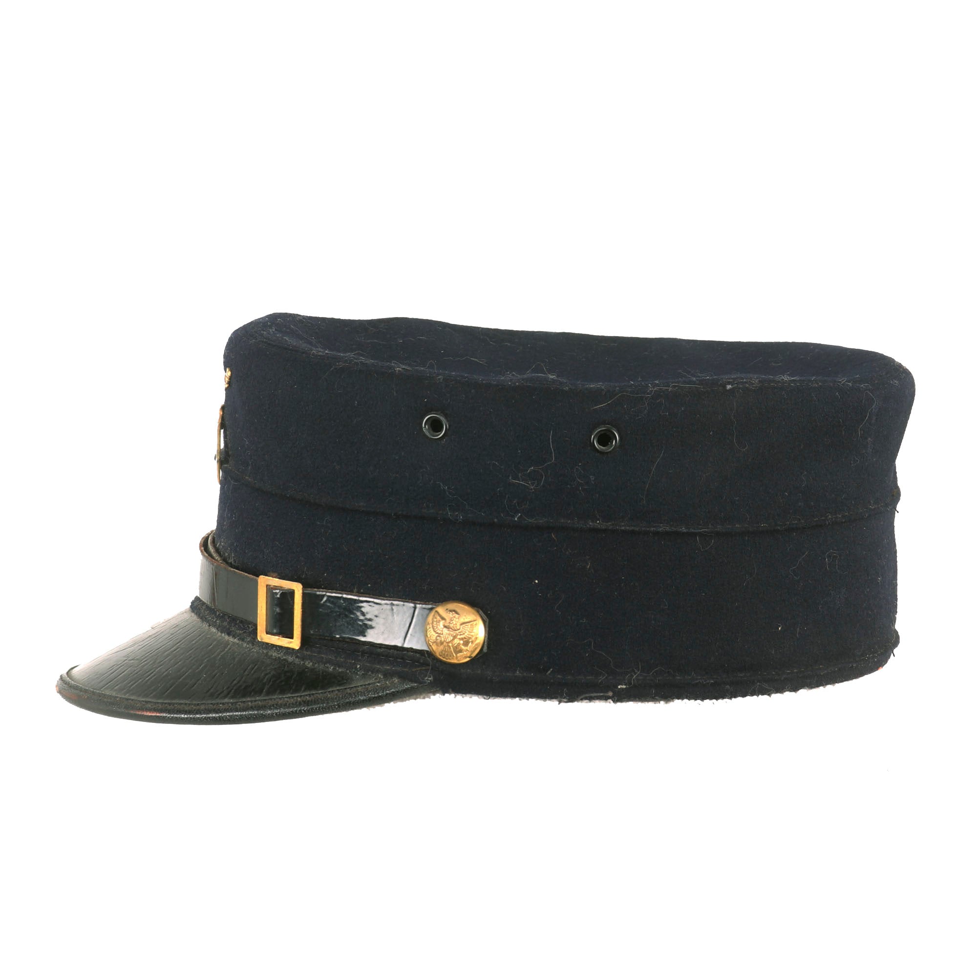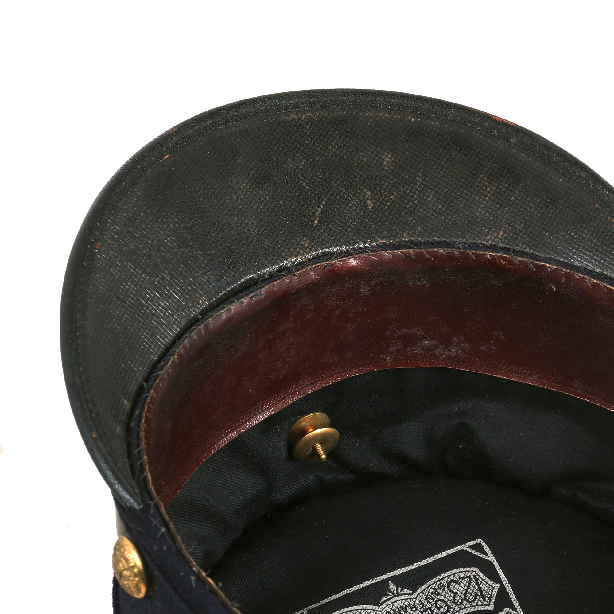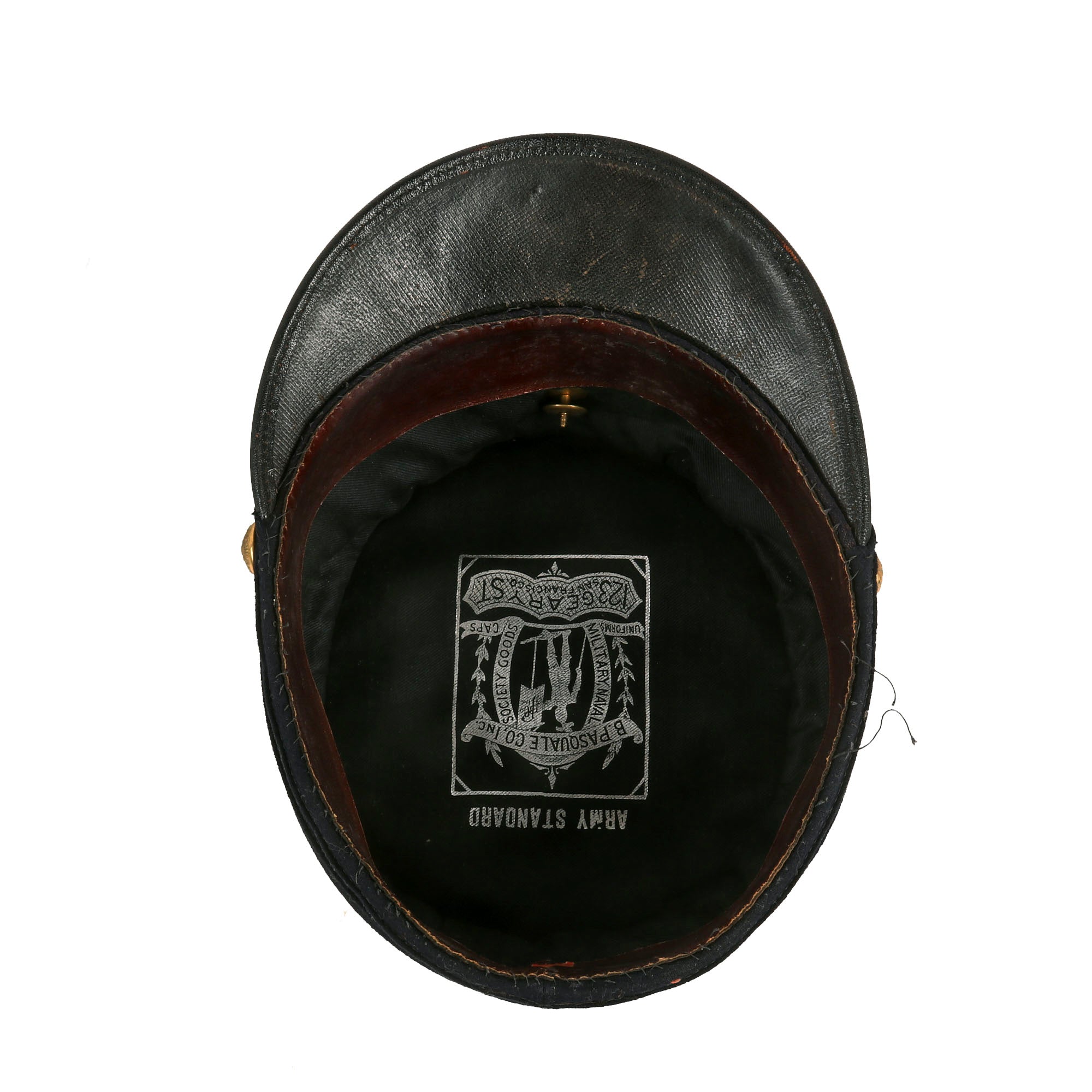 The cap is made of dark blue wool with enameled leather visor bound with patent leather, and a tarred leather chinstrap held in place by 2 gold gilt federal regulation eagle buttons. The cap retains its full russet brown leather sweatband, although the stitching has begun to come undone in spots. There is a Size sticker for 6⅜ and on the black silk lining is a maker’s stamp for B. PASQUALE 123 GEARY ST, SAN FRANCISCO, which was a popular maker in California around the turn of the century. The 2nd Infantry badge is affixed to the front of the cap via a screwback which is visible on the interior. There is scattered moth tracking across the crown, but it is barely visible. The only serious damage is a spot on the visor where the finish has been warped and it appears brown.